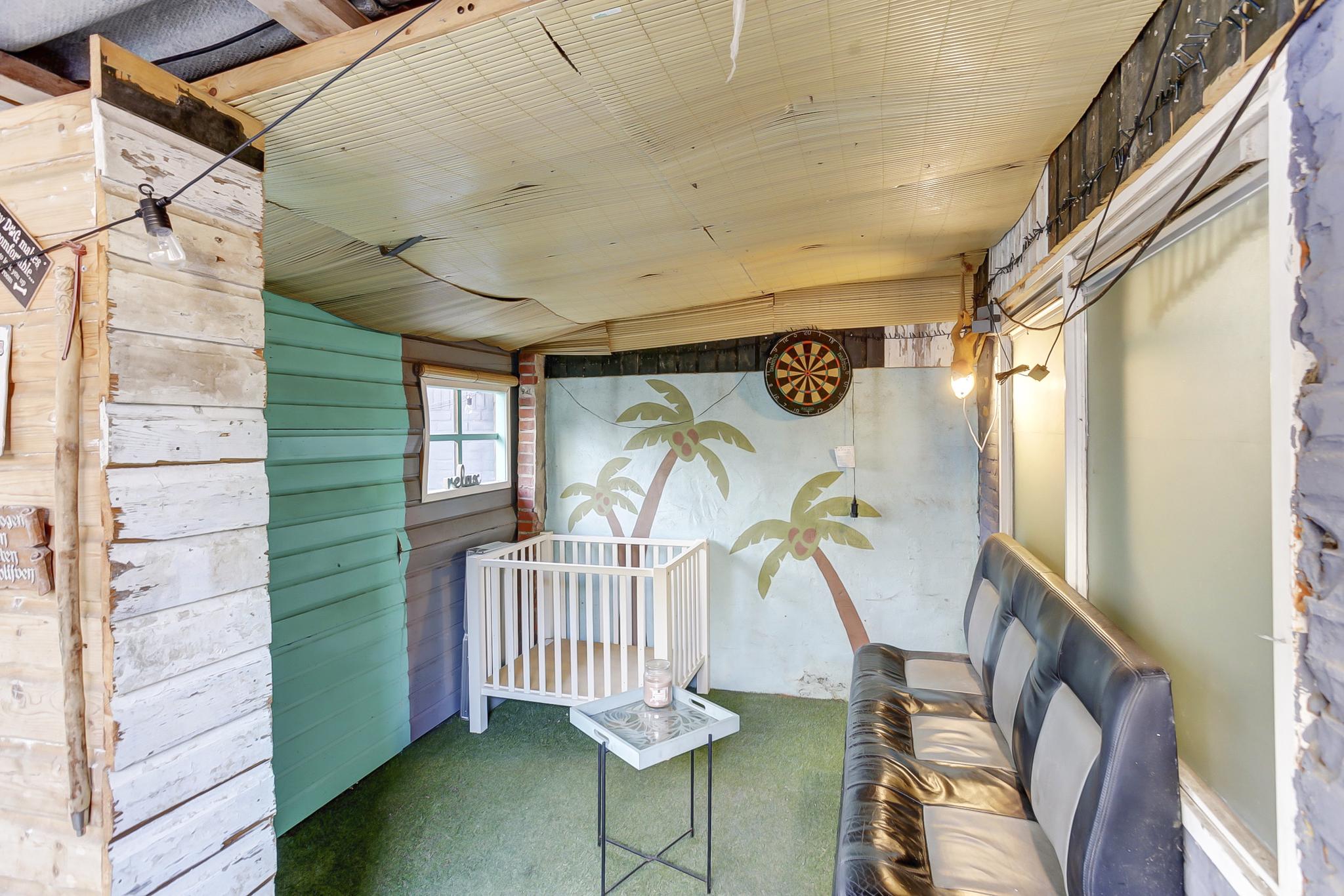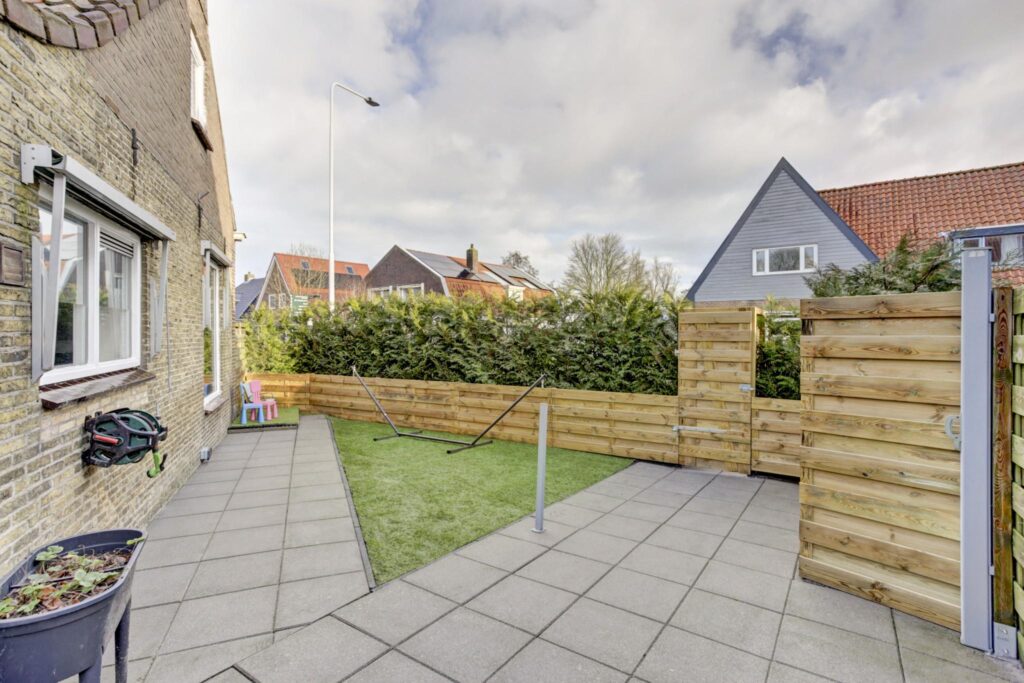 Verzorgde zonnige tuin rondom, terras, nieuwe schutting, sfeervol tuinhuis en een stenen berging/garage voor opslag/hobby's.