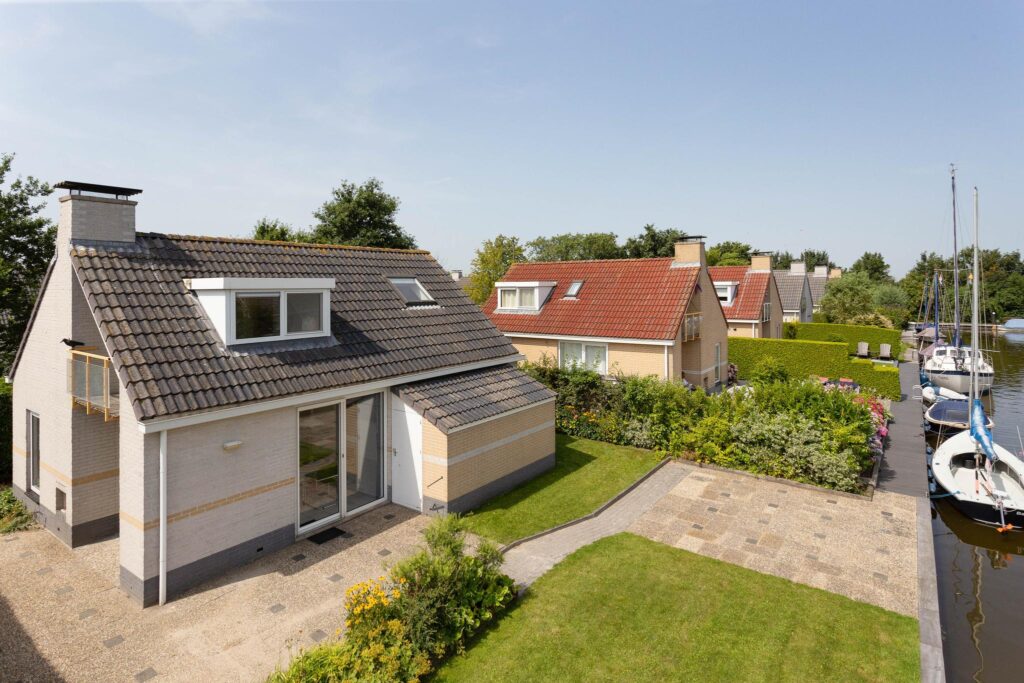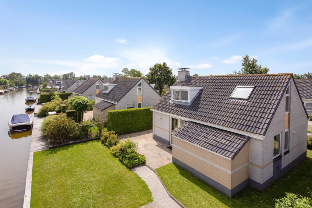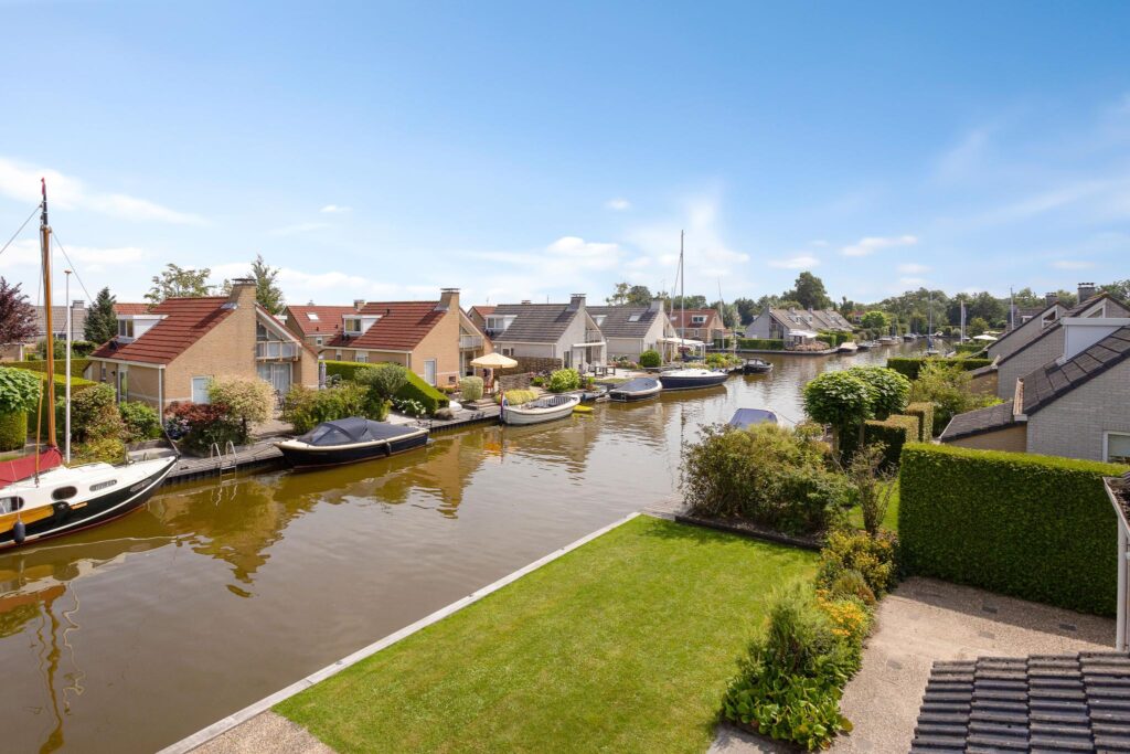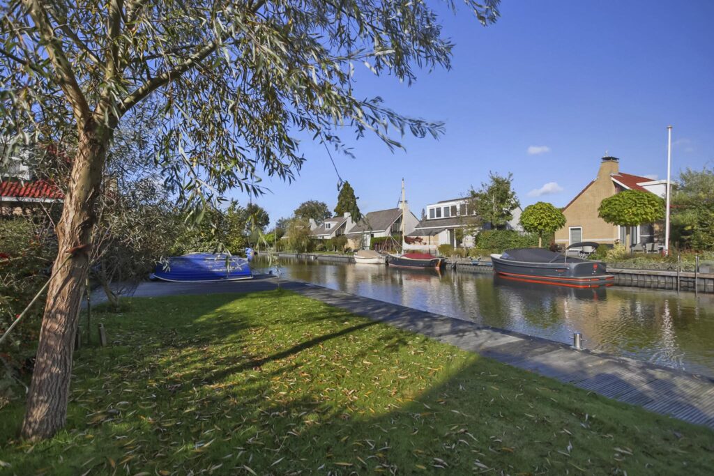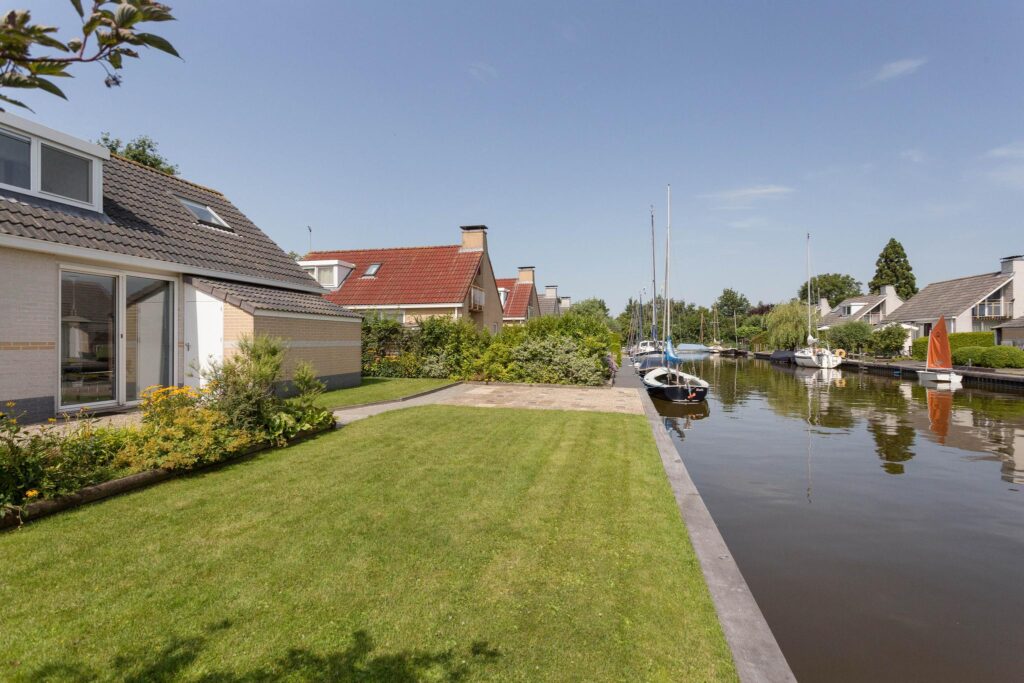 Zonnige tuin met veel privacy. Aan de waterzijde is een bestraat terras. Een openhaard aan de zijgevel. De kavel heeft aan weerszijden fraaie groene hagen en is verder ingericht met gazon en borders. Langs het water 15 meter aanlegplek voor boten. Steiger en oprit voor een boottrailer (staan niet op de foto). Vanuit de tuin is er prachtig uitzicht over breed vaarwater!