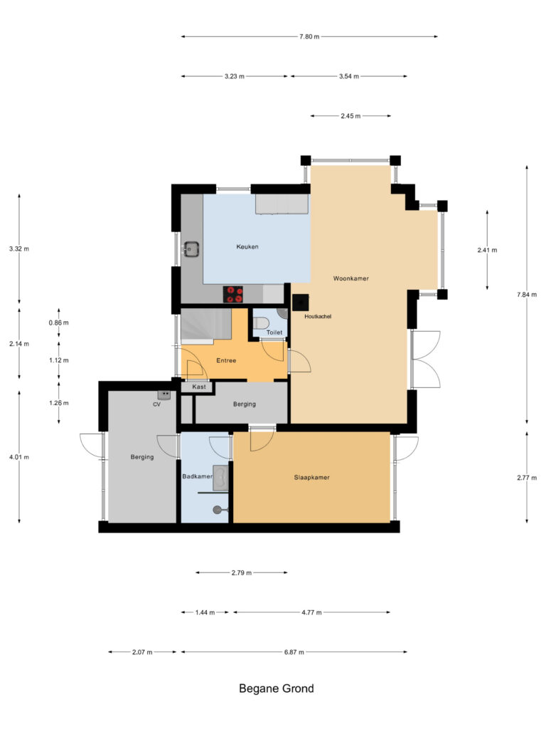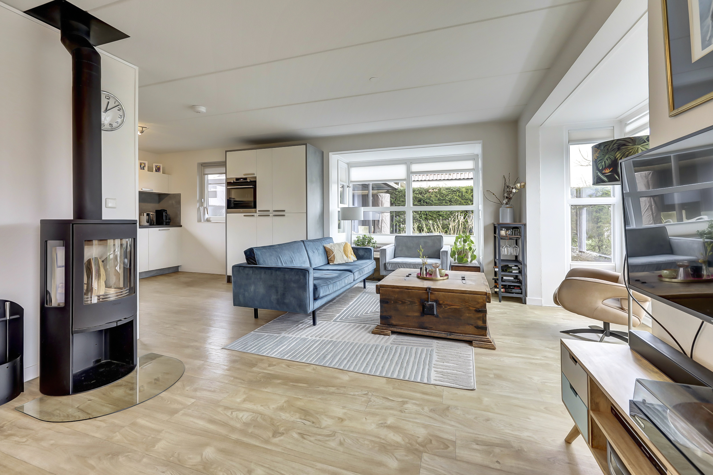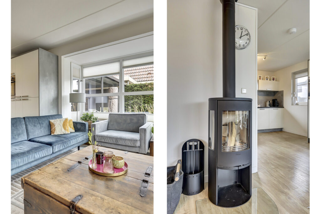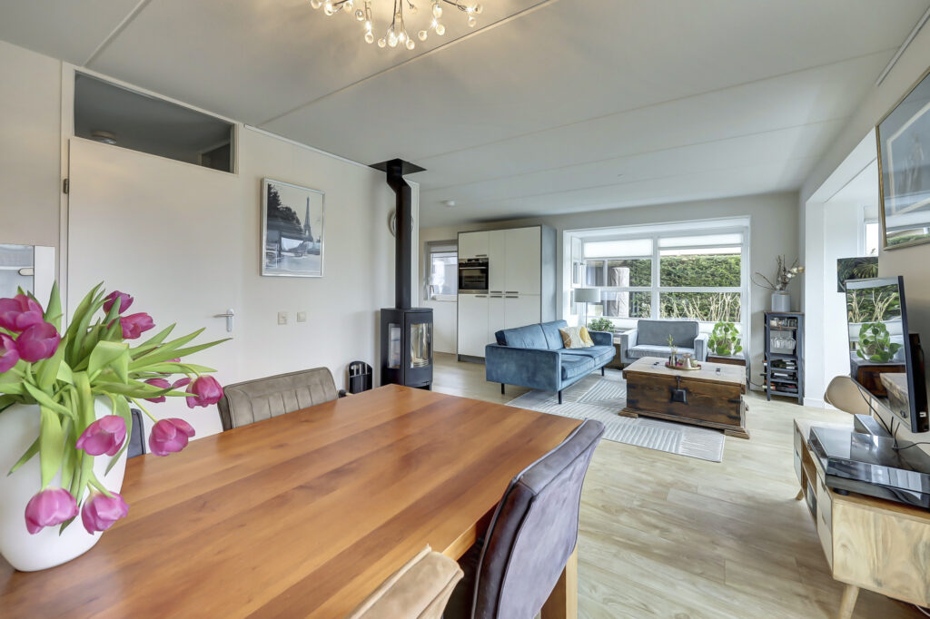 Entree, ruime hal, modern toilet, ruime lichte living met dubbele erker, openslaande tuindeuren en een houtkachel van 2022, moderne u-vormige keukenopstelling met voldoende kastruimte, diverse korflades, inbouwapparatuur en een boiler. De gehele begane grondvloer is uitgerust met een pvc-vloer voorzien en vloerverwarming in de woonkamer. Tussenruimte met garderobe en opstelplaats witgoedapparatuur. Ruime slaapkamer op de begane grond met aansluitend een eigen badkamer; wastafelmeubel en een inloopdouche. Inpandige berging met tuindeur. Deze ruimte wordt momenteel gebruikt als werk/hobbyruimte.