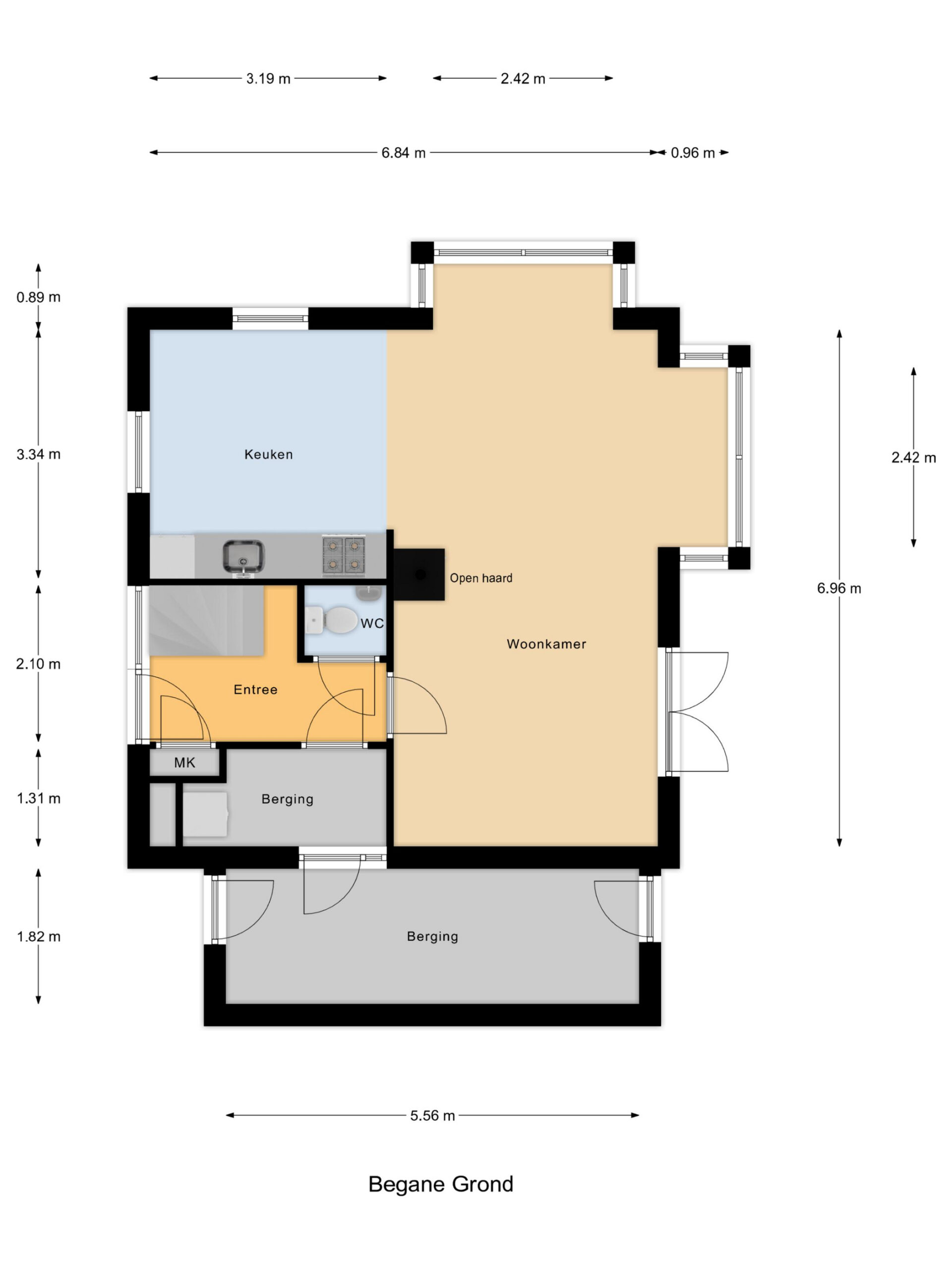 Entree, hal, toilet, tussenhal met opstelplaats witgoed apparatuur en toegangsdeur naar de ruime berging aan de zijkant van de woning. De berging is uitgerust met een tuindeur en elektra. Ruime lichte living voorzien van dubbele erker, openslaande tuindeuren, houtkachel, een moderne keukenopstelling met voldoende kastruimte, diverse korflades en inbouwapparatuur. Aan de voorzijde is een ruime berging voorzien van openslaande deuren.