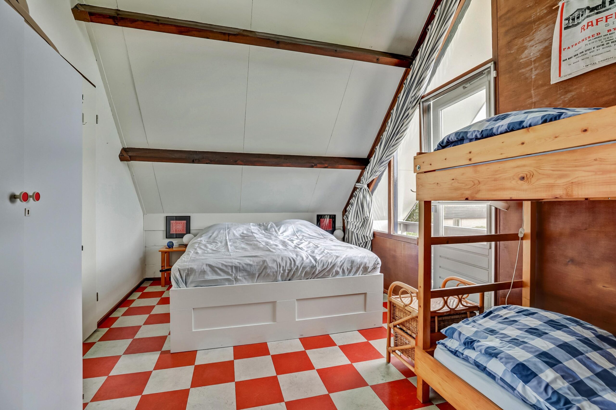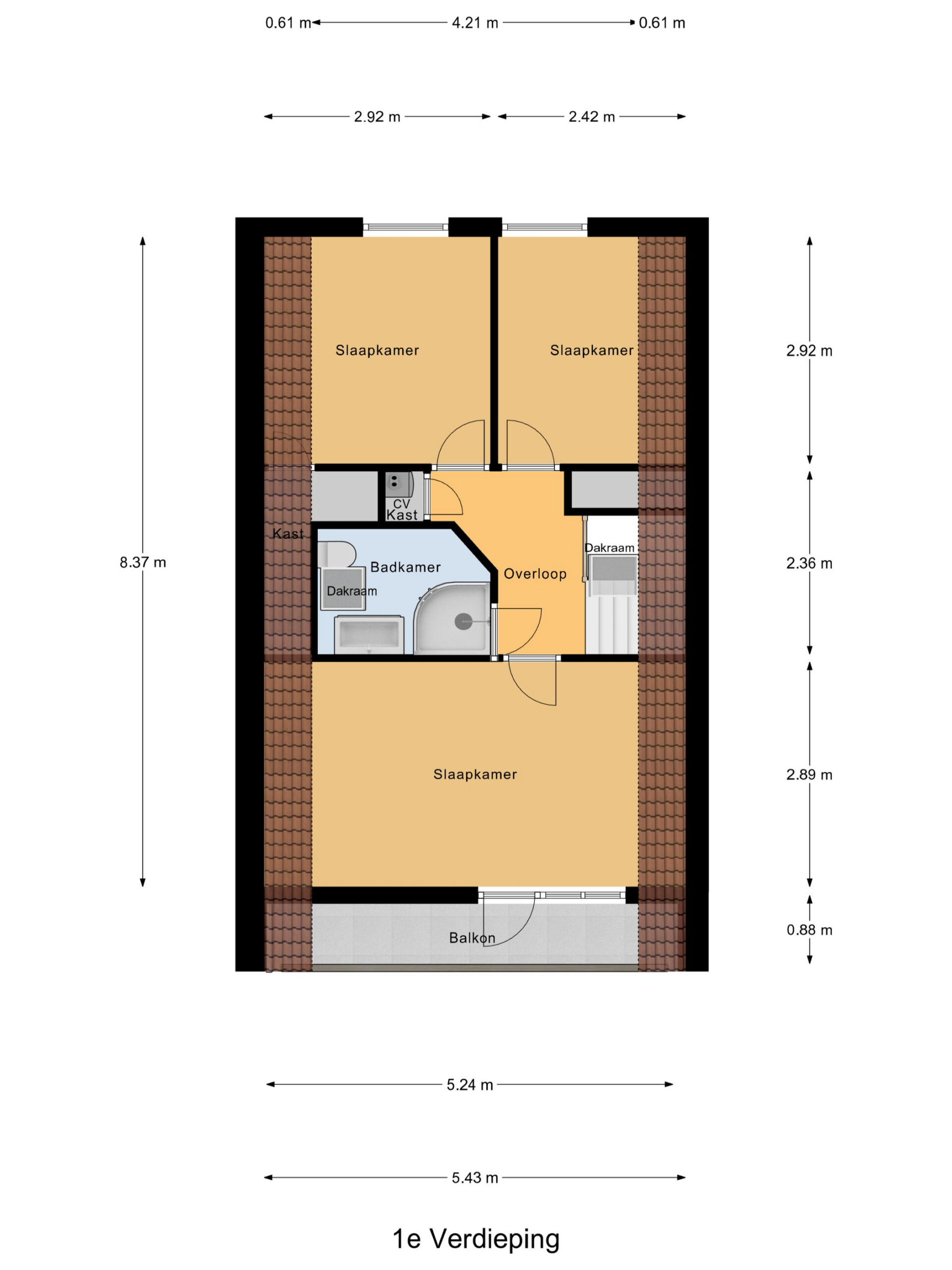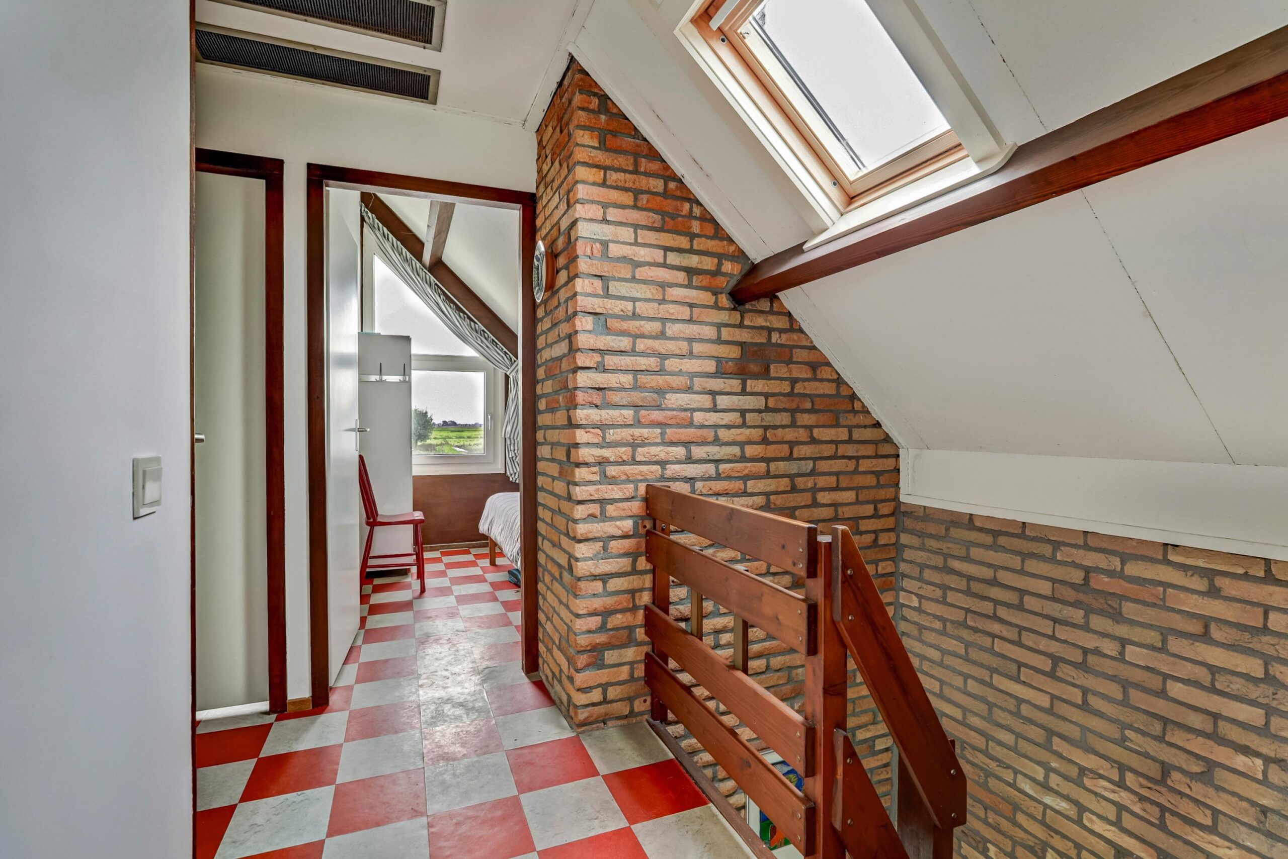 Overloop voorzien van een dakraam, 3 slaapkamers, waarvan een ruime slaapkamer met een overdekt balkon.