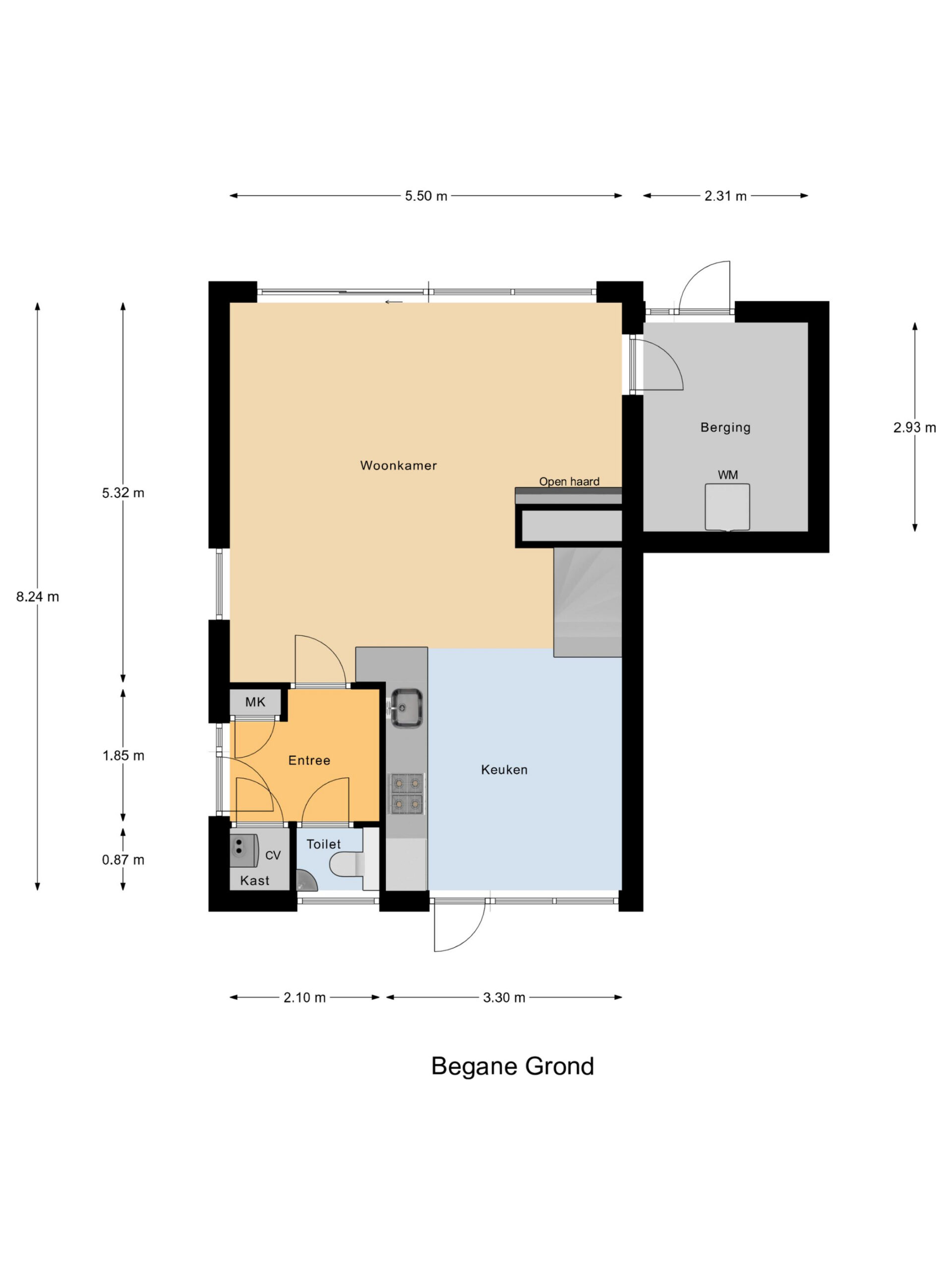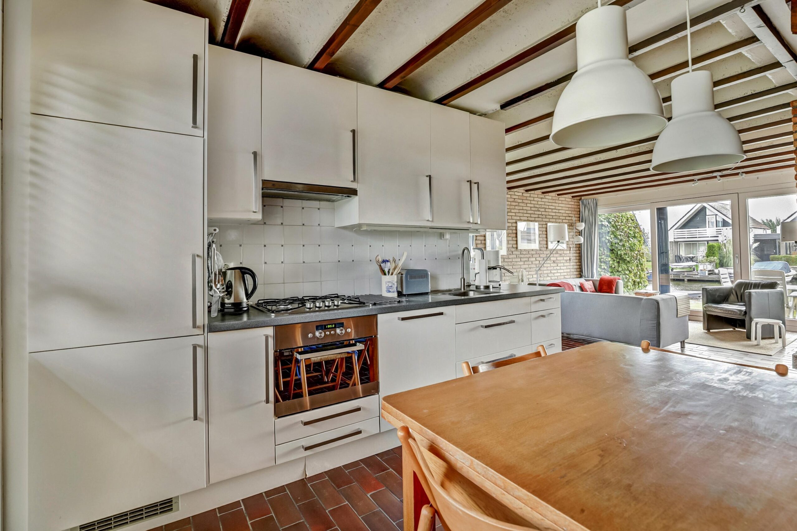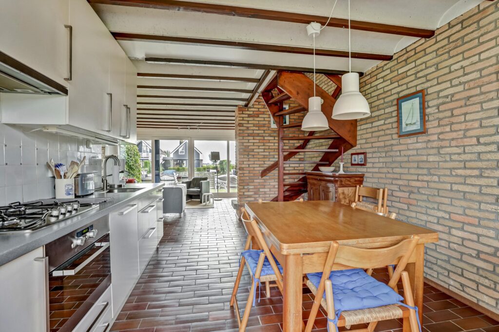 Zijentree, toiletruimte, garderoberuimte, sfeervolle lichte ruime woonkamer met openhaard en een riante schuifpui naar het terras. Vanuit de de woonkamer kan men genieten van een prachtig weids uitzicht richting de Woudsender Rakken, doorgaande vaarwater richting het Heegermeer en het Slotermeer. De gehele begane grondvloer is uitgerust met fraaie plavuizen. Moderne keuken inclusief diverse inbouwapparatuur, waaronder een gaskookplaat met afzuigkap, vaatwasser, koel/vries combinatie, inbouw oven/magnetron. Vanuit de living is een ruime inpandige berging bereikbaar met o.a. opstelplaats t.b.v. witgoedapparatuur, kraan, tuindeur en overdekte luifel.