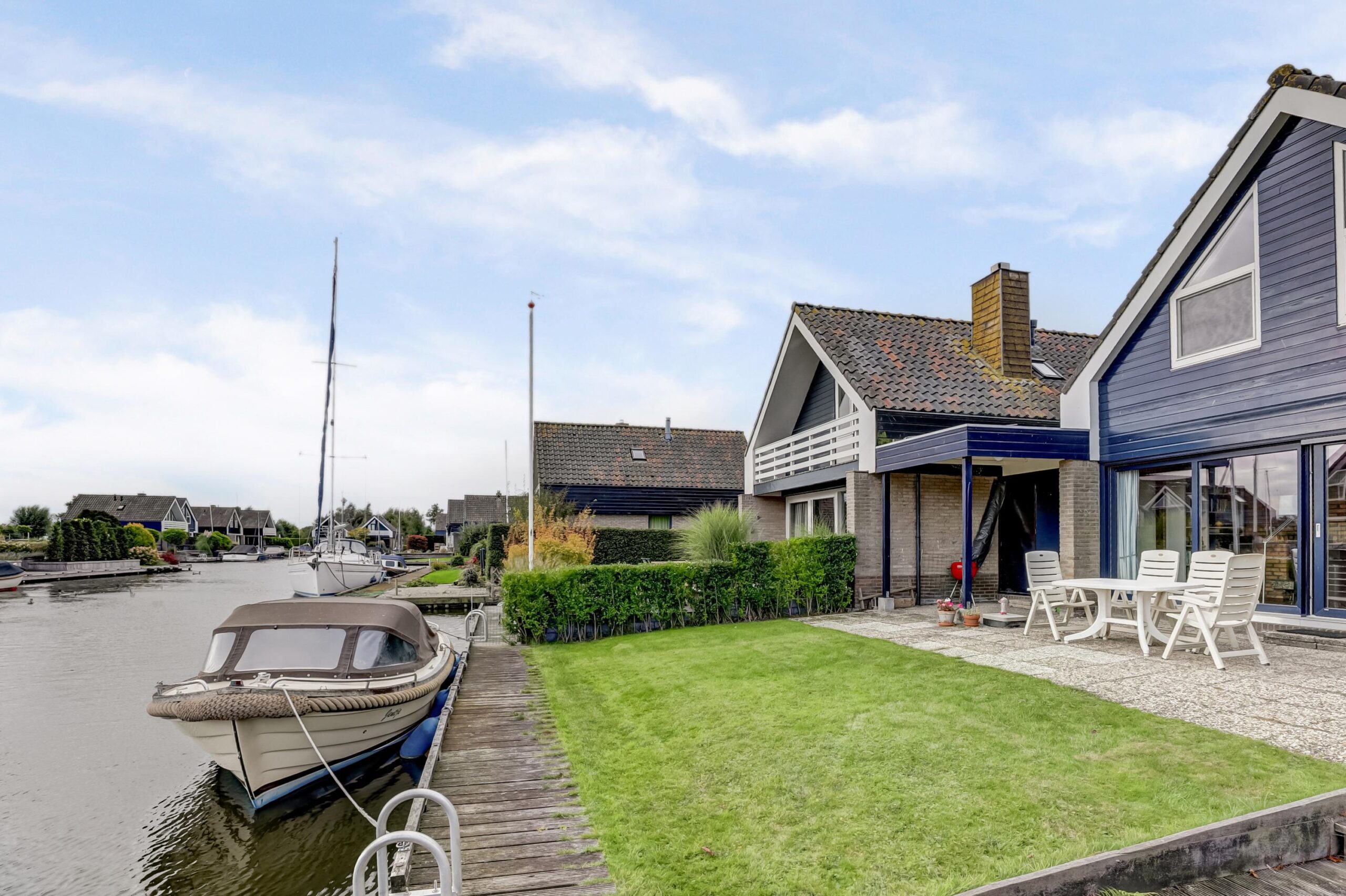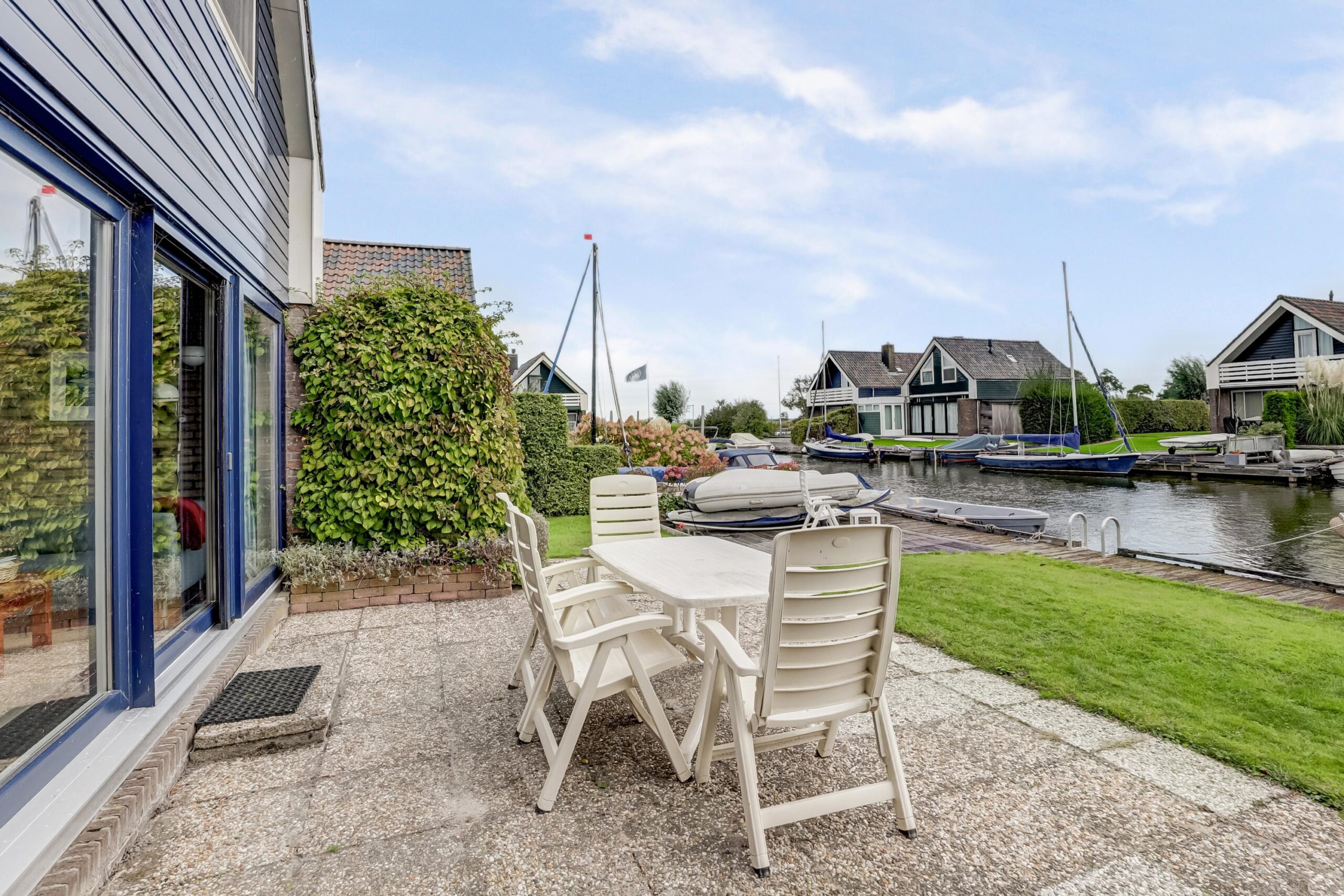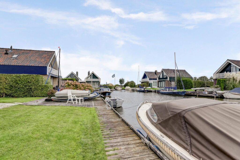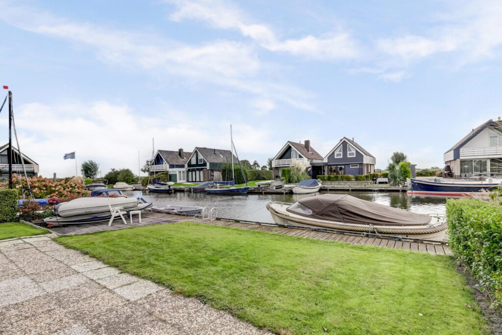Rondom is een verzorgde tuin met een groot terras, looppad, terras aan de voorzijde, een ruime parkeermogelijkheid op eigen terrein, eigen aanlegplaats van maar liefst 13 meter lengte, gazon, diverse bloeiende borders, buitenverlichting.