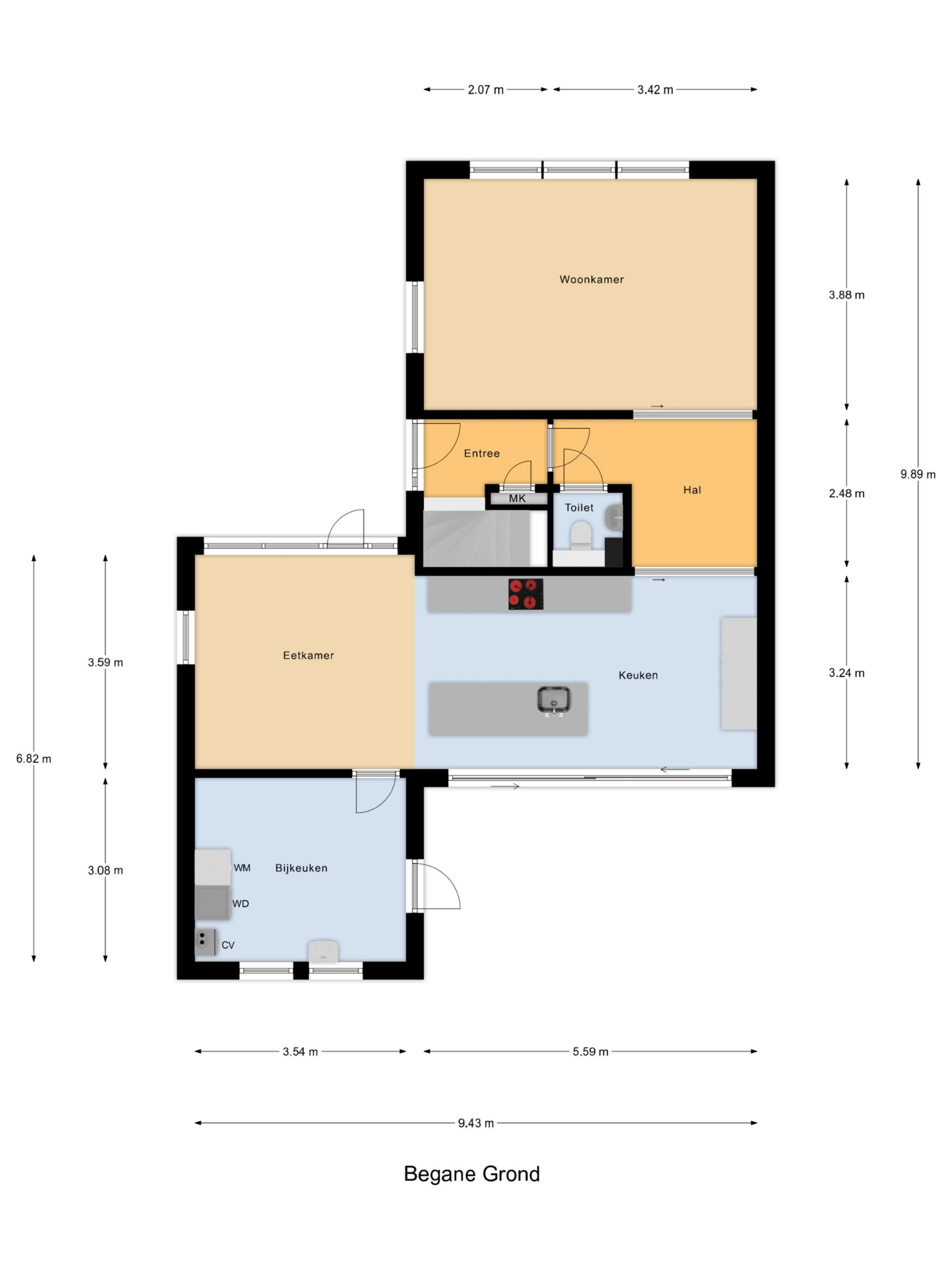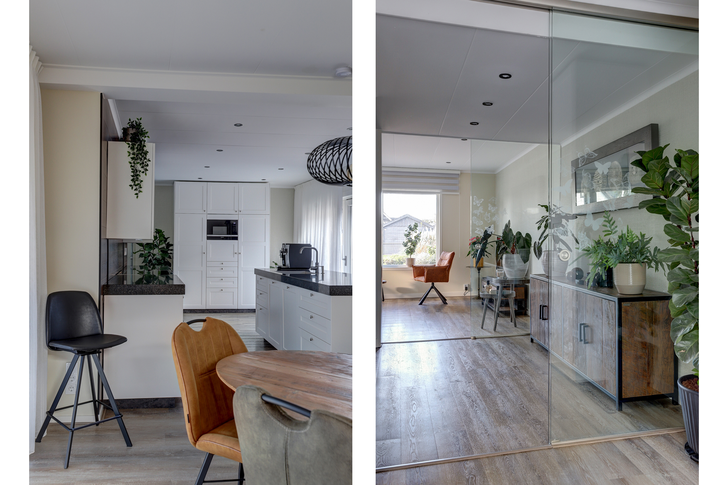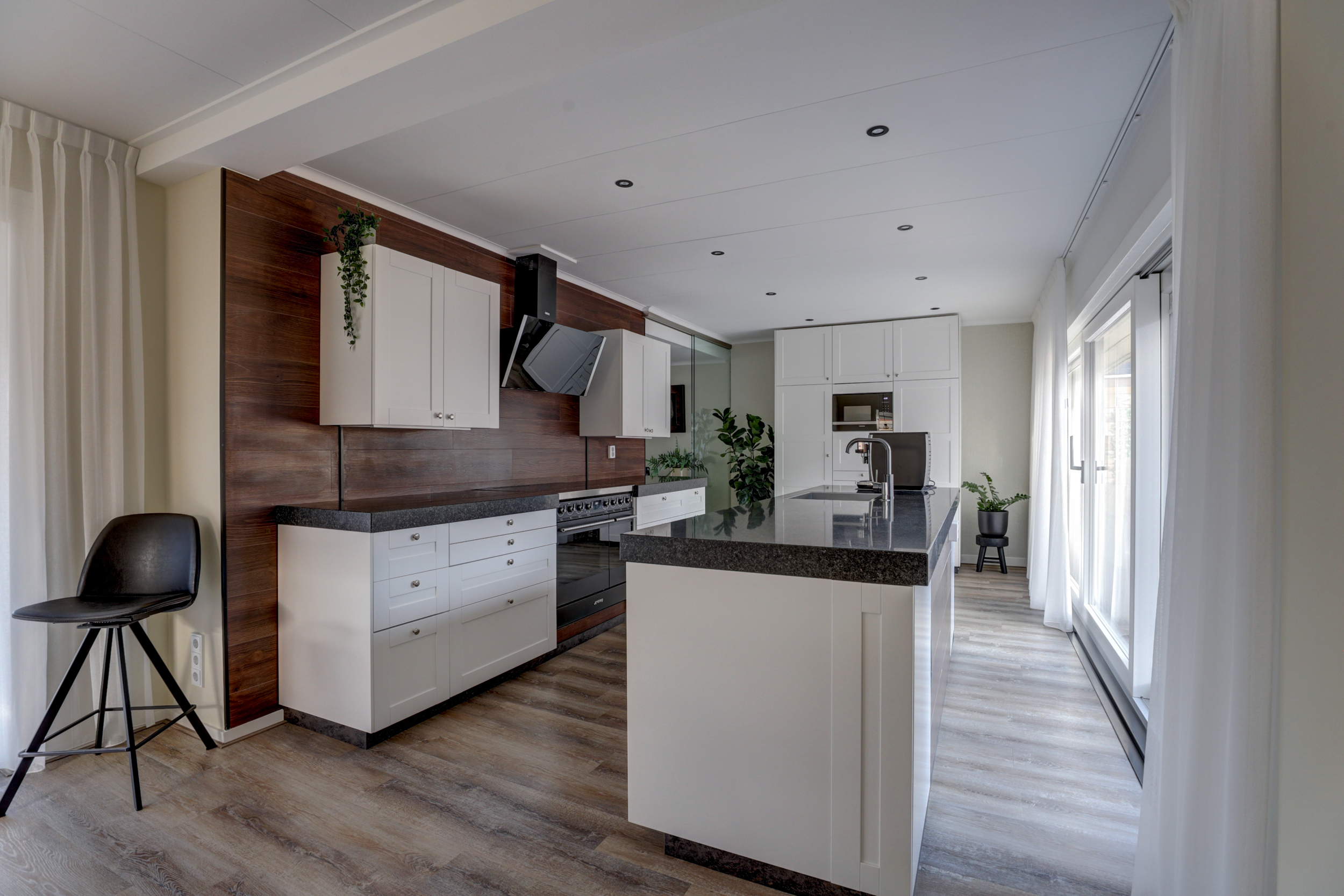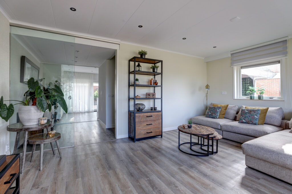 Overdekte zijentree, royale hal, vrijhangend toilet met fonteintje, glazen toegangsdeuren naar de leefkeuken en de woonkamer. Aan de voorzijde is de lichte woonkamer gesitueerd met fraaie raampartijen en een zijraam. De gehele begane grondvloer is uitgevoerd met een fraaie pvc vloer en vloerverwarming. Fraaie gestuukte wanden en plafonds met diverse spots. De riante leefkeuken aan de tuinzijde is uitgevoerd met een riante kunststof schuifpui naar het terras en een ruime eet/zithoek met een zijraam. De Leefkeuken is uitgevoerd met een spoeleiland en een natuurstenen aanrechtblad, korflades en diverse inbouwapparatuur, waaronder; afzuigkap, oven, magnetron, koelkast, vaatwasser en een close-inn boiler. Aansluitend is een grote bijkeuken met spoelbak en opstelplaats witgoed/apparatuur, Atag HR combiketel.
