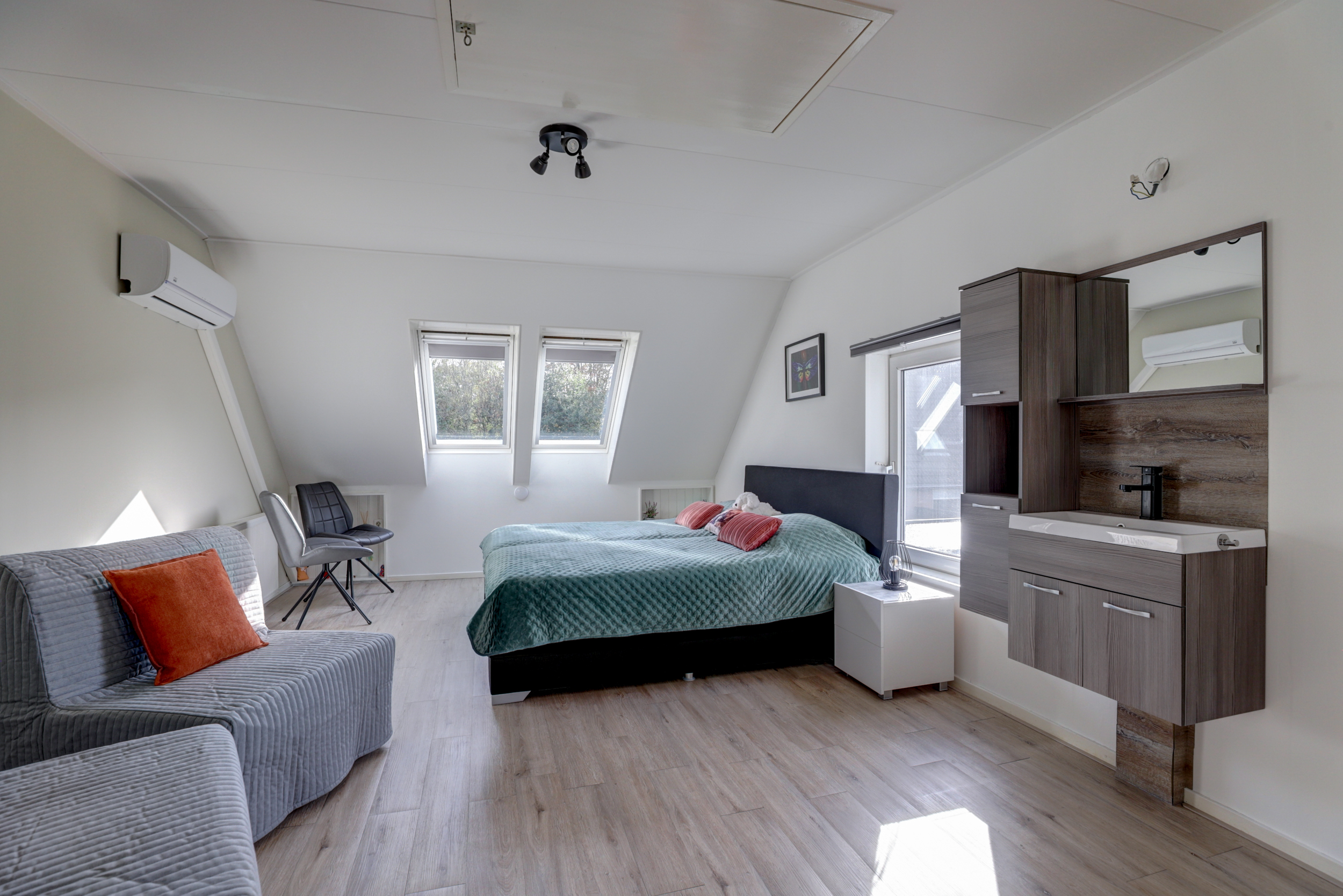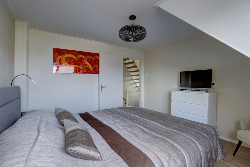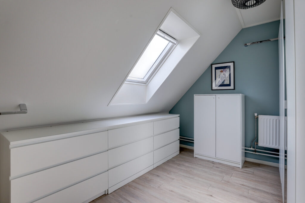 Overloop met veel lichtinval. Er zijn vier slaapkamers aanwezig, waarvan een grote ouderslaapkamer met een vaste kast, dakramen en een wastafelmeubel en een ruime slaapkamer met een dakkapel aan de voorzijde.