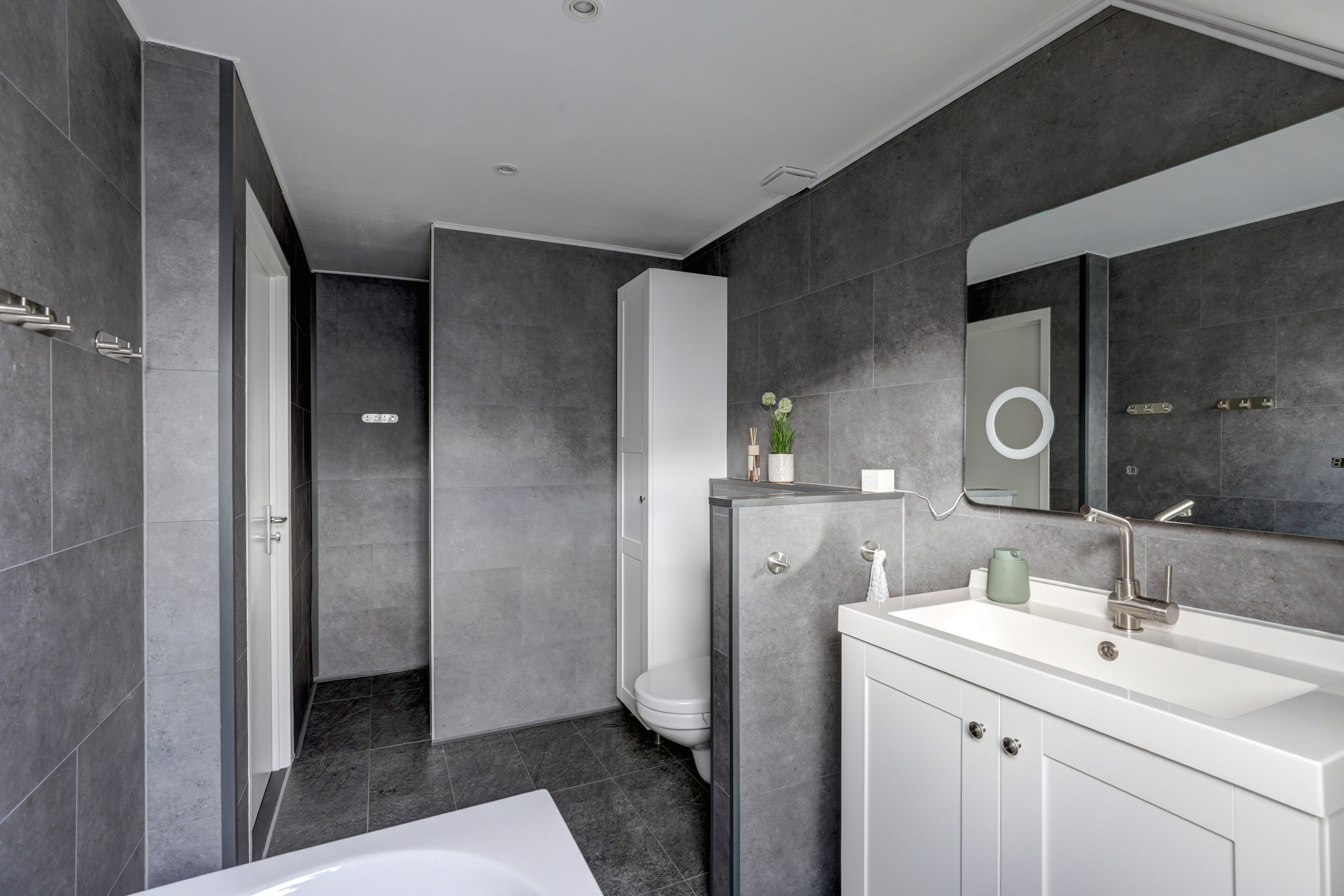 Moderne complete badkamer met een inloopdouche, wastafelmeubel, ligbad en toilet.