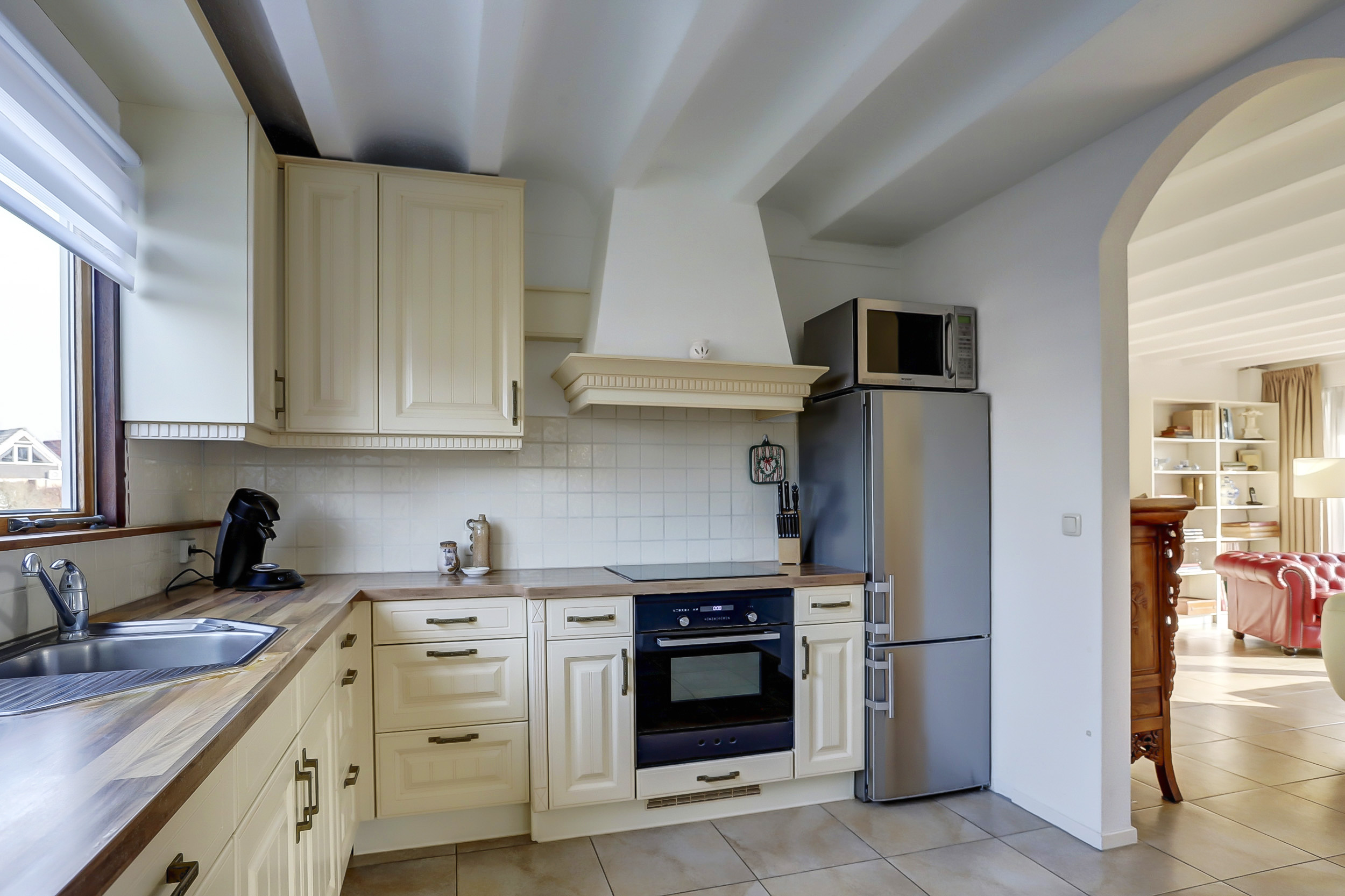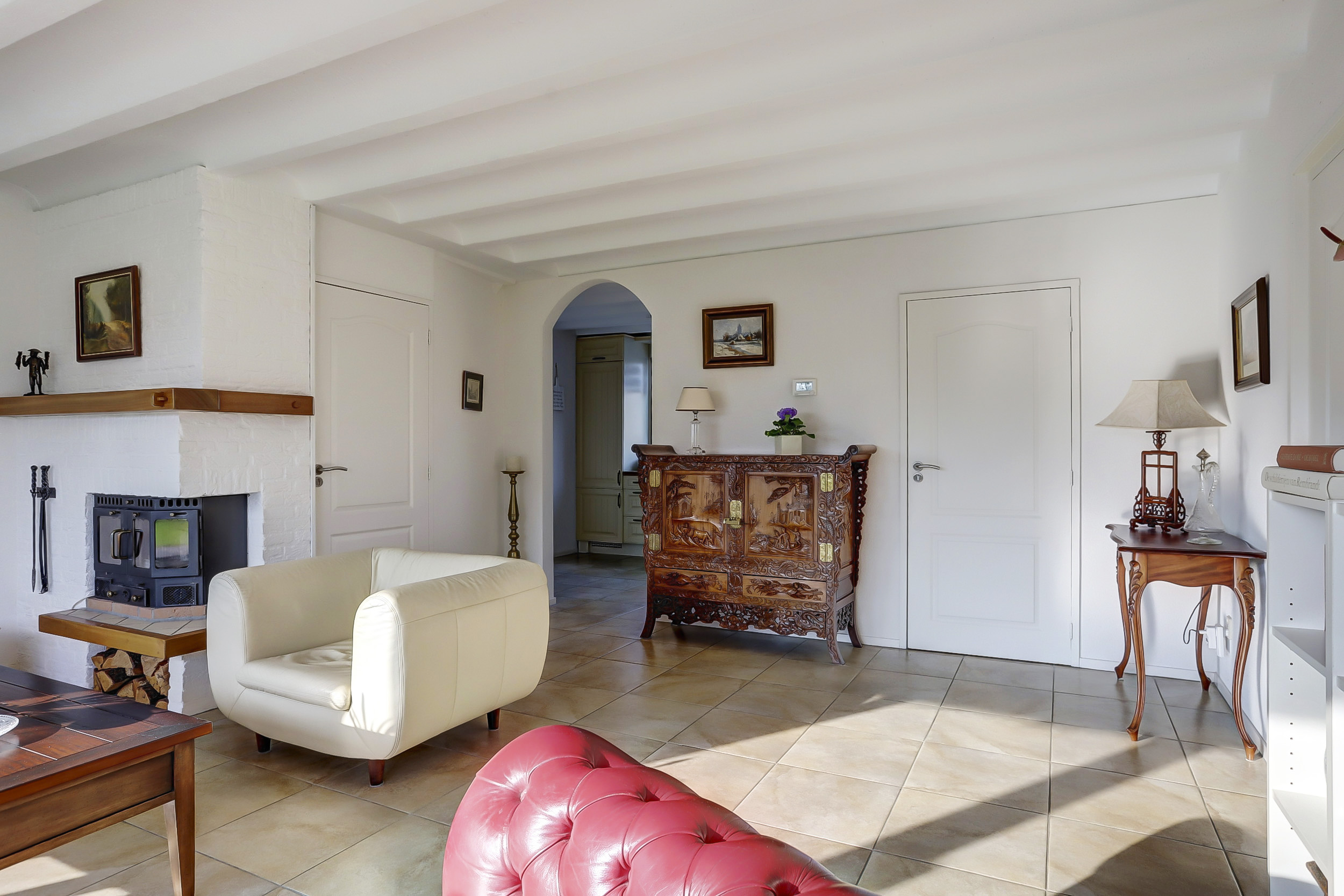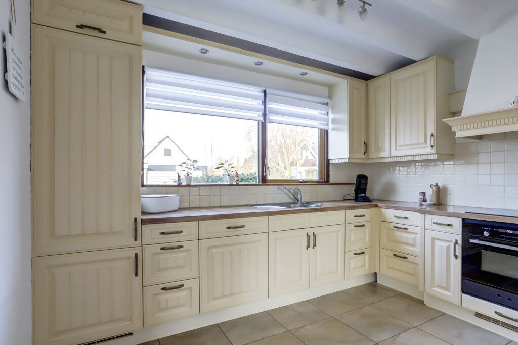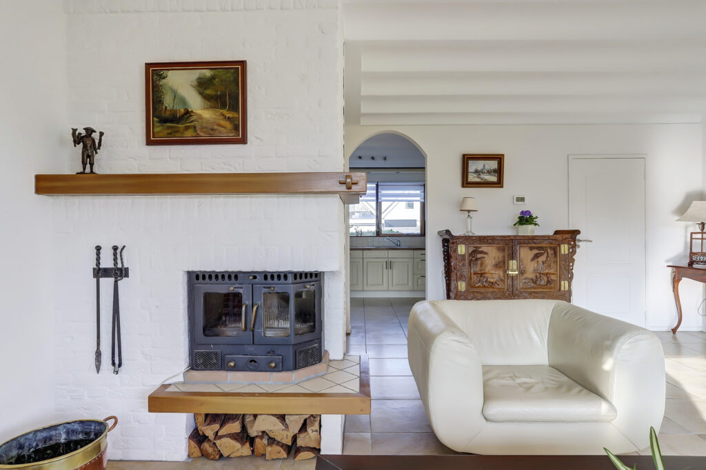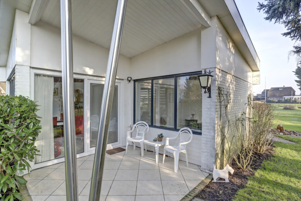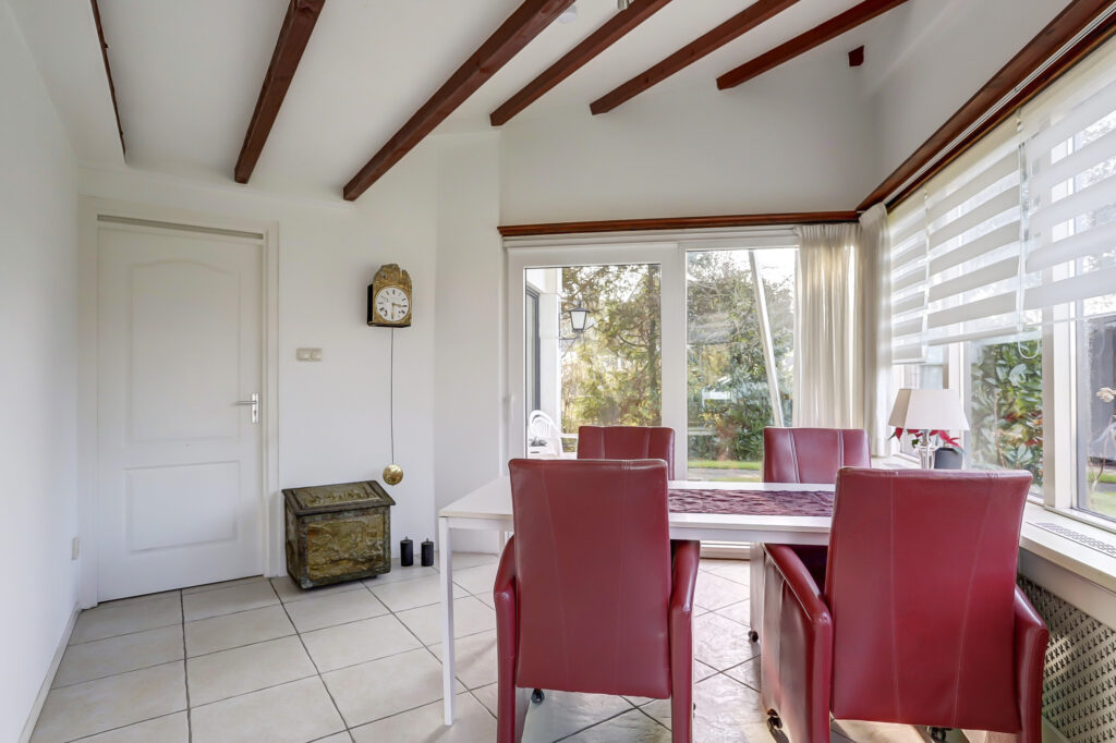 Zijentree met overdekte luifel, hal met garderobe ruimte, vrijhangend toilet met fonteintje, royale lichte woonkamer voorzien van een schuifpui naar een riant bestraat terras, houtkachel. De gehele living op de begane grond is uitgevoerd met een plavuizen vloer. De living, keuken en badkamer op de begane grond zijn voorzien van vloerverwarming. De keuken aan de voorzijde en beschikt over een l-vormige keukenopstelling met diverse inbouwapparatuur; inductiekookplaat met afzuigkap, oven, magnetron, vaatwasser en koelkast. Vanuit de keuken is een doorgang naar de eet/zithoek voorzien van een kunststof schuifpui met overdekt terras. Aansluitend is een kantoor/werkruimte met een tuindeur. Deze kamer is tevens geschikt is als slaapkamer/praktijkruimte. Naast de woonkamer is een ruime slaapkamer met schuifwandkast, tuindeur, mobiele airconditioning en een eigen badkamer voorzien van een douchecabine, wastafelmeubel, vrij hangend toilet, designradiator.