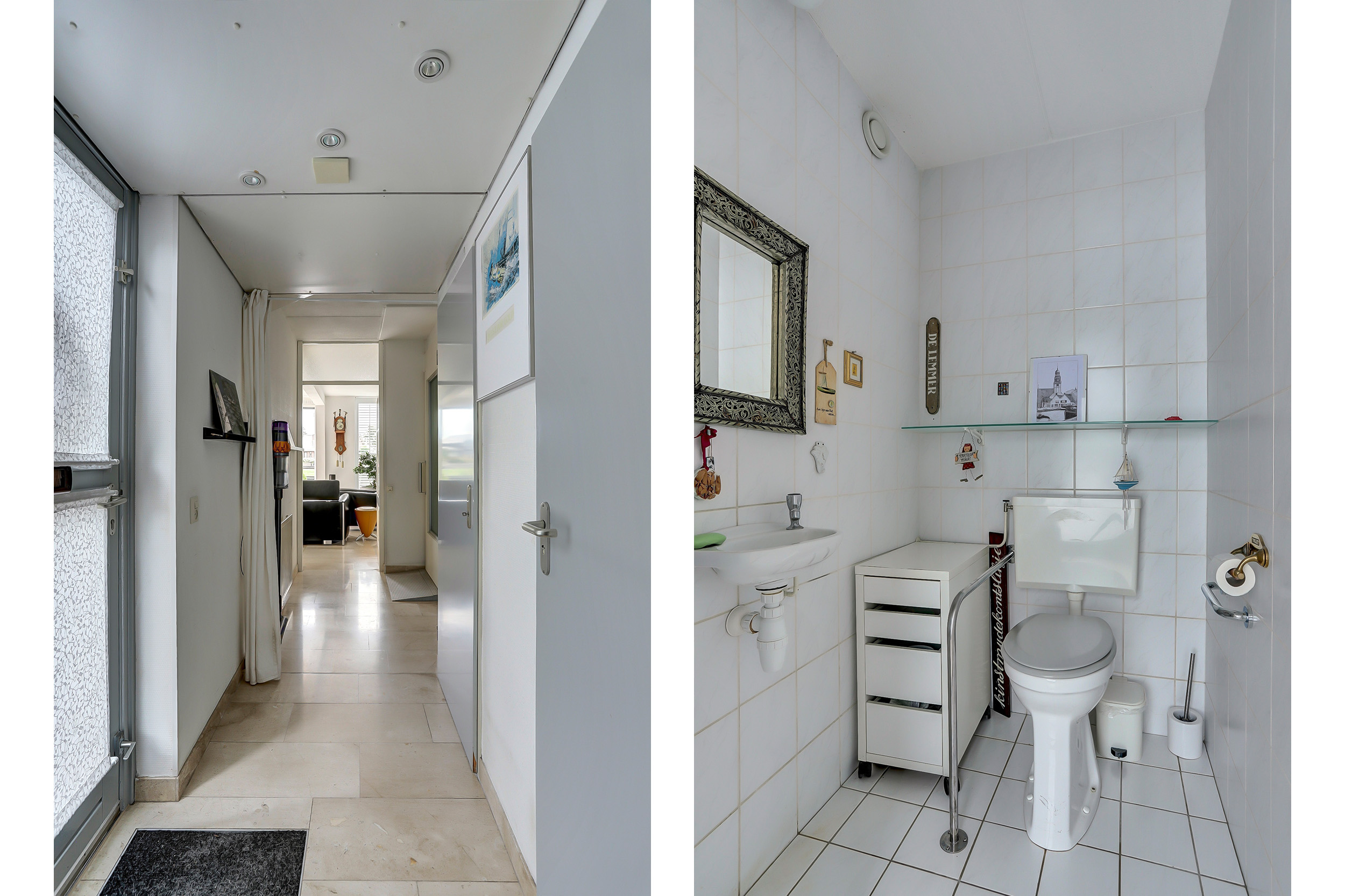 Zijentree, hal, toilet meet fonteintje, inpandige berging met schuifwandkasten een buitendeur, moderne liftinstallatie, vaste kast en glazen (facet) toegangsdeur naar de woonkamer. De gehele begane grondvloer is uitgevoerd met een marmerenvloer voorzien van vloerverwarming, airconditioning, hoogwaardige en duurzame Tichelaar kachel met een aangename stralingswarmte (schone verbranding), hardhouten schuifpui naar het royale vlonderterras met elektrisch zonnescherm en looppad naar de steiger. U-vormige moderne Next 21 keukenopstelling met voldoende kastruimte en inbouwapparatuur; waaronder een oven, vaatwasser en koel/vries combinatie. De ramen aan de voorzijde (keukengedeelte) zijn uitgevoerd met shutters.