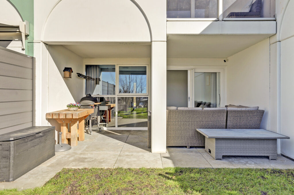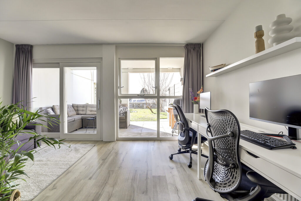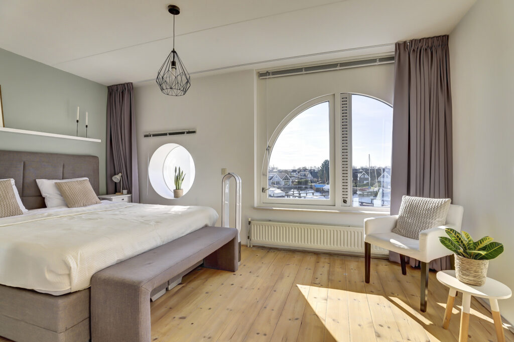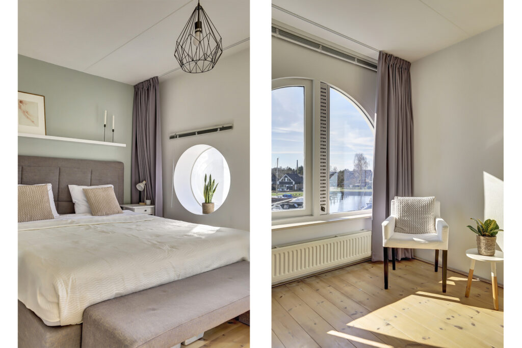 De woning op de begane grond is ingericht met een tuinkamer en een schuifpui naar de overdekte veranda. Al vroeg in het voorjaar kun je hier genieten van het uitzicht op de haven en met een eigen ligplaats voor de deur stap je zo in je eigen boot om te genieten van de vele prachtige vaarroutes. In de warme zomermaanden is dit een koele kamer en biedt de aangebouwde veranda voldoende beschutting. Grenzend aan de tuinkamer is een complete moderne badkamer; inloopdouche, wastafel meubel en vrijhangend toilet en een ruime inpandige berging. De tuinkamer is hierdoor tevens geschikt als slaapkamer, werkruimte, praktijkruimte aan huis.