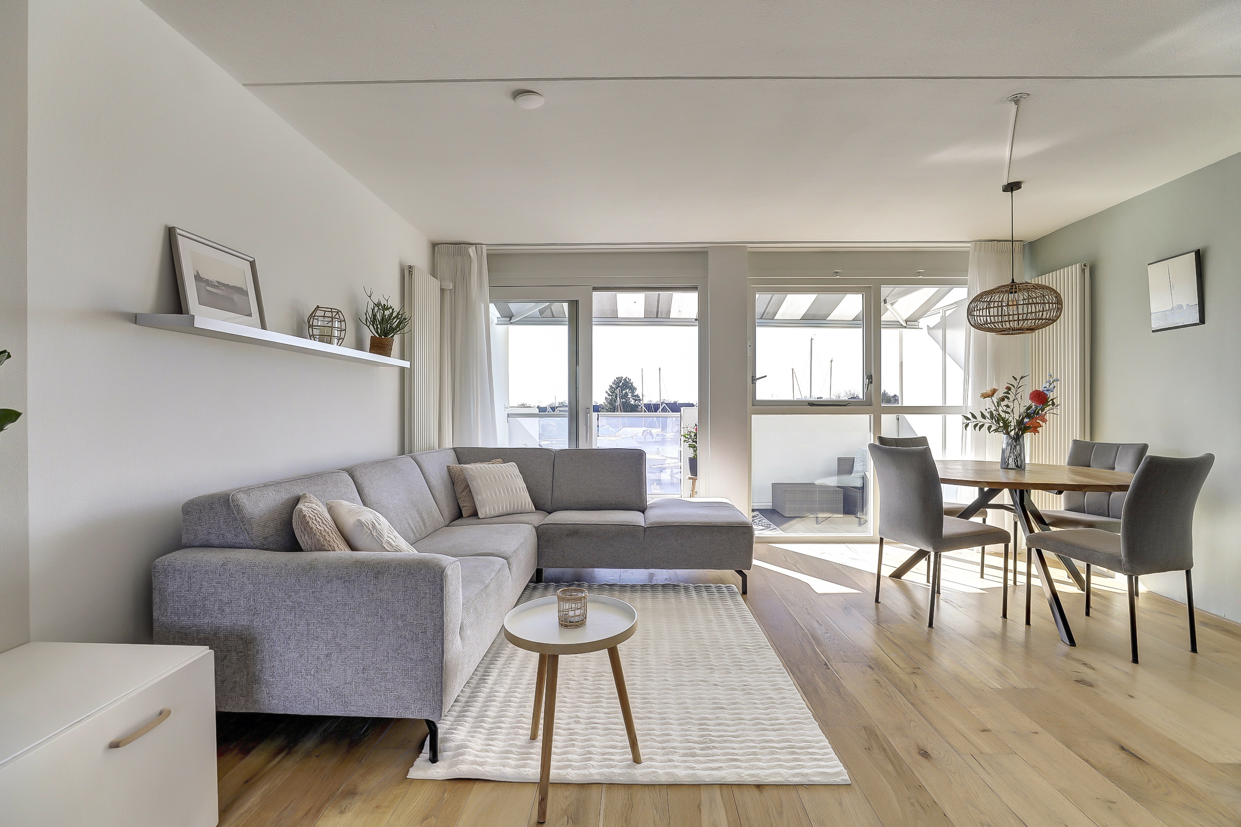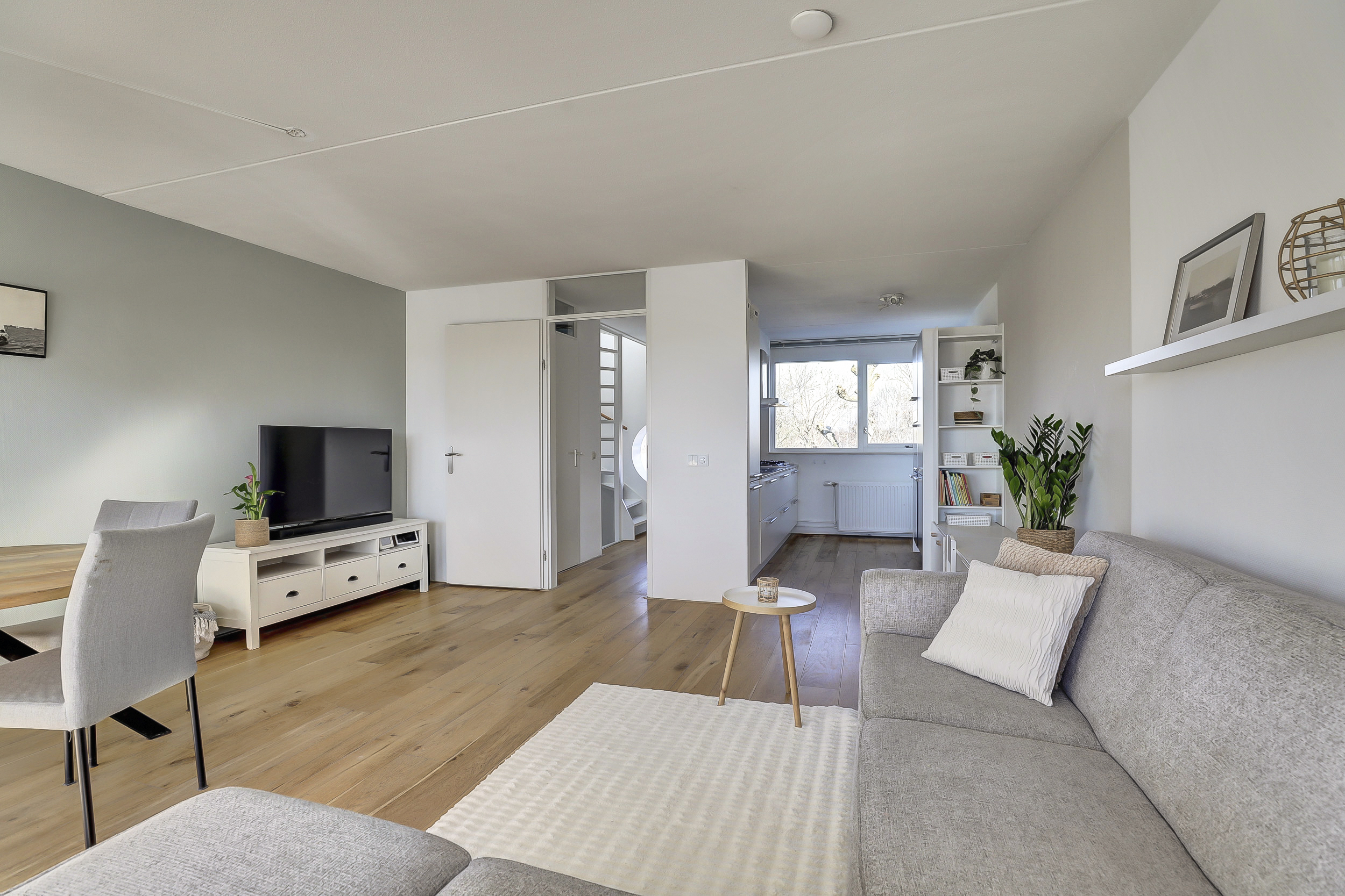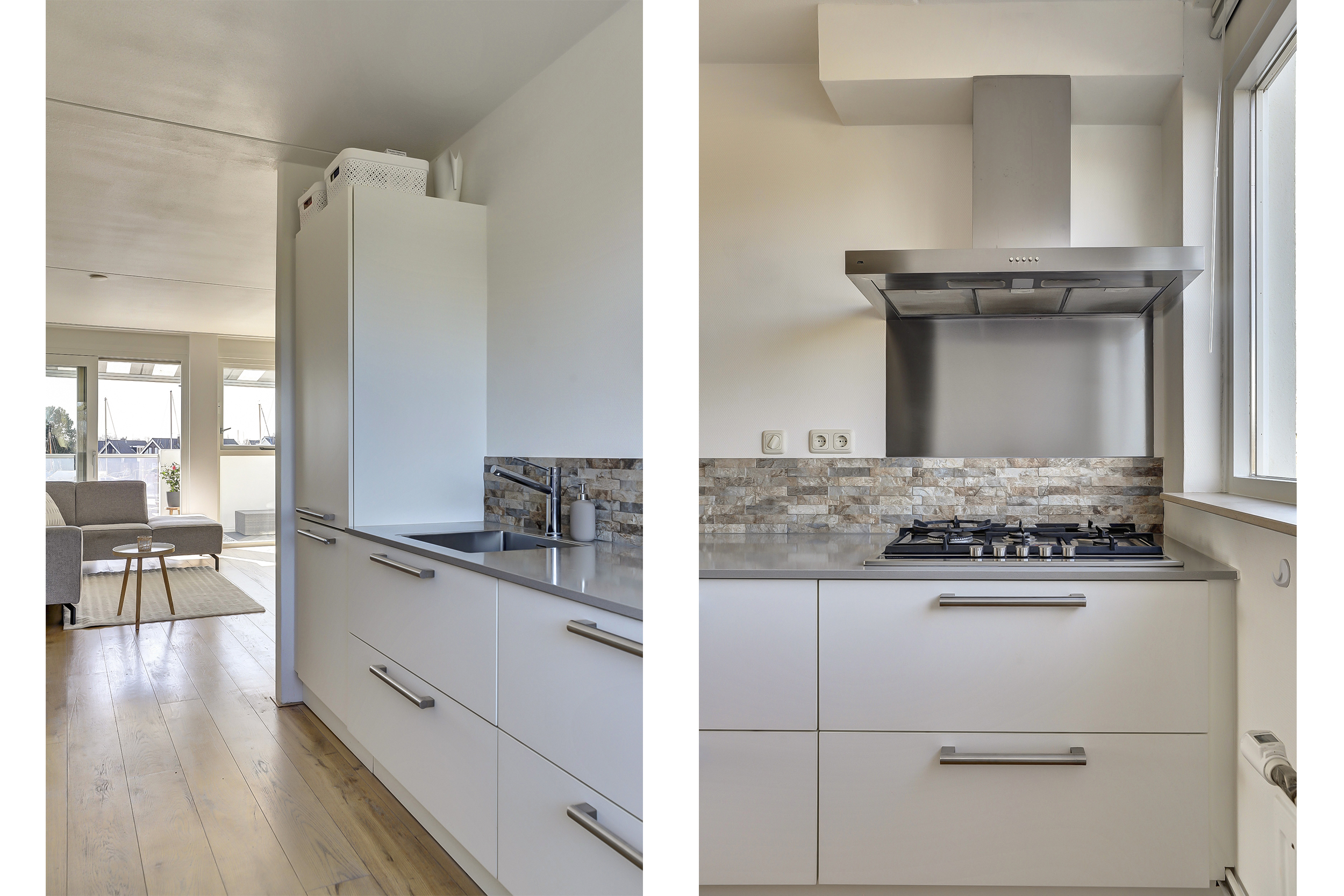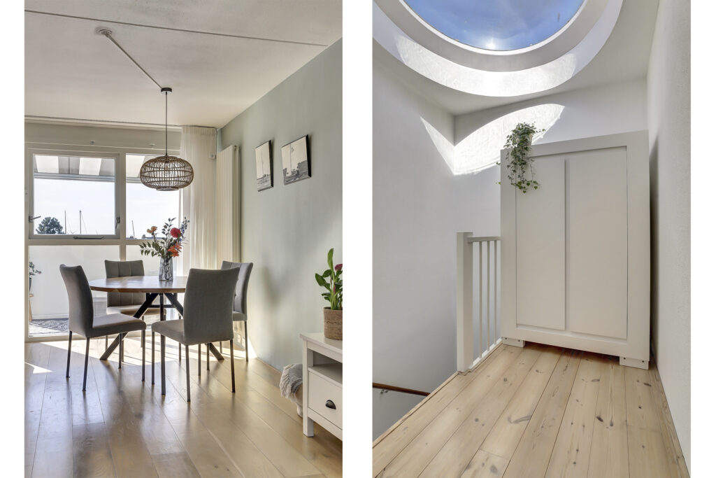 Overloop met verrassend veel daglicht vanwege de lichtkoepel in de voorgevel, toiletruimte. Ruime lichte woonkamer met een groot dakterras en een half-open moderne keuken van 2019 voorzien van een wandmeubel en diverse korflades, diverse inbouwapparatuur, waaronder een vaatwasser, koelkast/vries combinatie, oven, kookplaat met afzuigkap. Vanuit de woonkamer is er een schuifpui naar het riante dakterras. Vanuit hier heb je een magnifiek uitzicht over de gehele binnenhaven.