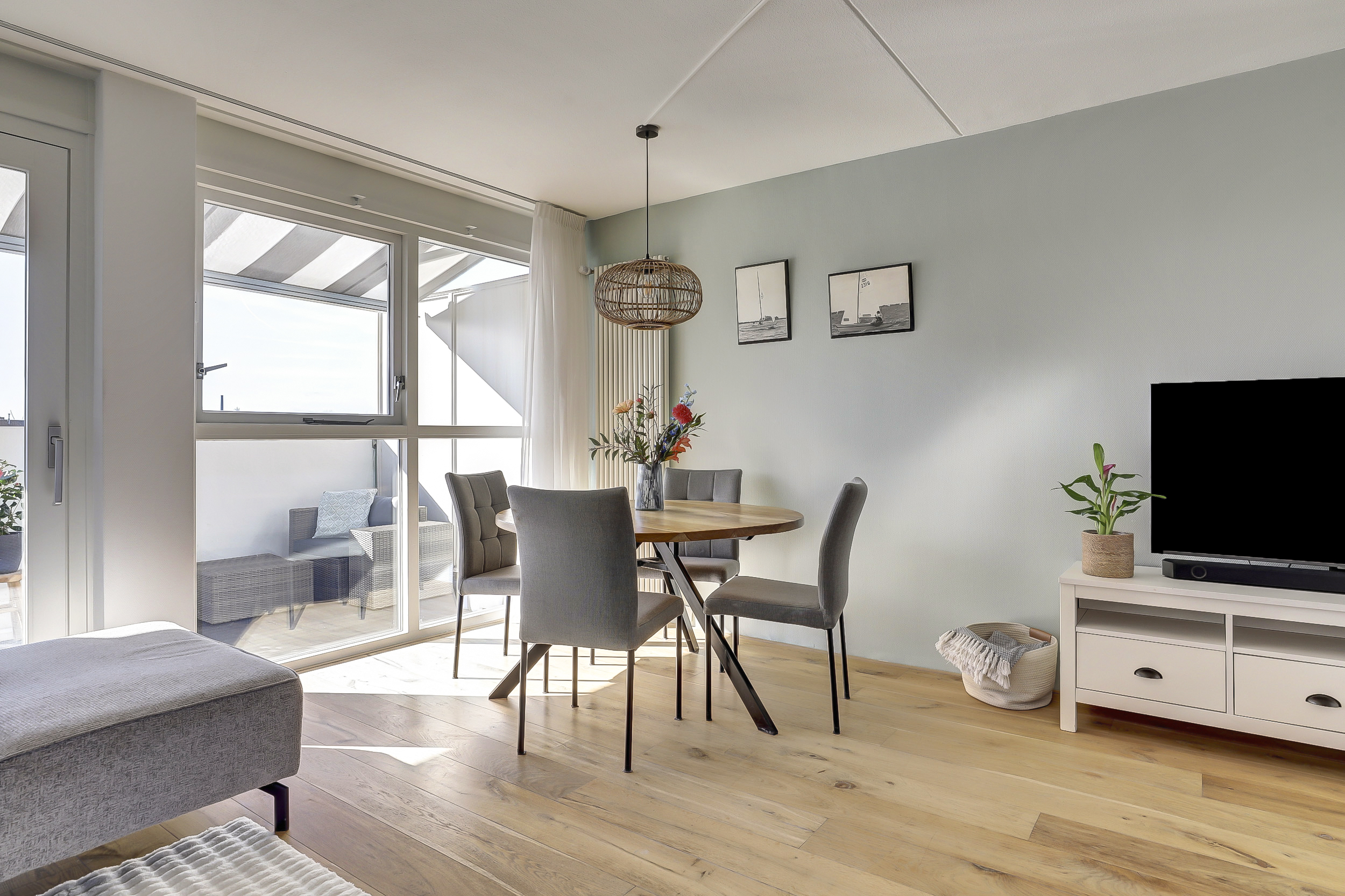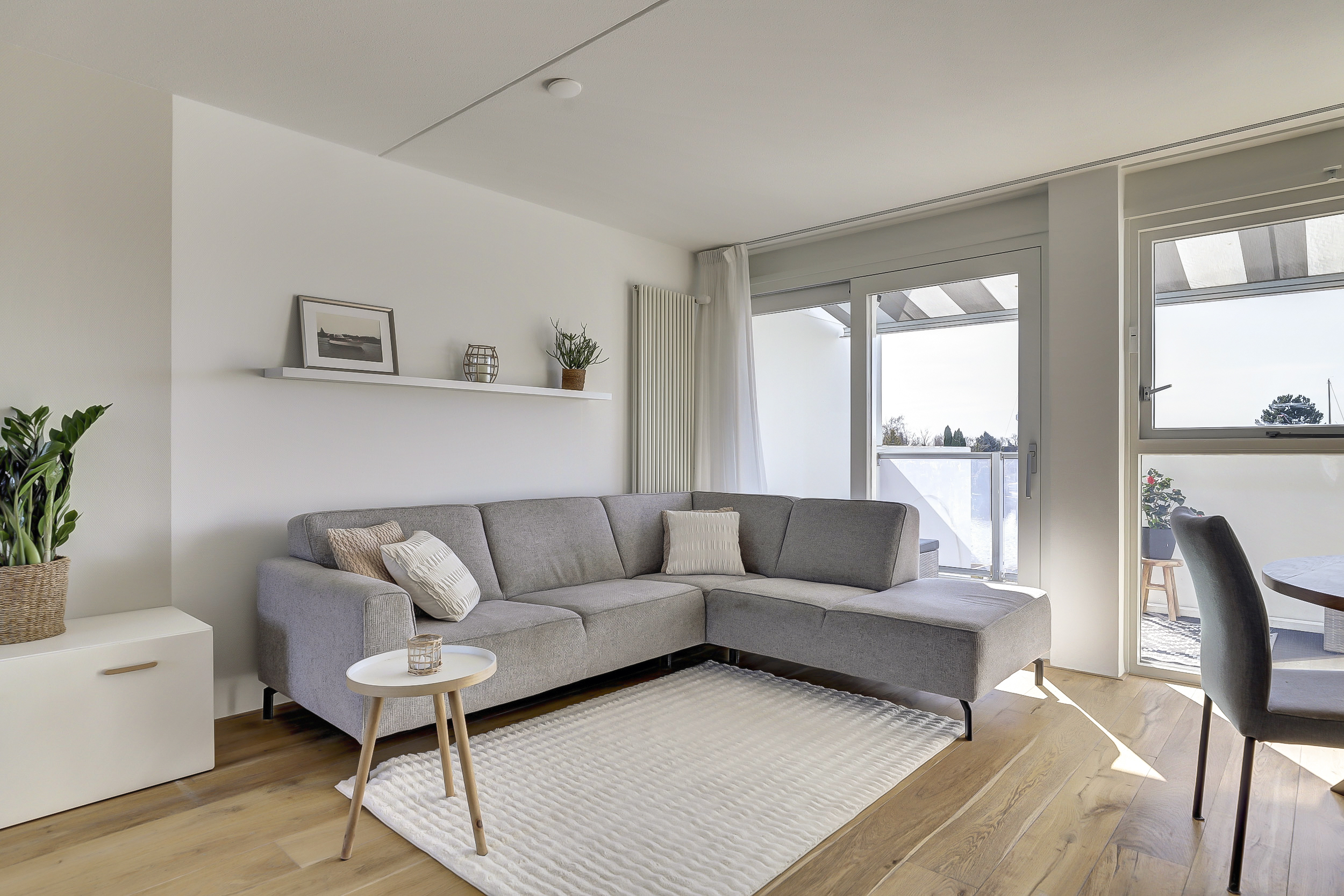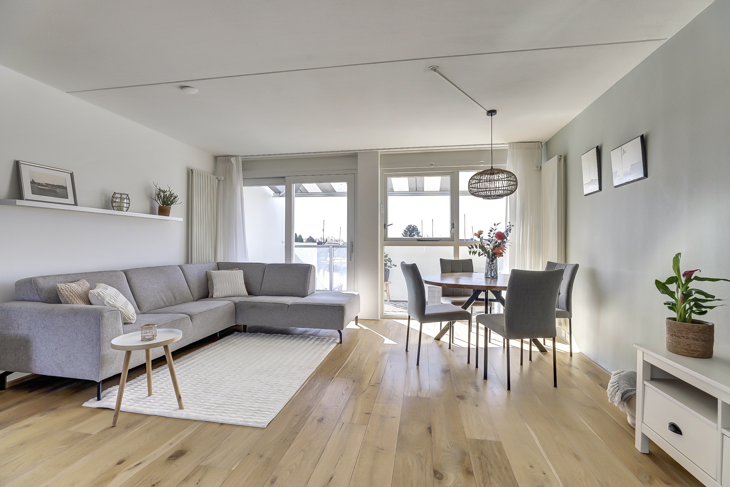 Overloop met verrassend veel daglicht vanwege de lichtkoepel in de voorgevel, toiletruimte. Ruime lichte woonkamer met een groot dakterras en een half-open moderne keuken van 2019 voorzien van een wandmeubel en diverse korflades, diverse inbouwapparatuur, waaronder een vaatwasser, koelkast/vries combinatie, oven, kookplaat met afzuigkap. Vanuit de woonkamer is er een schuifpui naar het riante dakterras. Vanuit hier heb je een magnifiek uitzicht over de gehele binnenhaven.