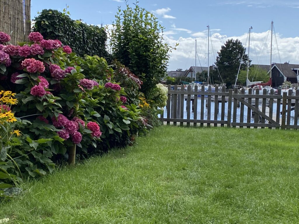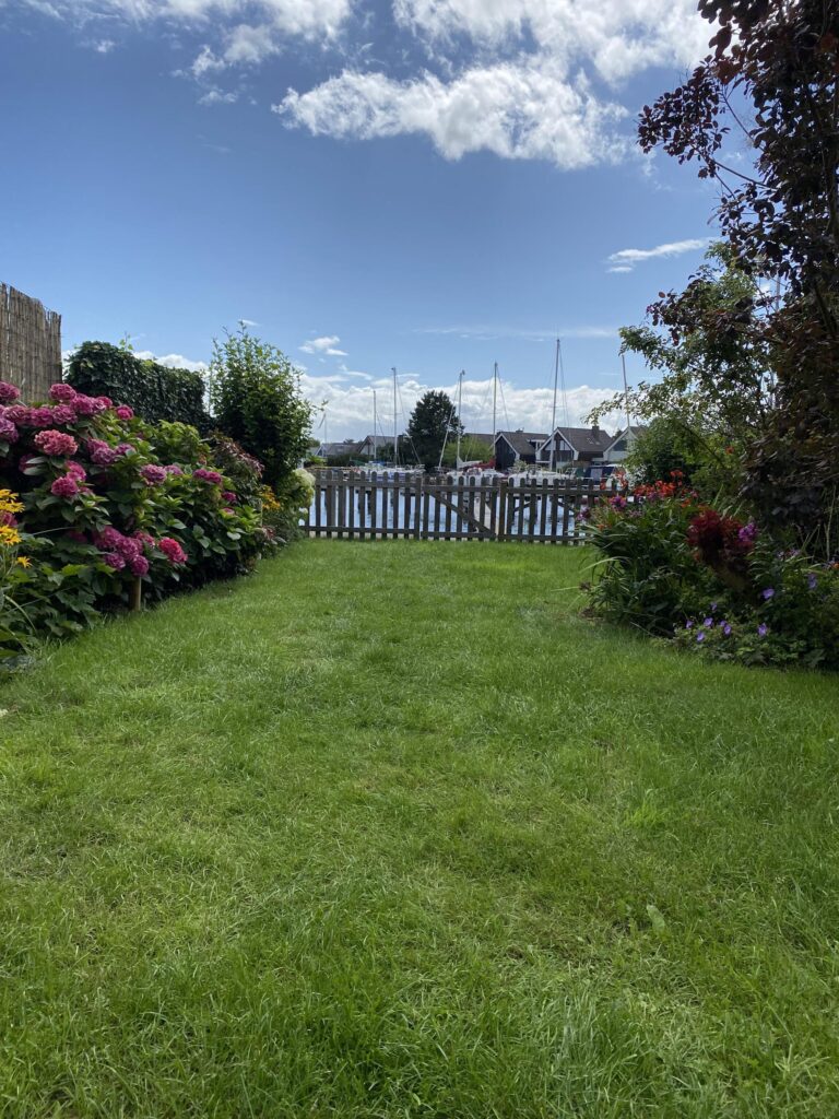 Beschutte zonnige tuin met uitzicht over de binnenhaven, gazon, bloeiende borders en struiken.