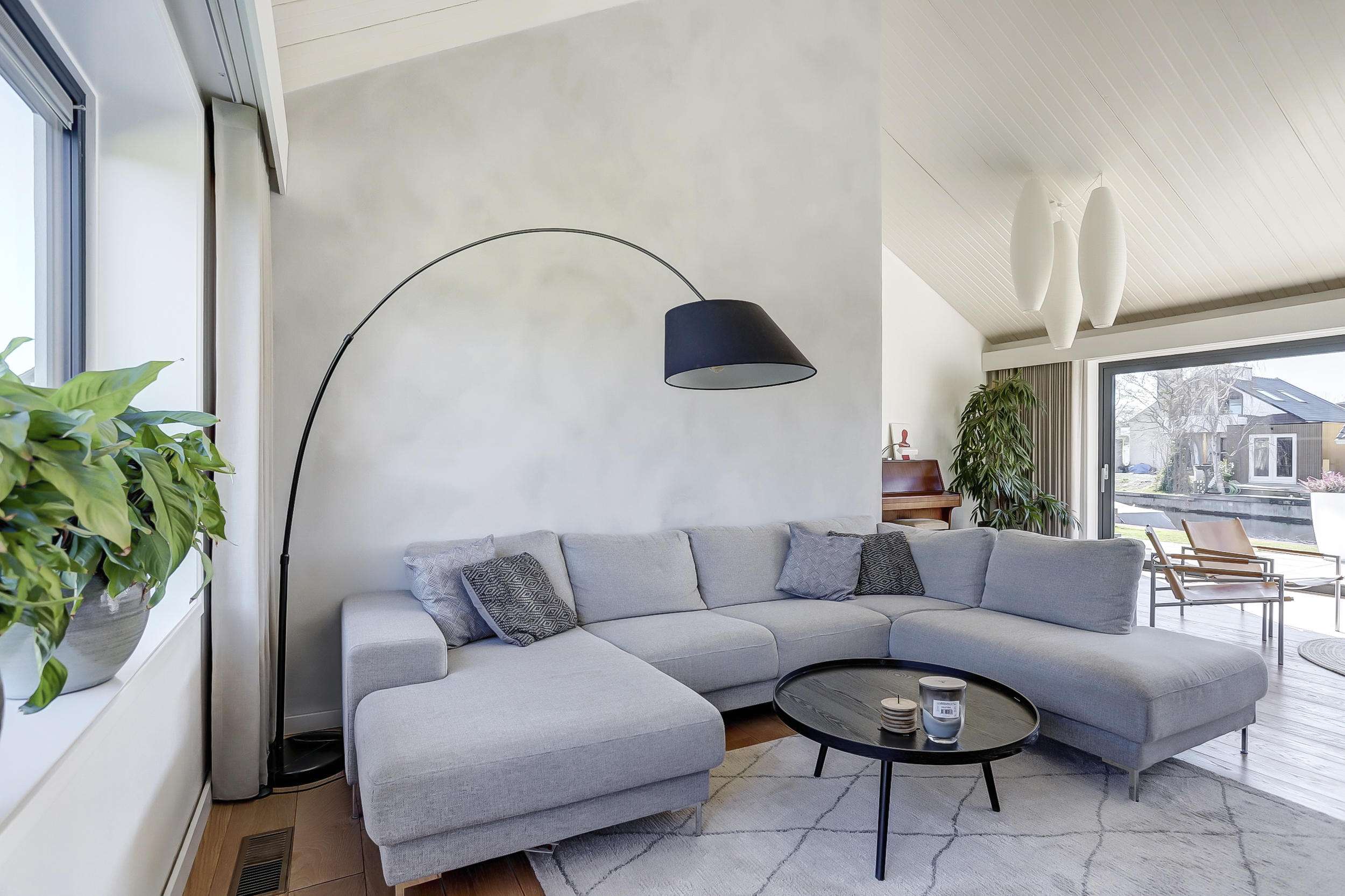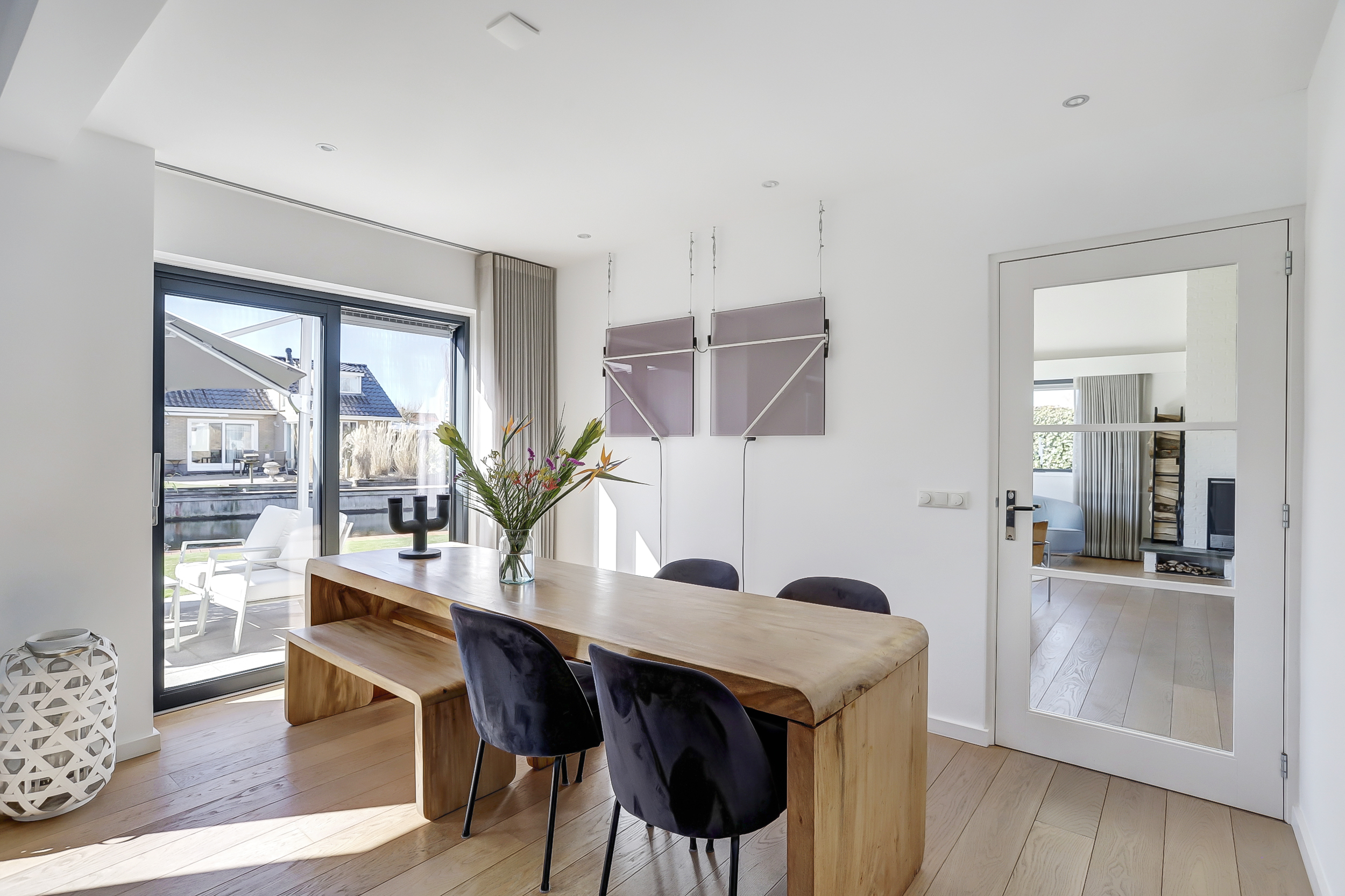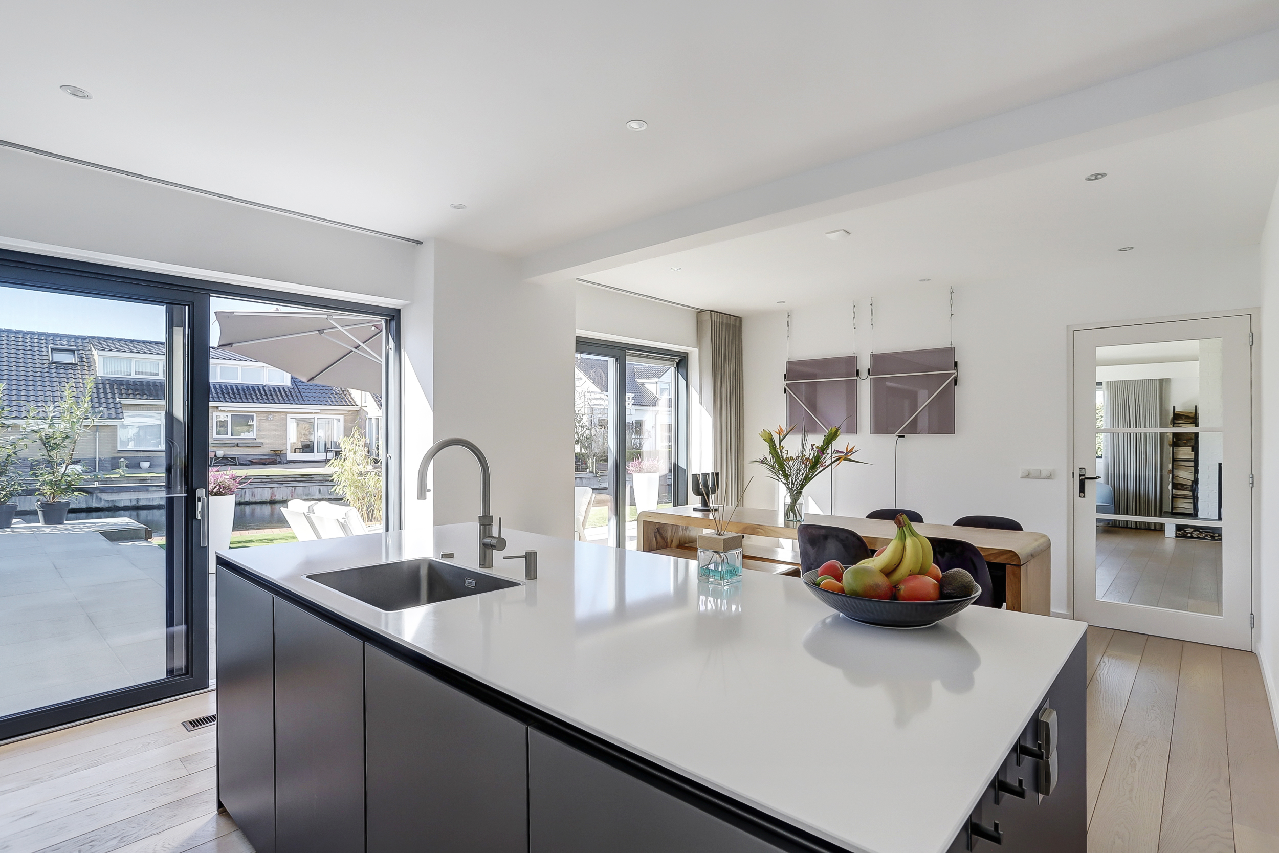 De woning is o.a. ingedeeld met een royale representatieve lichte hal, L-vormige living met veel daglicht voorzien van een verrassende opengewerkte kap met grote schuifpuien naar het terras en de tuin. De luxe woonkeuken beschikt over een kookeiland, veel kastruimte, diverse inbouwapparatuur en een eetgedeelte met zicht op het water.
