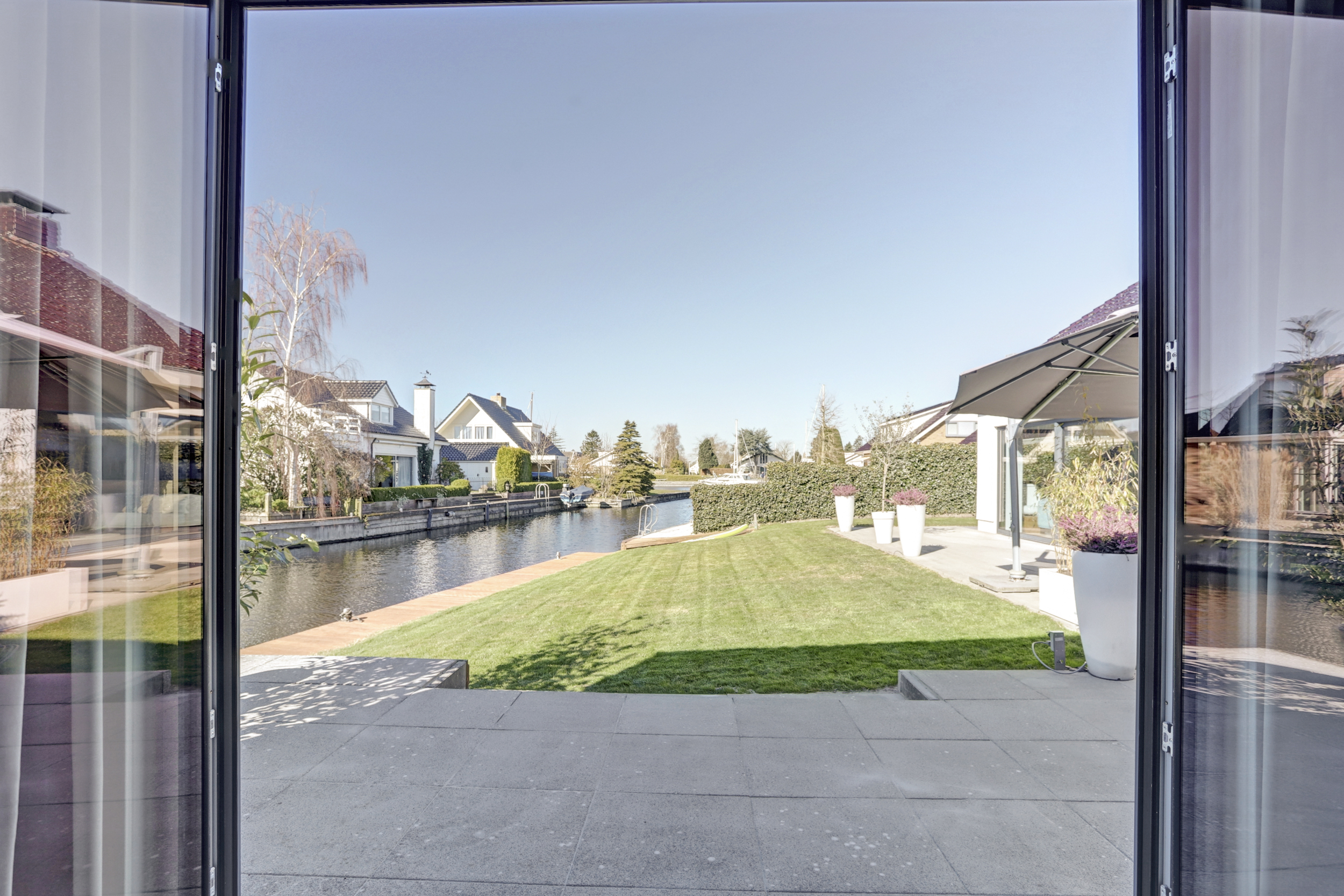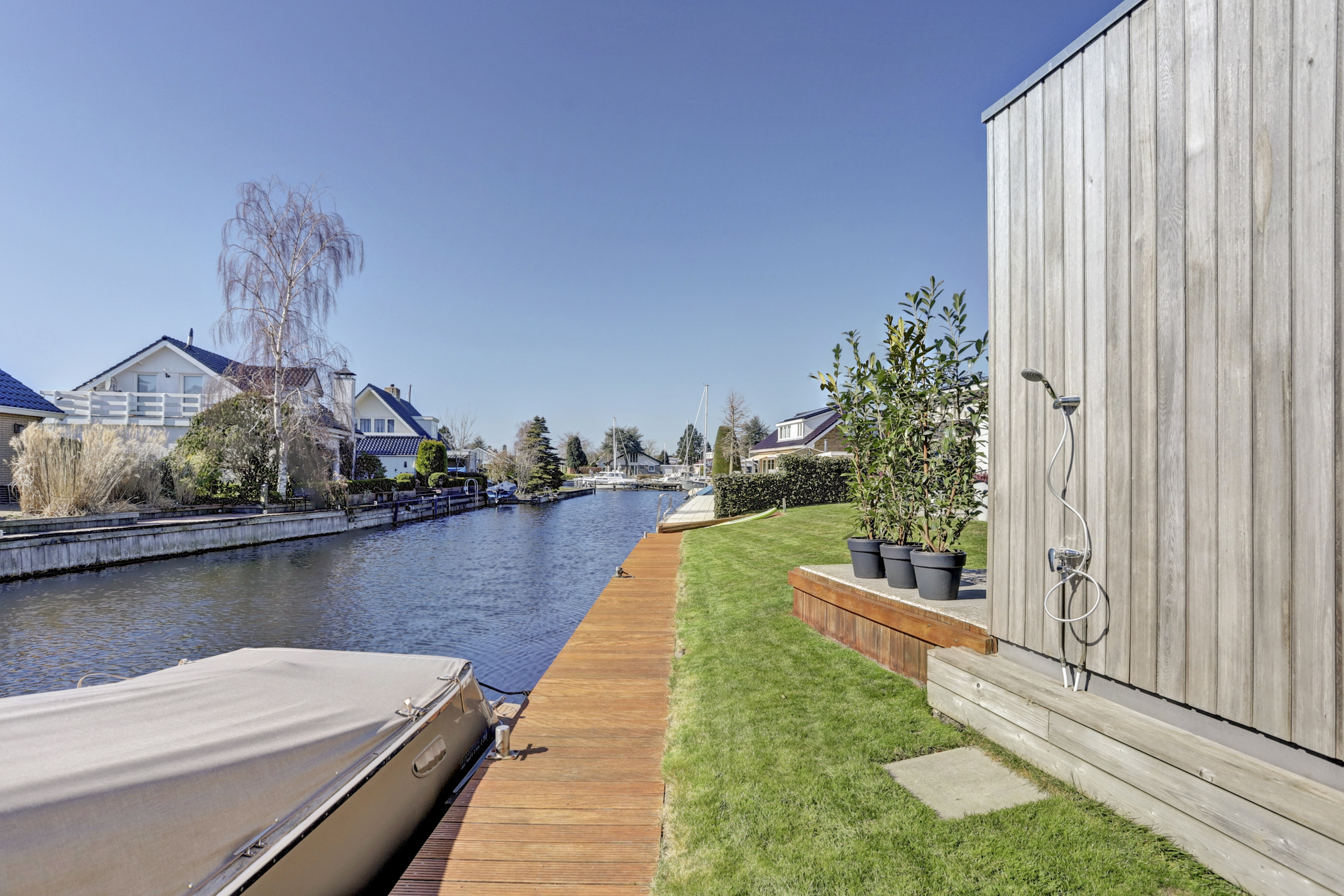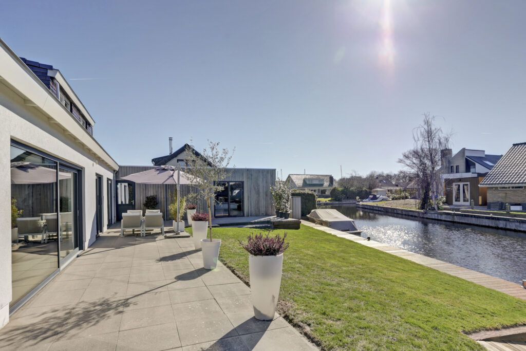 De tuin ligt op het zuidwesten en is verzorgd aangelegd met gazon, een royaal terras en buitendouche. De brede oprit biedt voldoende parkeergelegenheid op eigen terrein. De strook eigen water met lange steiger is geschikt voor het aanleggen van een of meerdere boten (staande mast) en er is een aflopende steiger voor bijvoorbeeld een bijboot, kano of SUP-board. De walbeschoeiing is geheel vervangen in verkeert in uitstekende conditie.