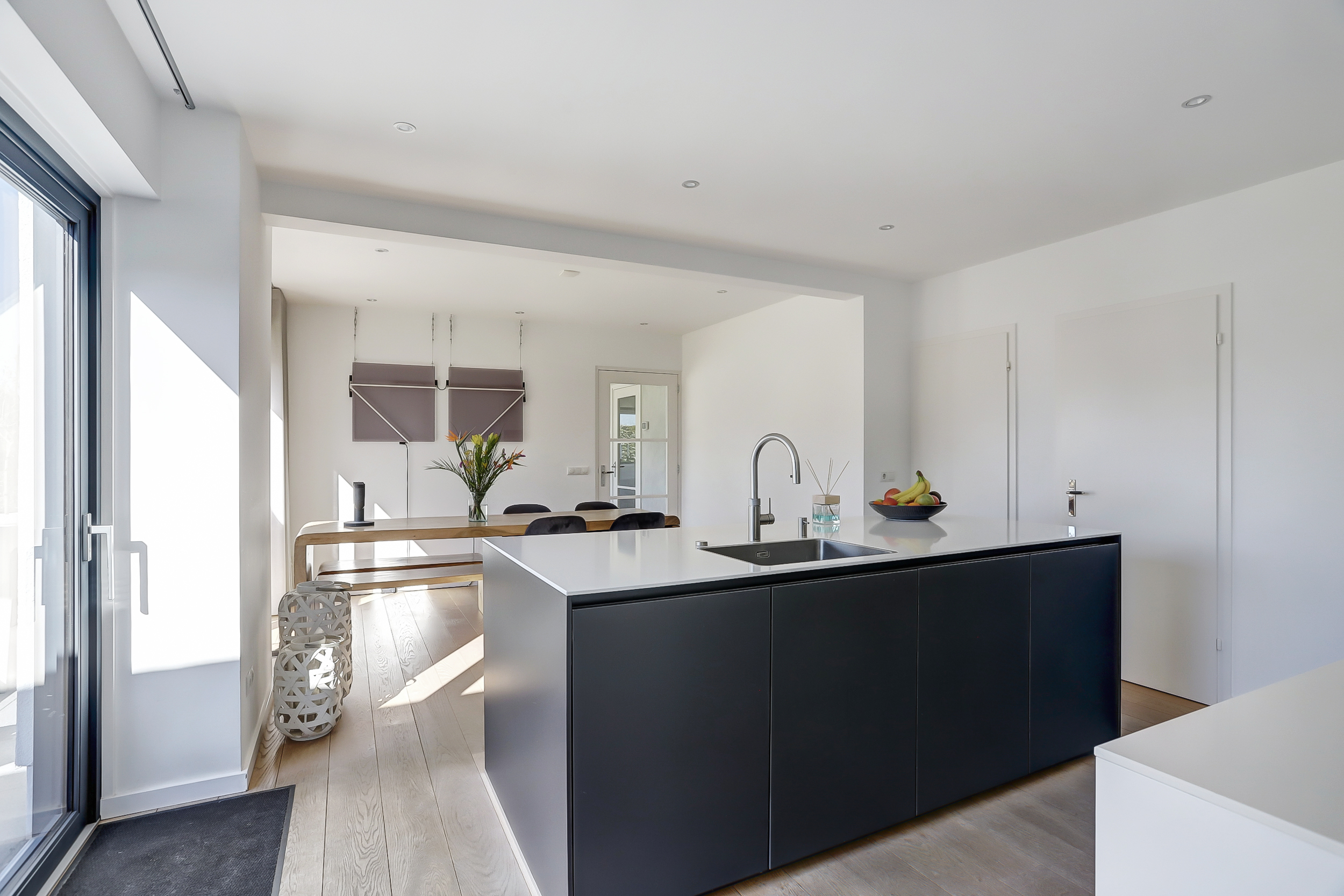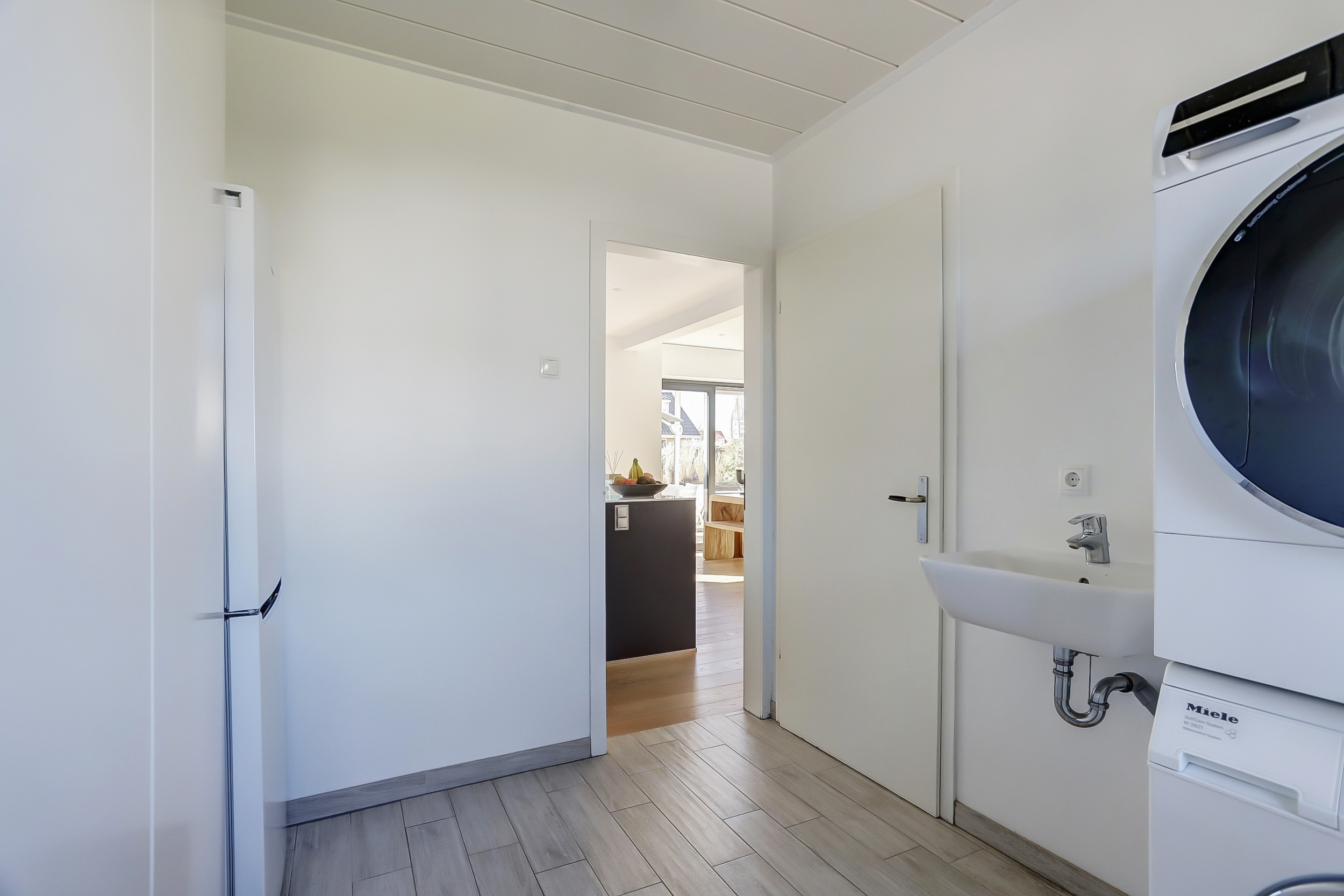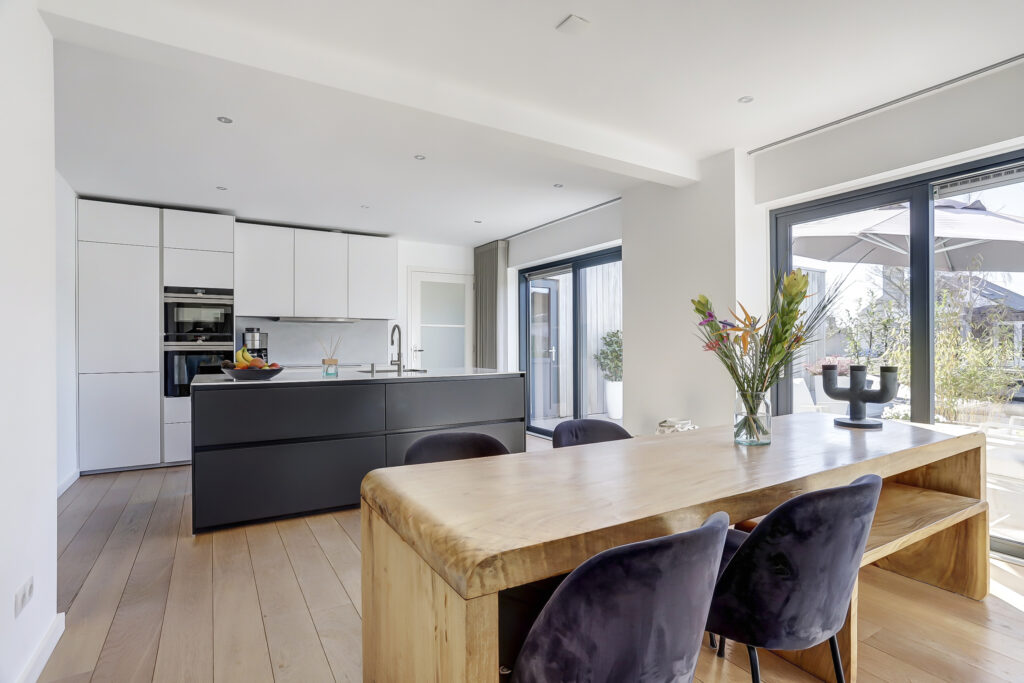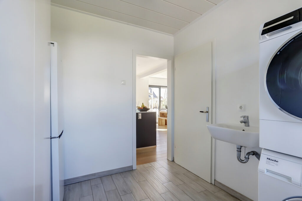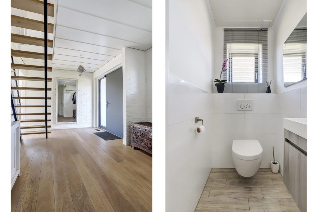 Royale hal met vrijhangend toilet en een bijkeuken. Glazen toegangsdeur naar de ruime living met open kap en aluminium schuifpuien naar het terras. Vanuit de hal en de woonkamer is de woonkeuken bereikbaar.