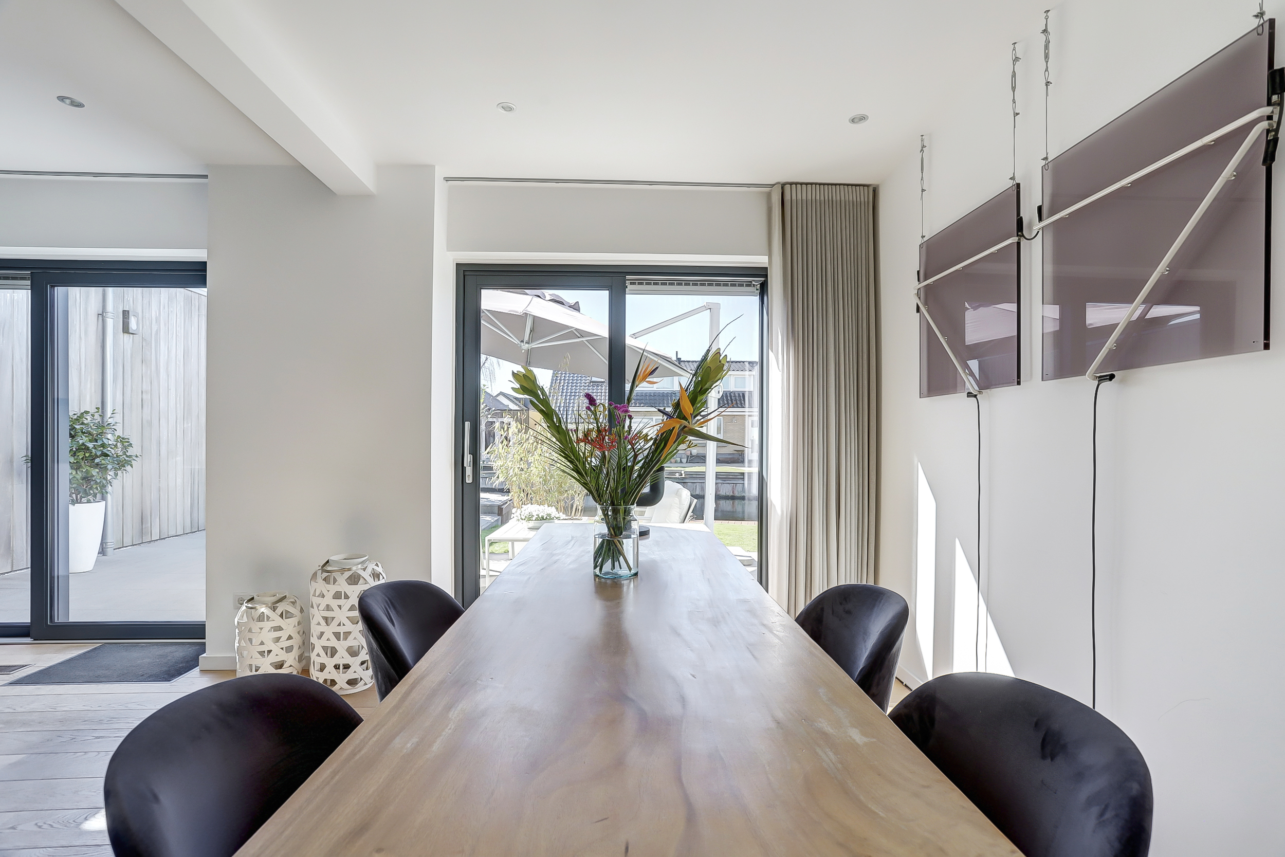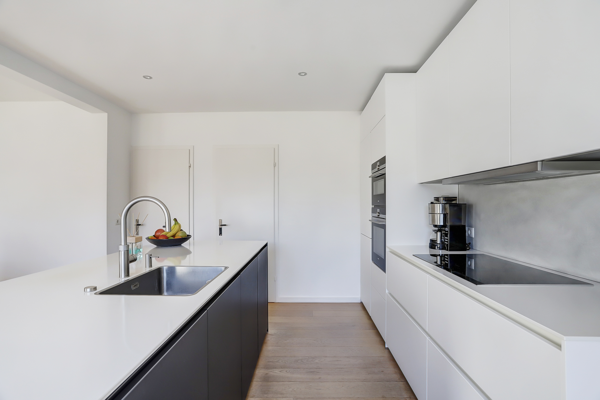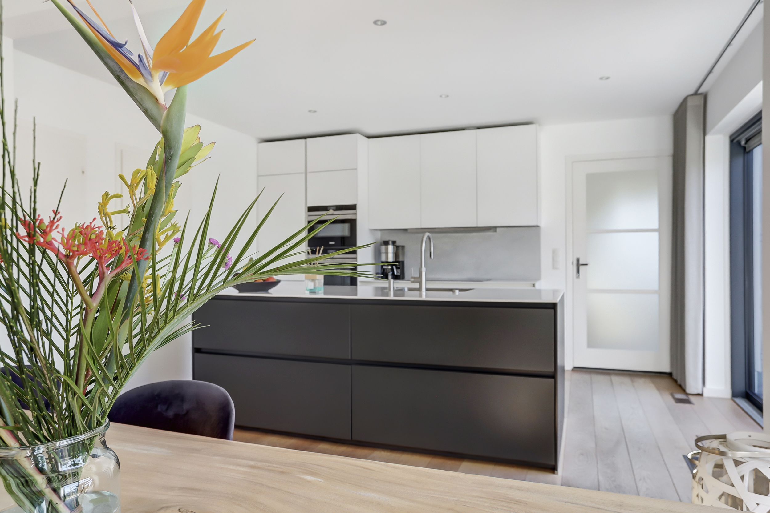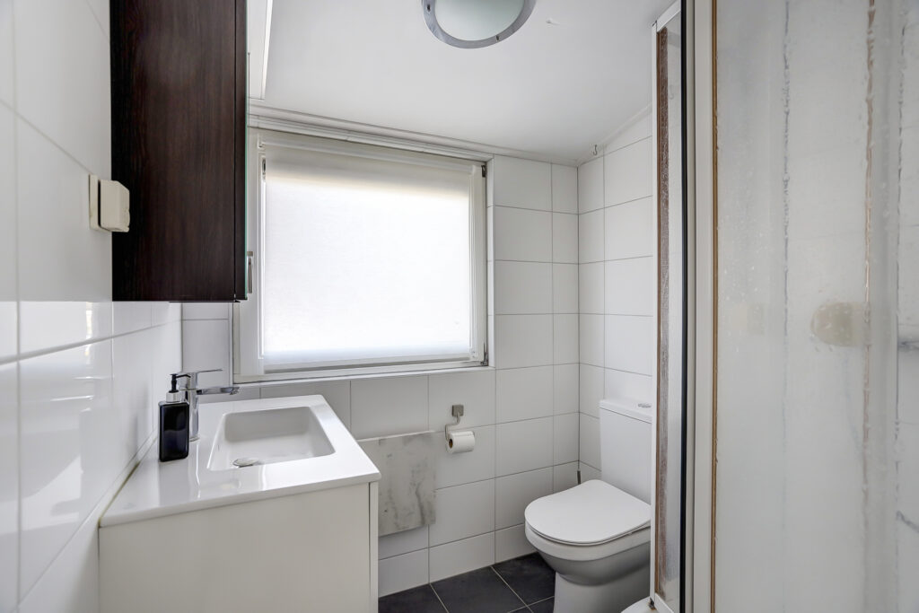 Royale hal met vrijhangend toilet en een bijkeuken. Glazen toegangsdeur naar de ruime living met open kap en aluminium schuifpuien naar het terras. Vanuit de hal en de woonkamer is de woonkeuken bereikbaar.
