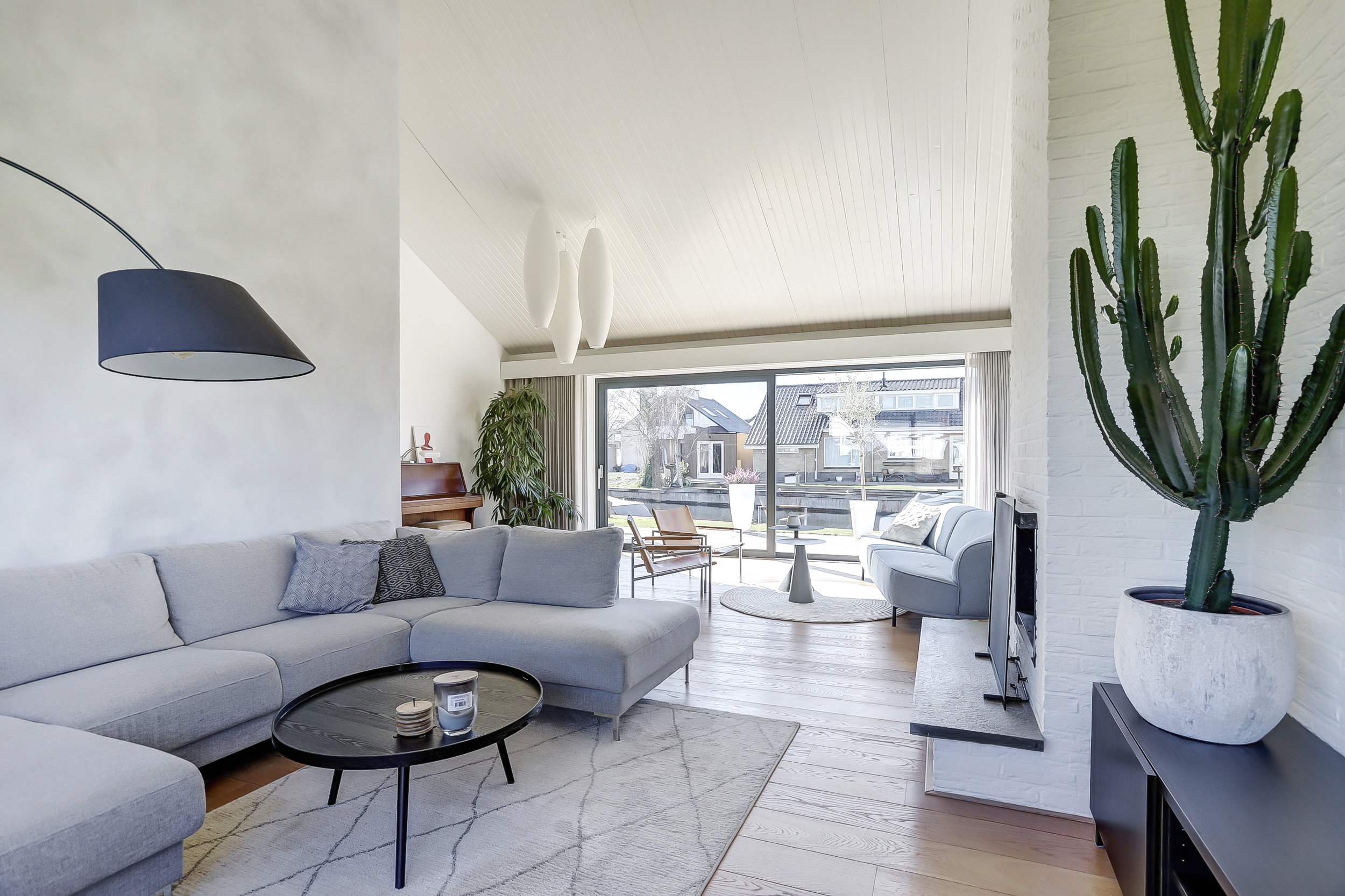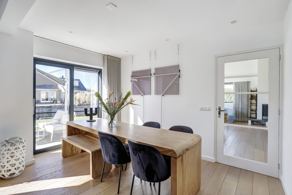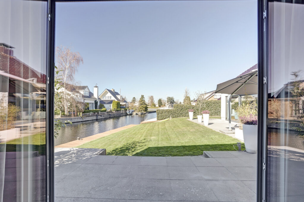 De woonkeuken is uitgerust met een hoogwaardige op maat gemaakte keuken voorzien van een kookeiland met brede lades, vaste kasten en diverse inbouwapparatuur; waaronder een inductiekookplaat geïntegreerde afzuigkap, (stoom)oven, combi-magnetron, koelkast en vriezer. De woonkeuken is eveneens uitgevoerd met fraaie aluminium schuifpuien die vanuit de eet/zithoek prachtig uitzicht bieden over het terras, tuin en water. De begane grondvloer is nagenoeg geheel uitgevoerd met massieve houten vloerdelen. De woonkeuken sluit aan op een ruime hal met kelder en zijentree. Vanuit hier is de toegang naar de tuingerichte royale slaapkamer. De ruime slaapkamer is uitgerust met openslaande deuren naar de tuin, moderne luxueuze eigen badkamer voorzien van een inloopdouche, ligbad, wastafelmeubel en vrijhangend toilet, pvc-vloer voorzien van vloerverwarming. Aan de voorzijde is een inpandige garage met een tussendeur naar de hal.