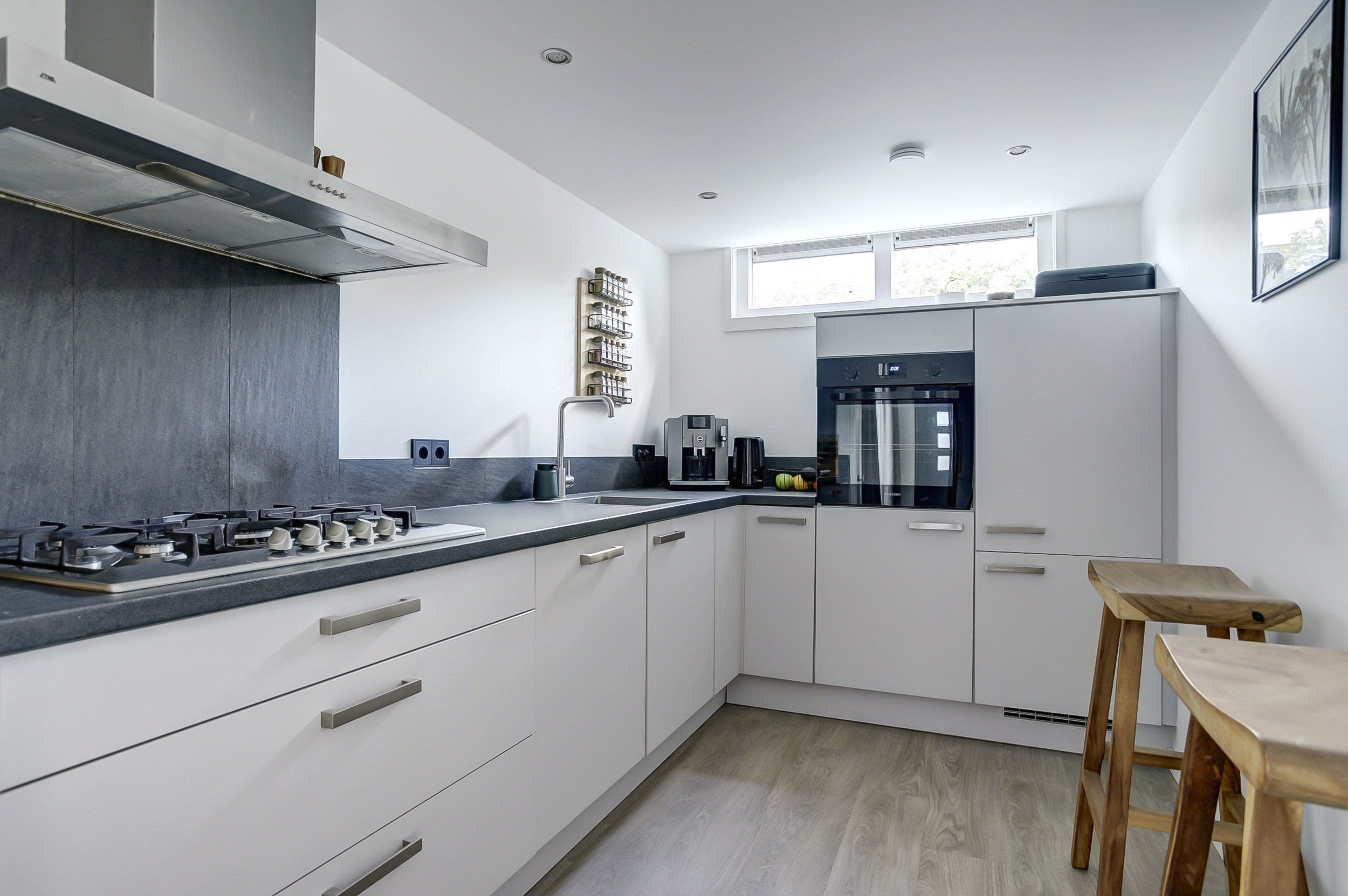 Entree, hal, vaste kastruimte, toilet, glazen toegangsdeur naar de royale lichte woonkamer met zijraam, openslaande tuindeuren naar het terras en een fraaie overkapping. Moderne l-vormige keukenopstelling met korflades en diverse inbouwapparatuur. Het keuken gedeelte is voorzien van vloerverwarming. De gehele begane grondvloer is uitgevoerd met een lichte pvc vloer.
