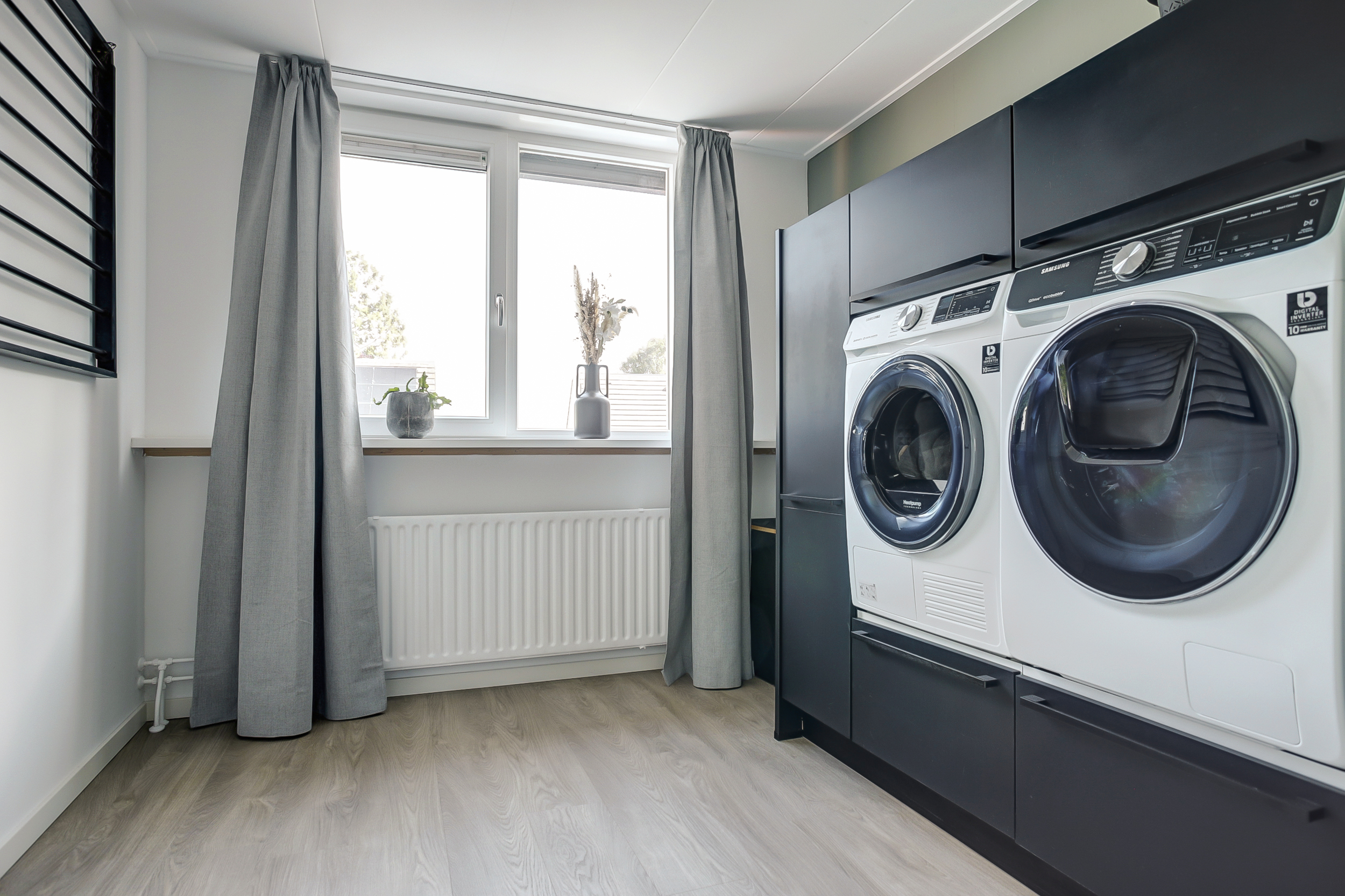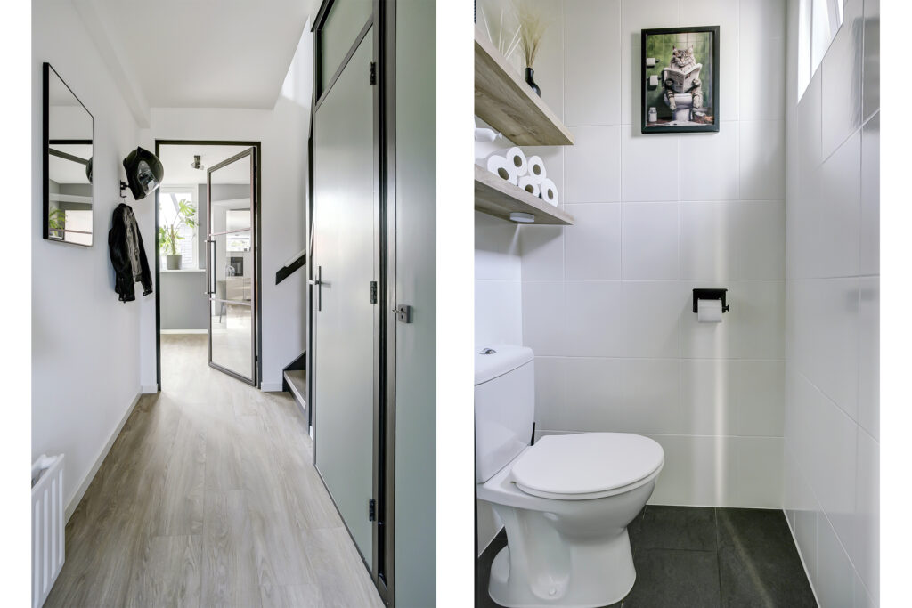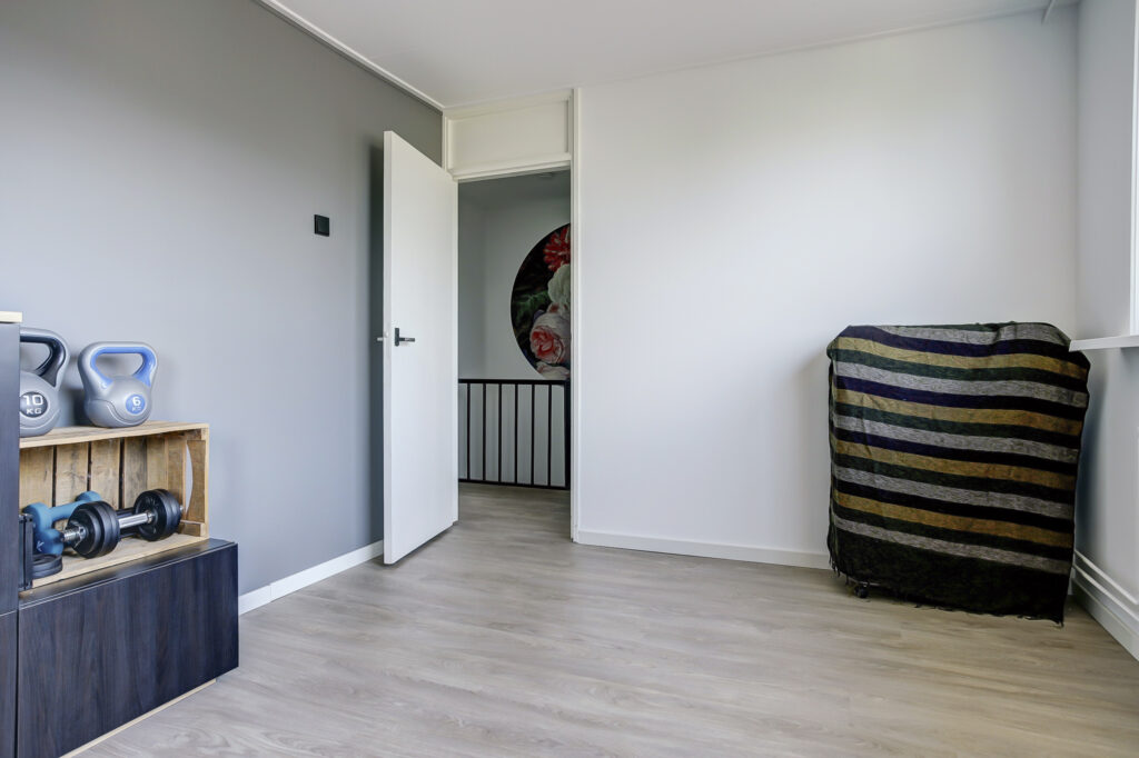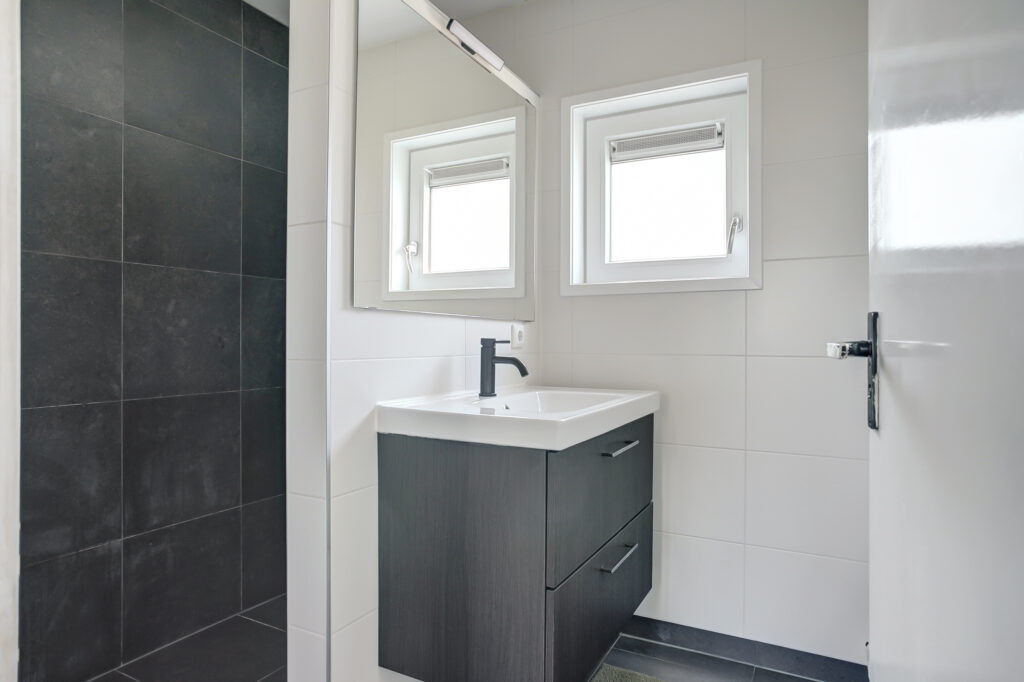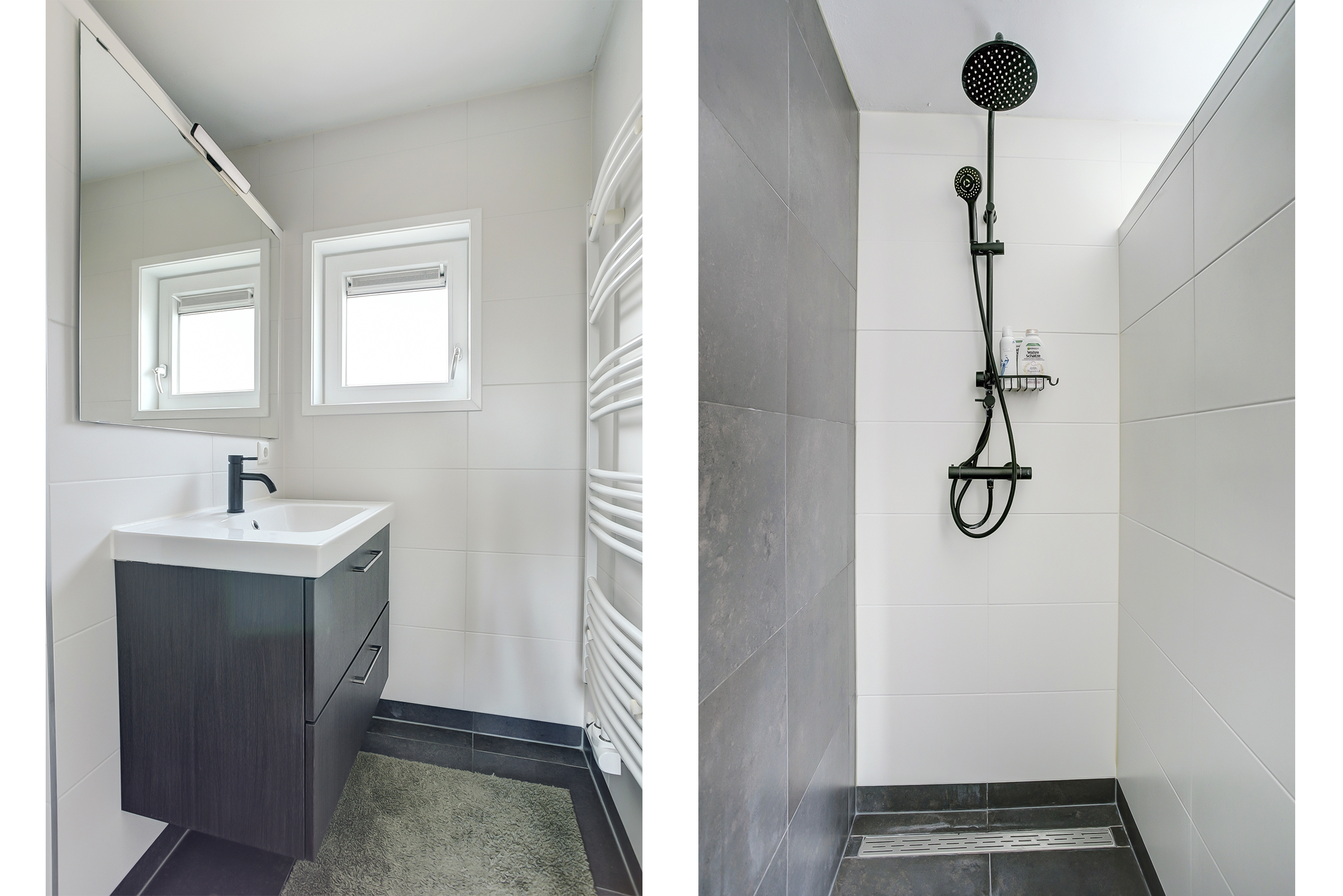 Overloop met 3 slaapkamers, waarvan één slaapkamer is ingericht als wasruimte. Moderne badkamer met wastafelmeubel inloopdouche en een vrijhangend toilet. De verdieping is eveneens uitgevoerd met een pvc-vloer.