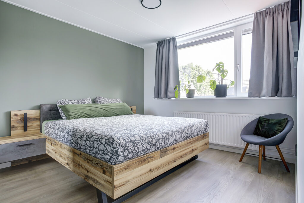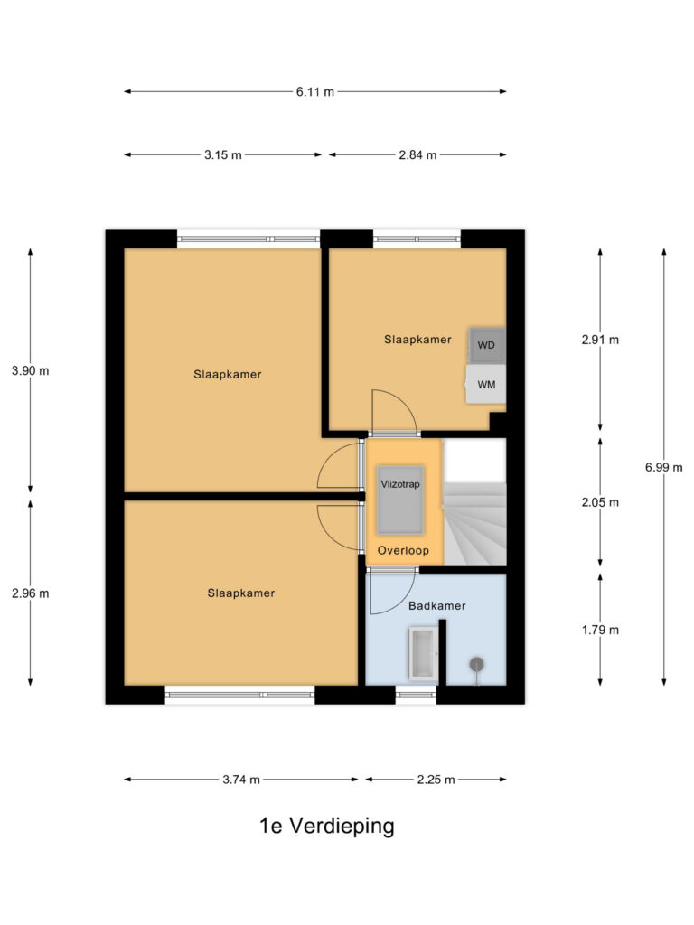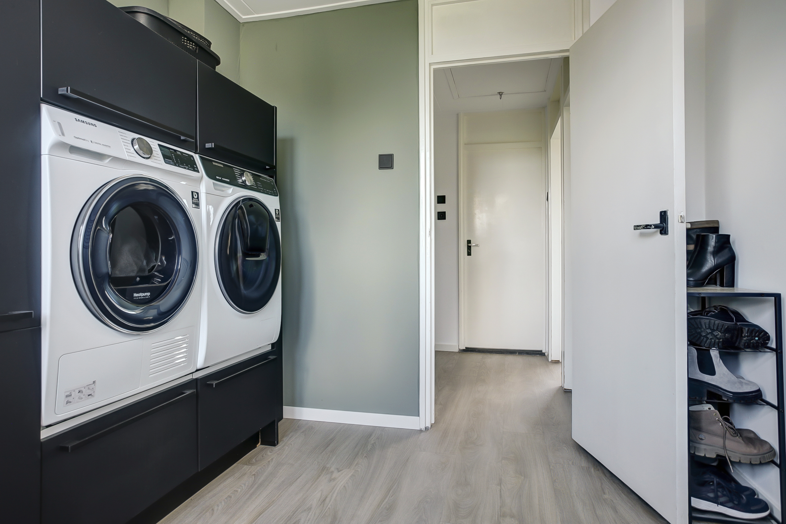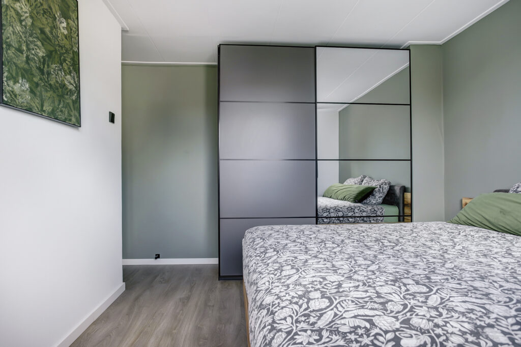Overloop met 3 slaapkamers, waarvan één slaapkamer is ingericht als wasruimte. Moderne badkamer met wastafelmeubel inloopdouche en een vrijhangend toilet. De verdieping is eveneens uitgevoerd met een pvc-vloer.