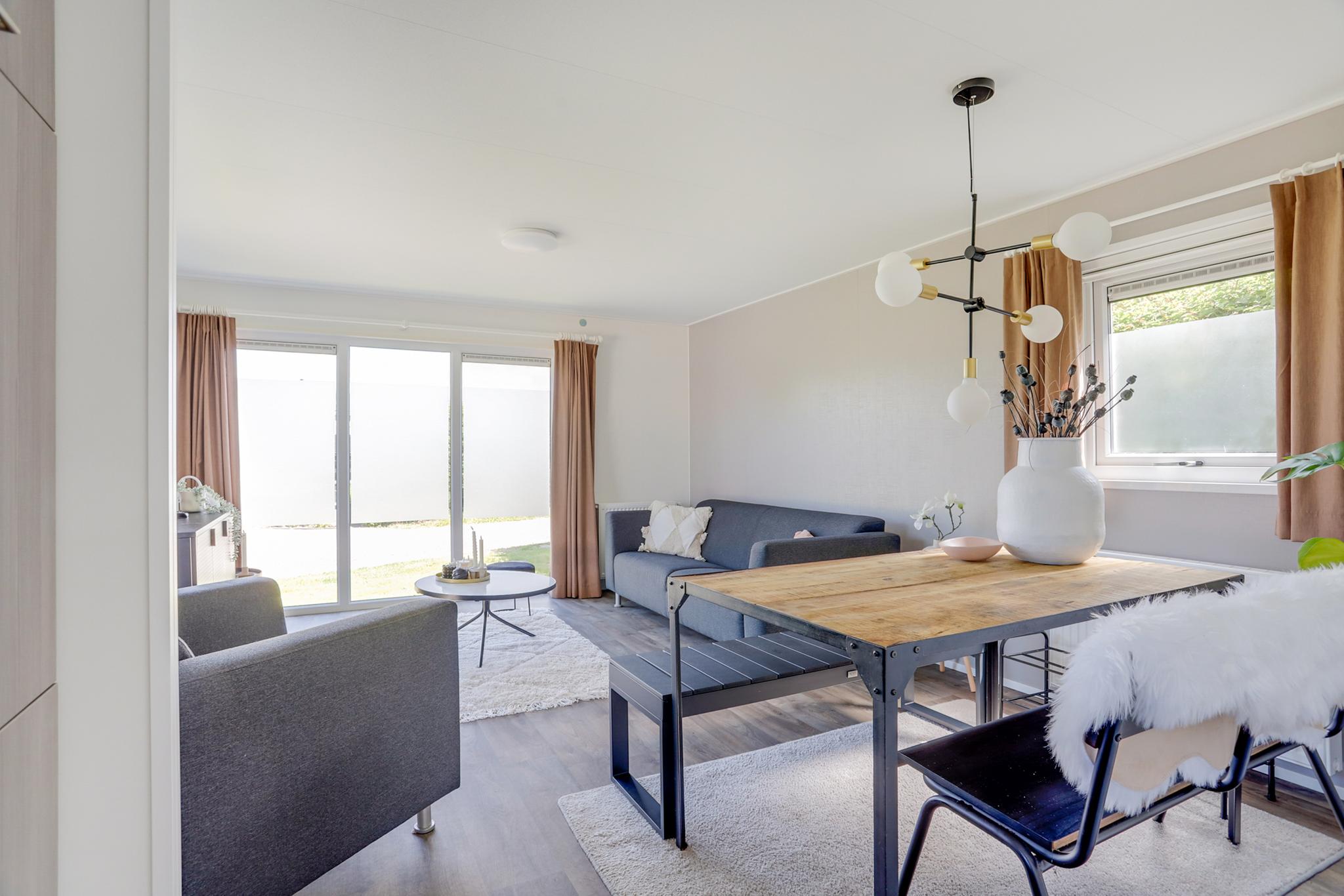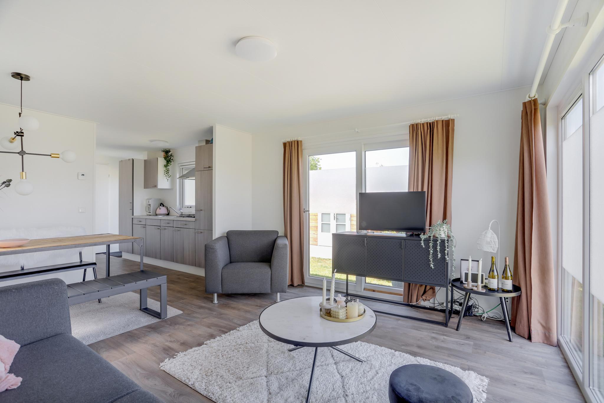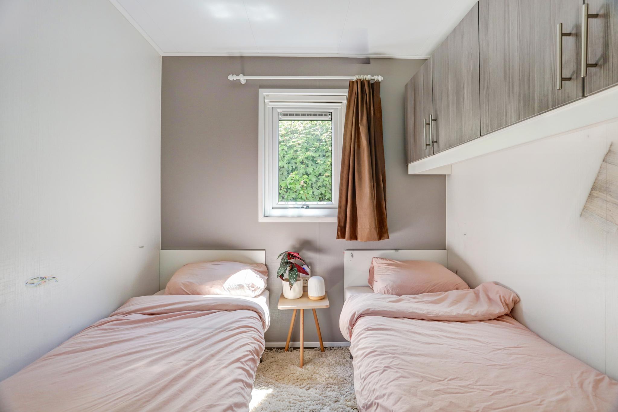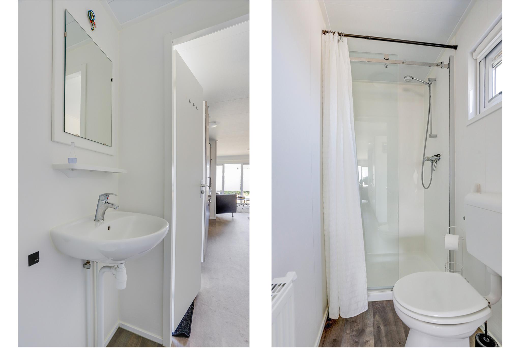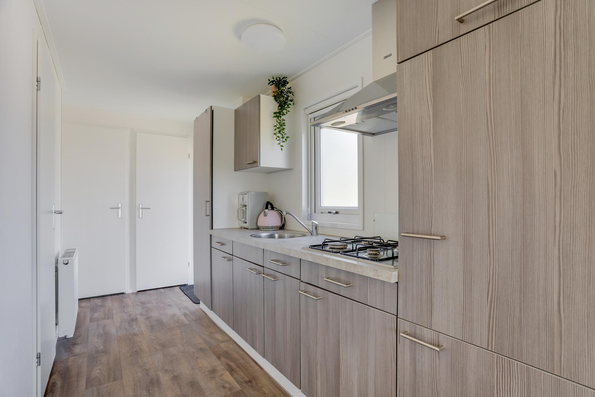Royale lichte living voorzien van een kunststof schuifpui naar het terras, fraaie eet/zithoek, moderne keuken met voldoende kastruimte inclusief inbouwapparatuur, waaronder; koel/vriescombinatie, gaskookplaat, afzuigkap, magnetron. Twee slaapkamers waarvan een ouderslaapkamer voorzien van vaste kasten en een slaapkamer met twee bedden en kastruimte. De badkamer is uitgerust met een douche, toilet en wastafel. Naar wens kan het gehele inventaris achterblijven, behoudens enkele persoonlijke bezittingen.