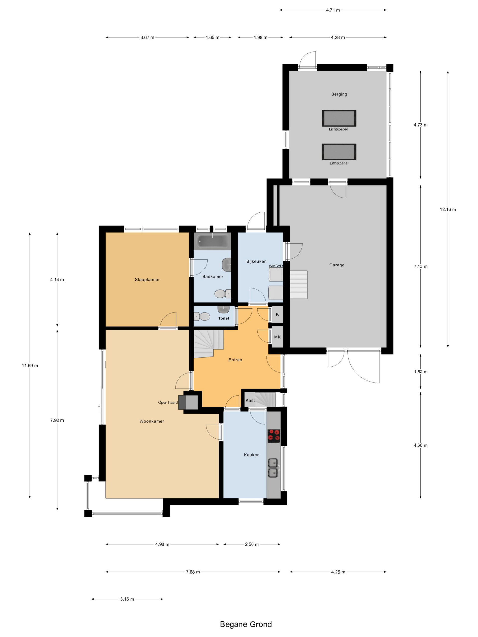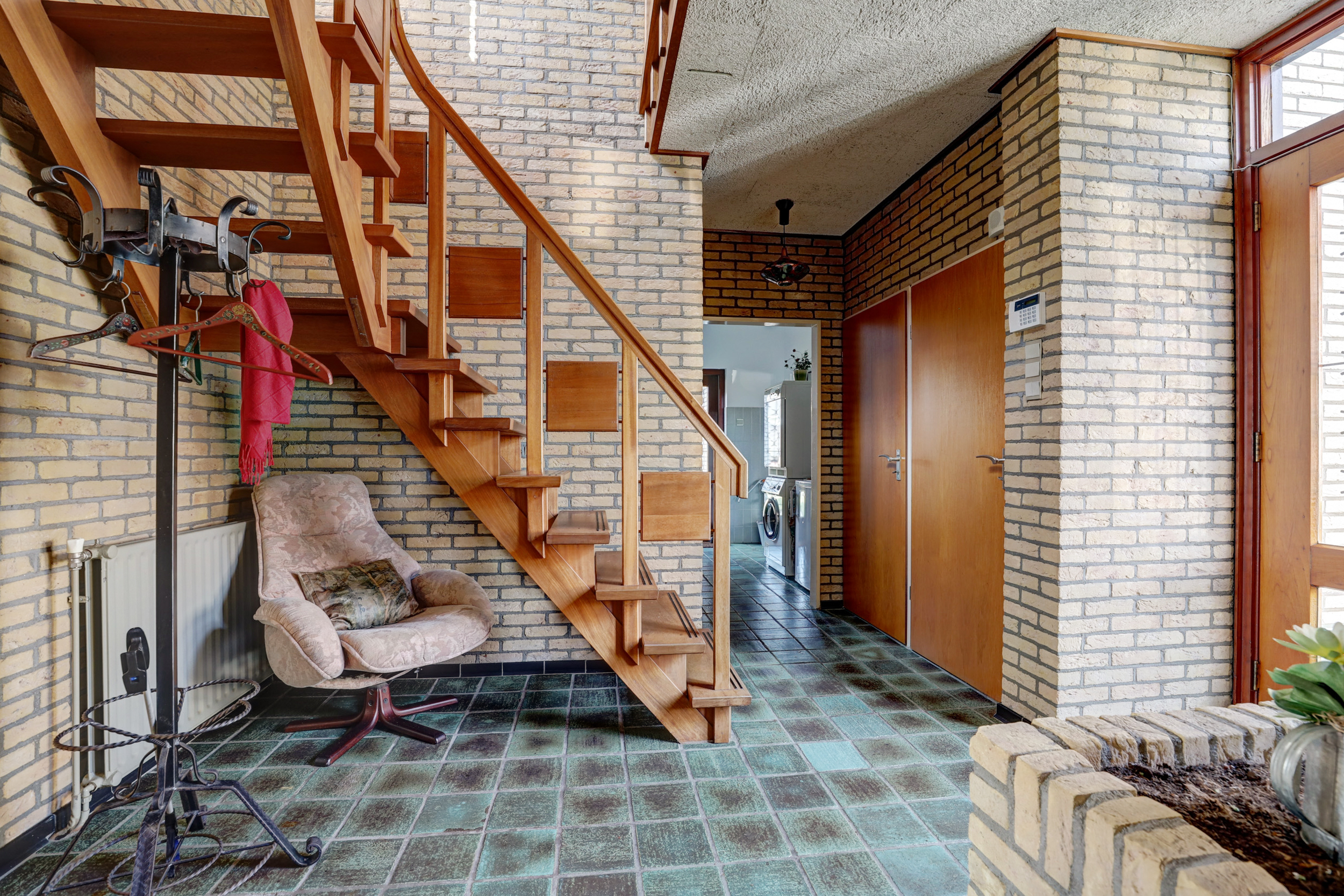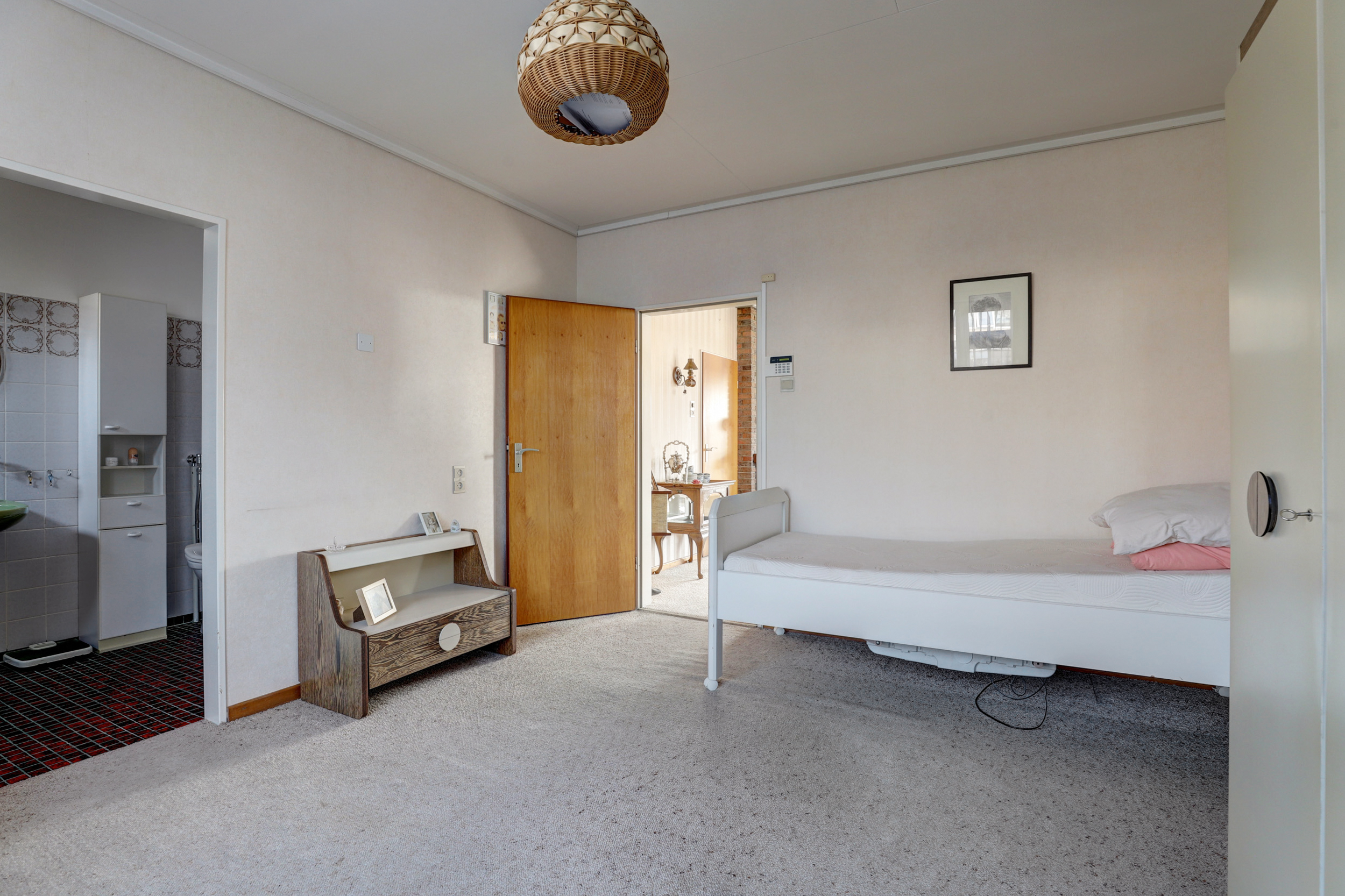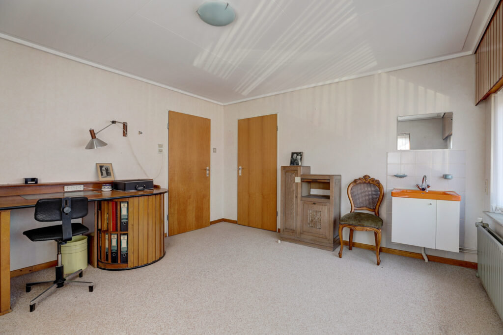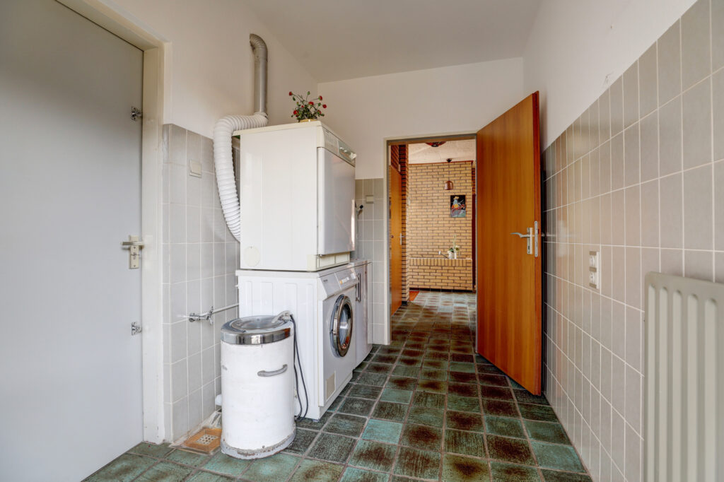 Vanuit de woonkamer is een toegang naar een slaapkamer en aansluitend een badkamer met bad/douche combinatie, wastafel en toilet. Vanuit de centrale is een separate toegang naar de bijkeuken met opstelplaats voor witgoedapparatuur en naar de inpandige riante garage met een doorloop naar een grote berging/werkplaats.