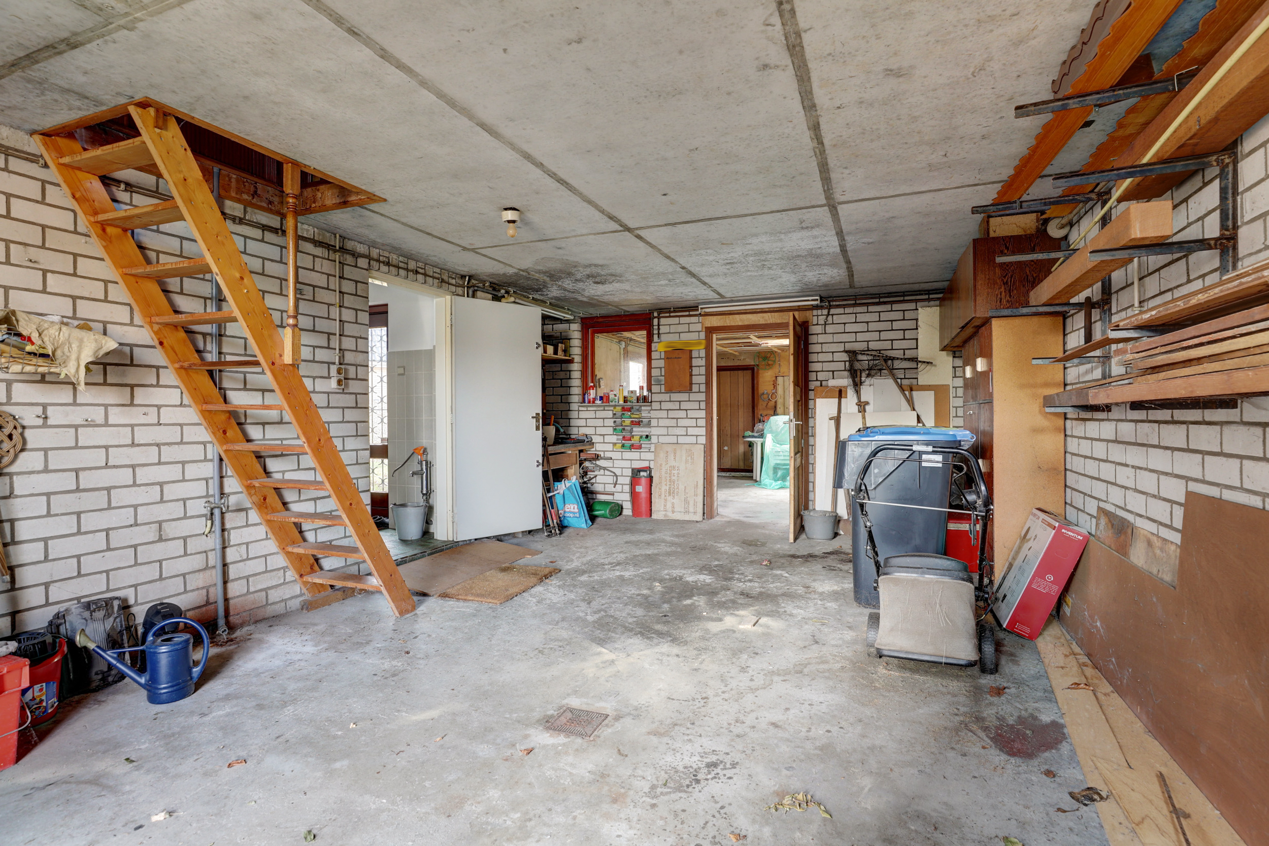 Royale garage met aangebouwde berging van in totaal 52 m². Vanuit hier is de hobby/atelier kamer bereikbaar. Zowel de garage als de berging zijn voorzien van werkbanken. Er is een grote kelder voor regenwateropvang met de pomp in de bijkeuken.