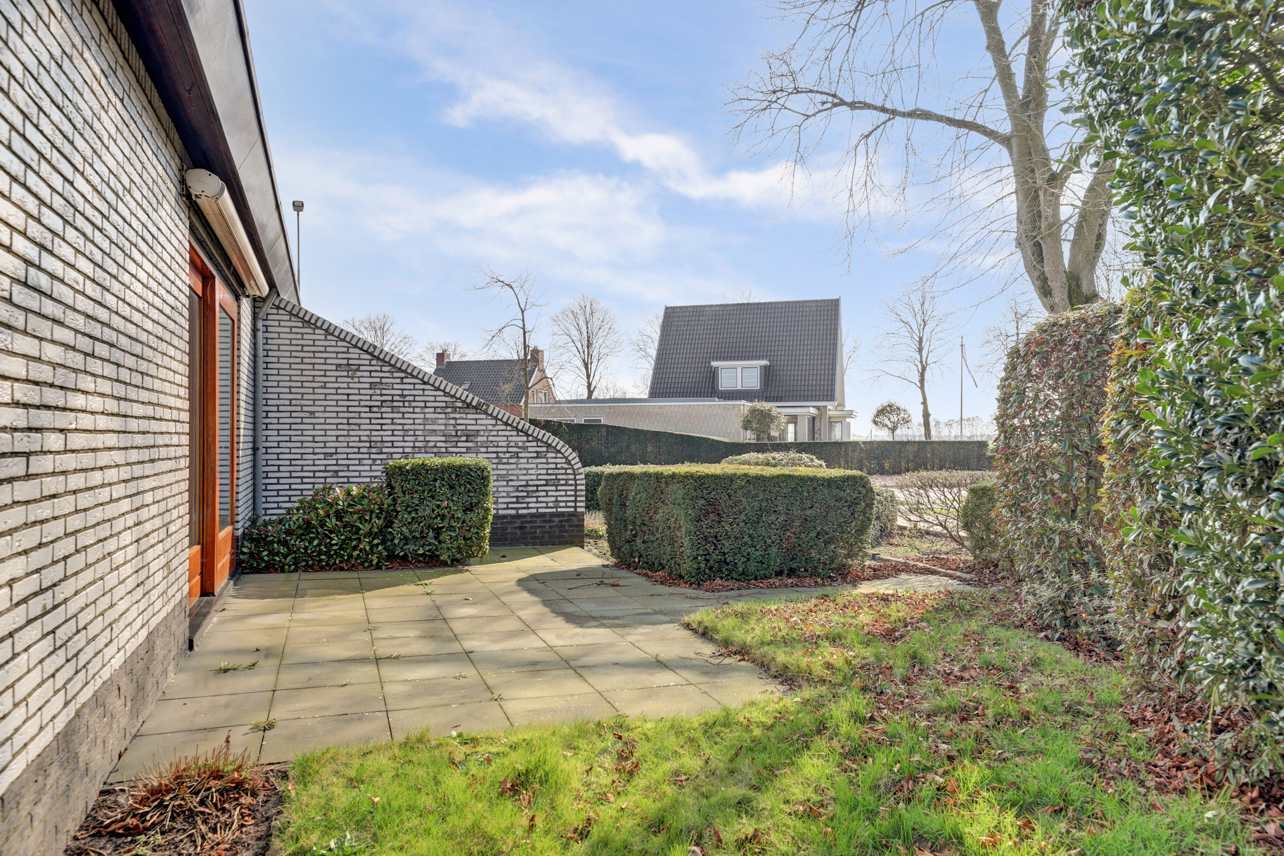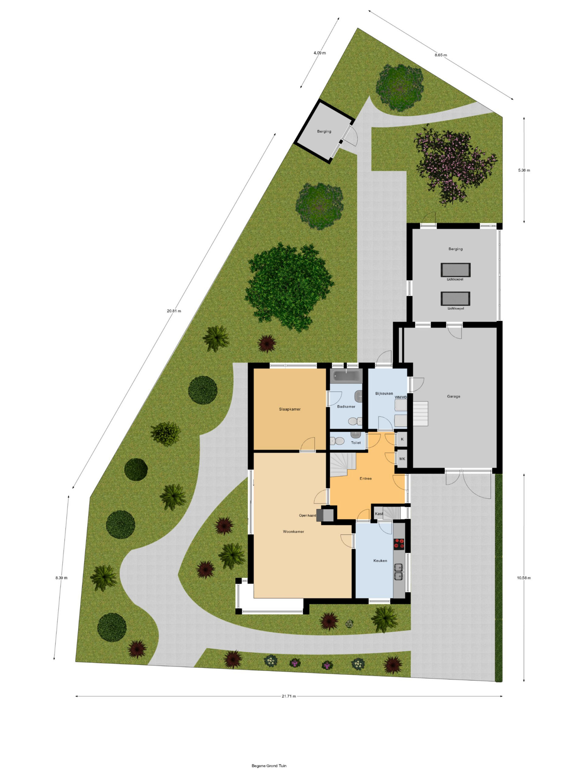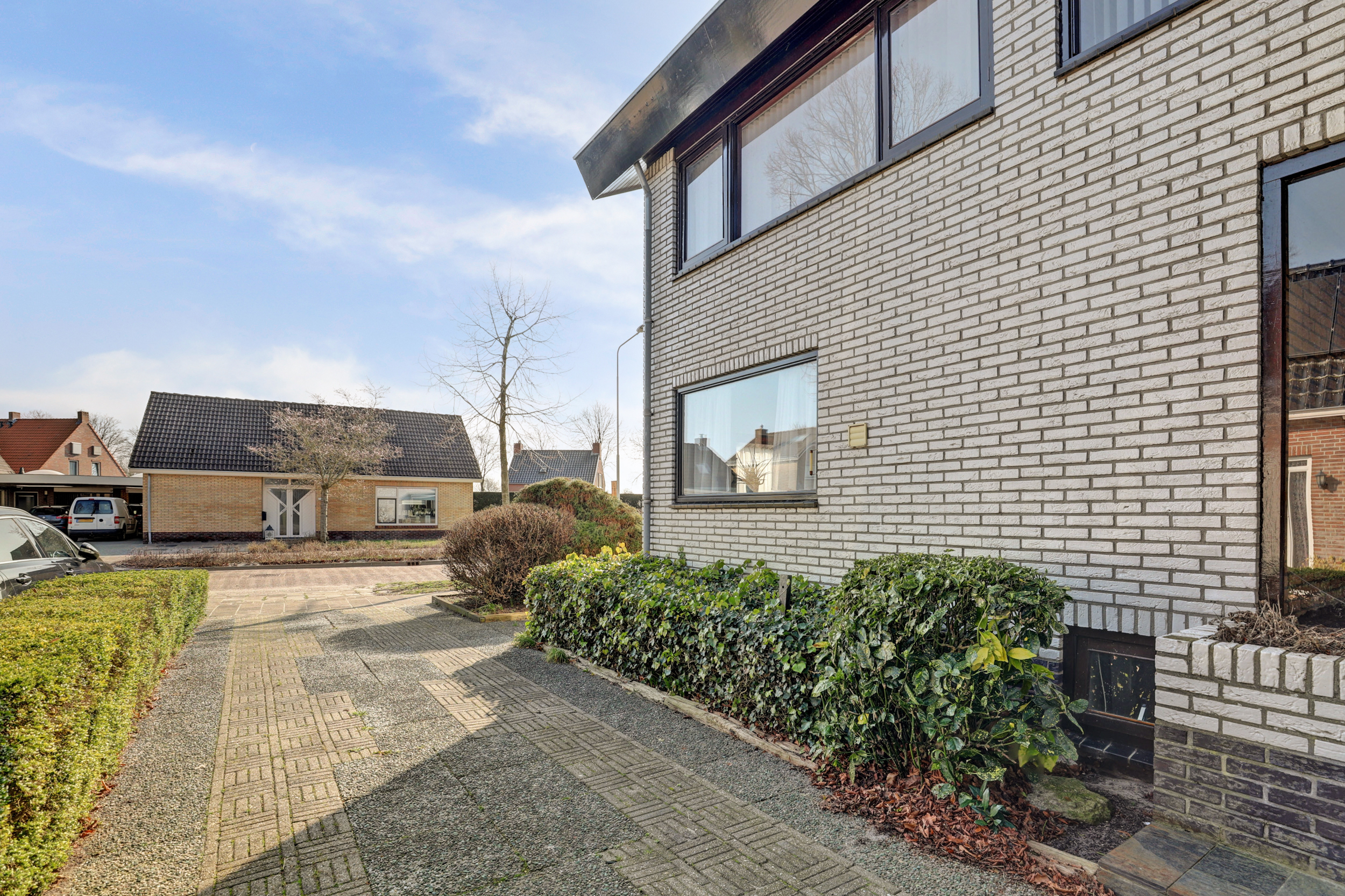 Riante bestrate oprit aan de voorzijde voor meerdere auto's. Verzorgde tuin met gazon, terras en diverse bloeiende borders en struiken, tuinhuisje en een kippenhok.
