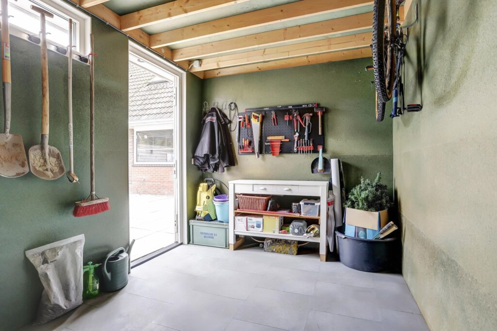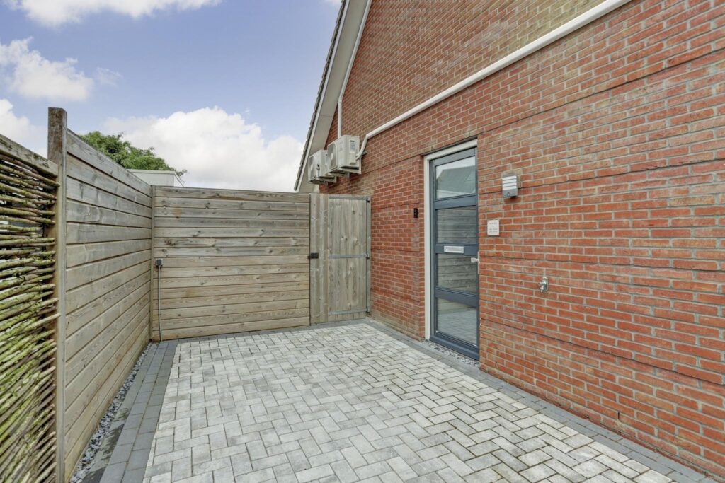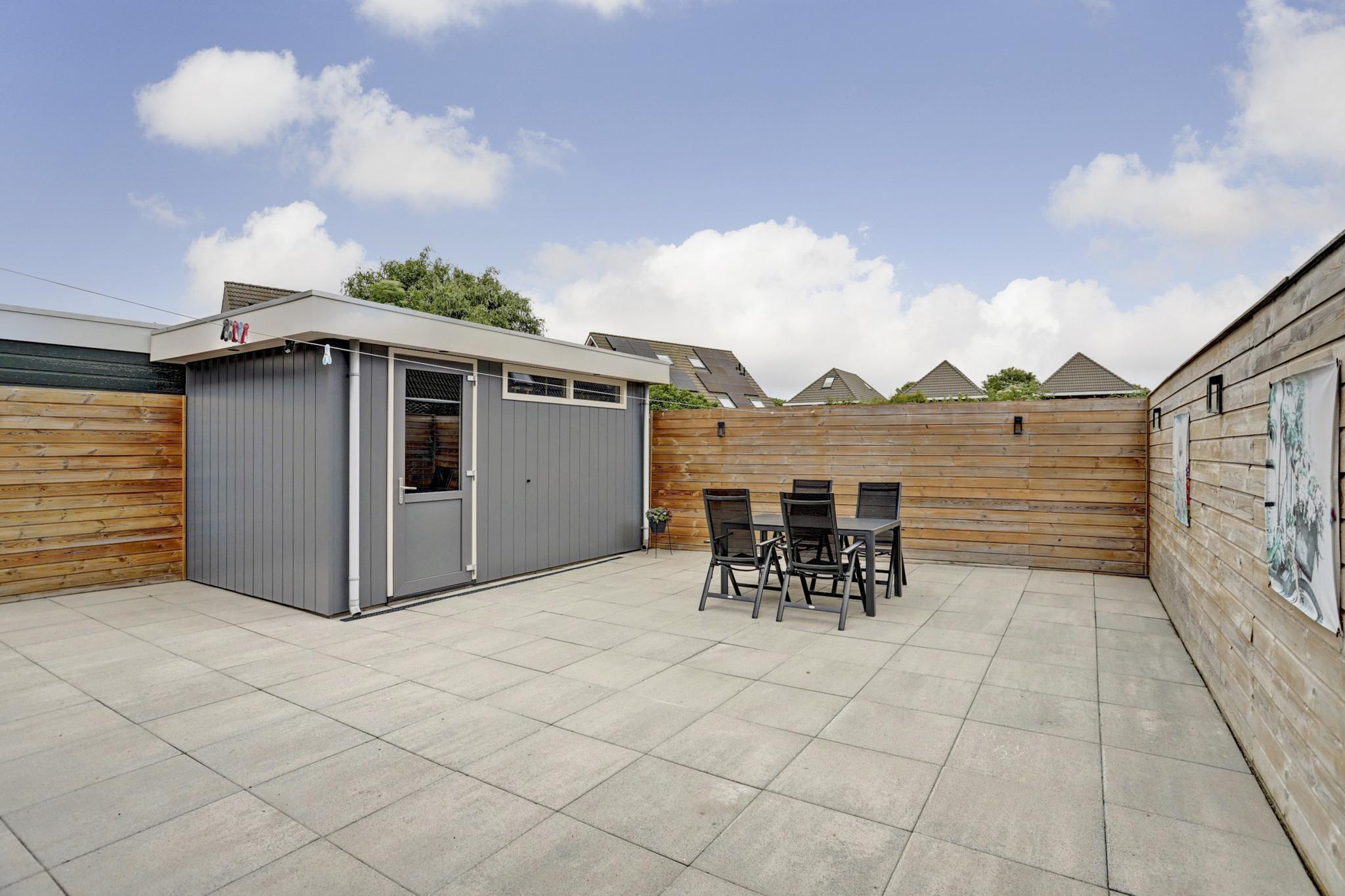 De tuin is praktisch ingericht met een groot betegeld terras. Riante hoogwaardige onderhoudsarme geïsoleerde berging met mogelijkheden voor een kantoor/praktijk. Bestrate oprit voor meerdere auto's, buitenkraan aan de voor en achterzijde. Aansluitpunt voor een laadpunt.