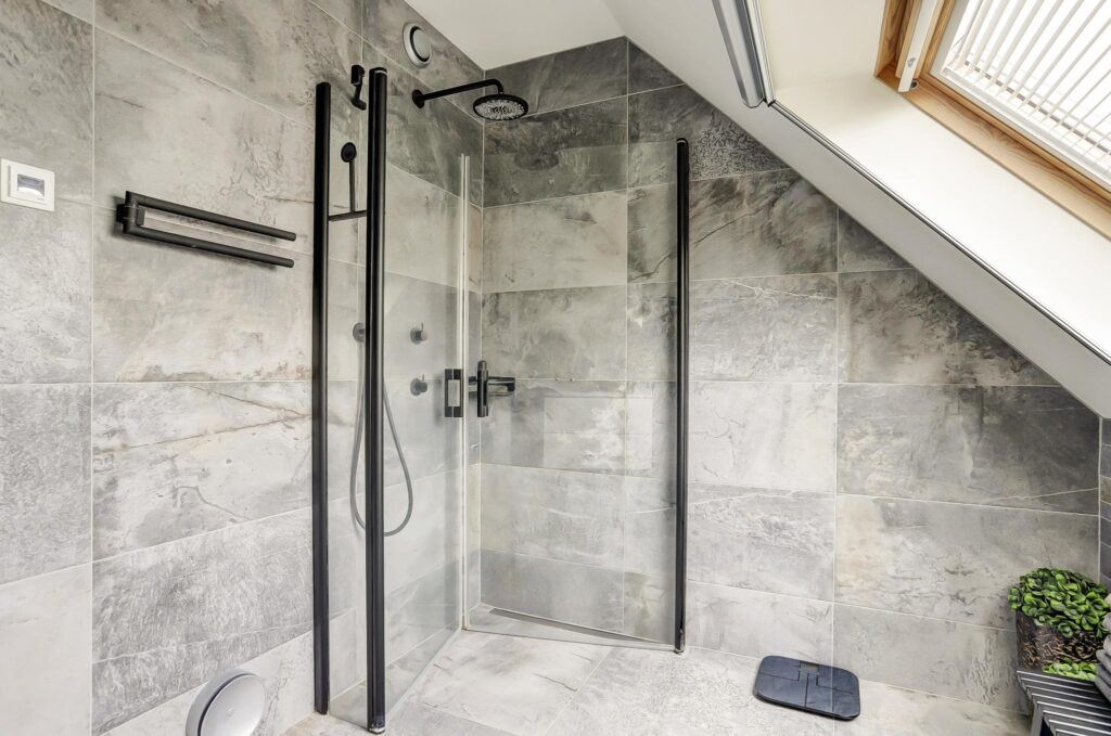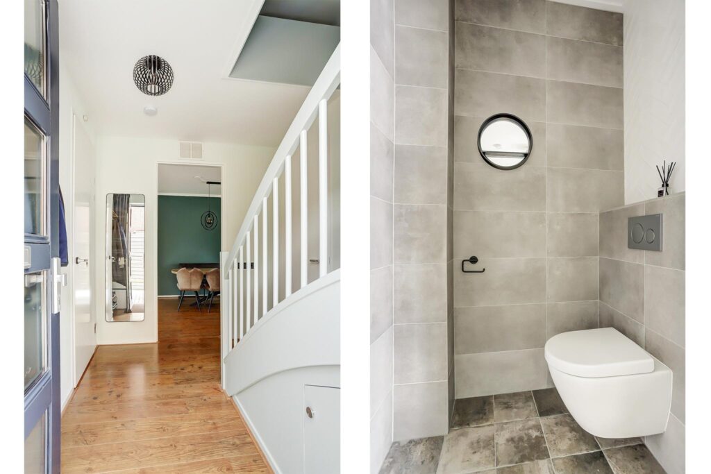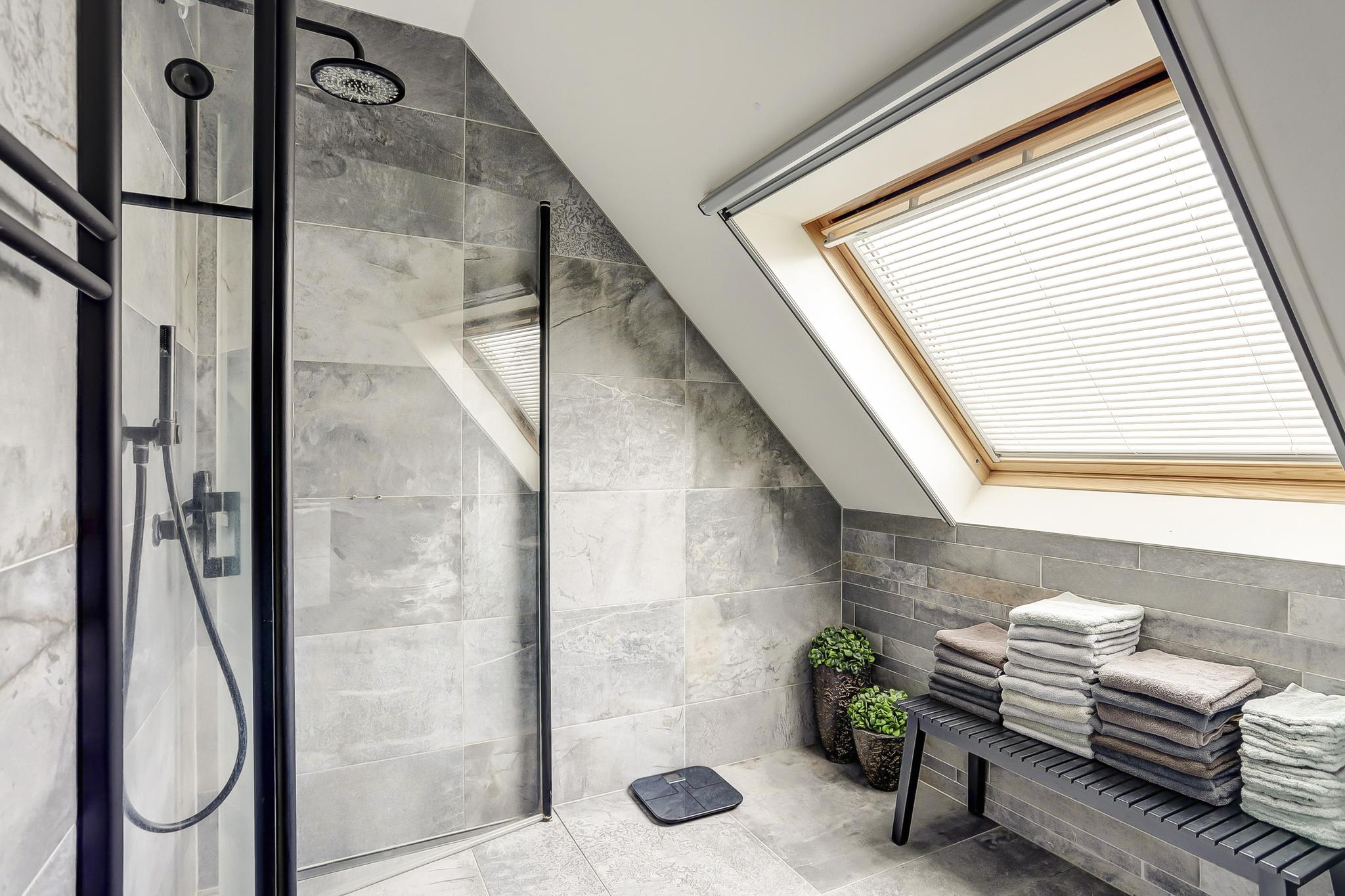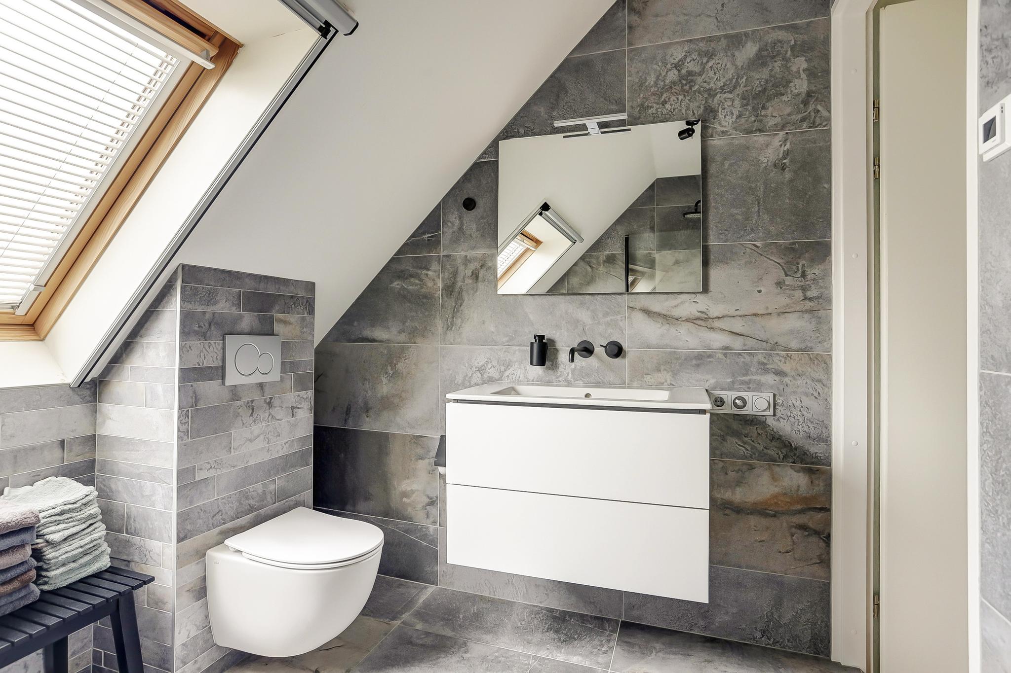 Overloop met zijraam, 3 slaapkamers en een moderne luxueuze badkamer voorzien van vloerverwarming, inloopdouche, wastafelmeubel, vrijhangend toilet, design radiator en een dakraam.