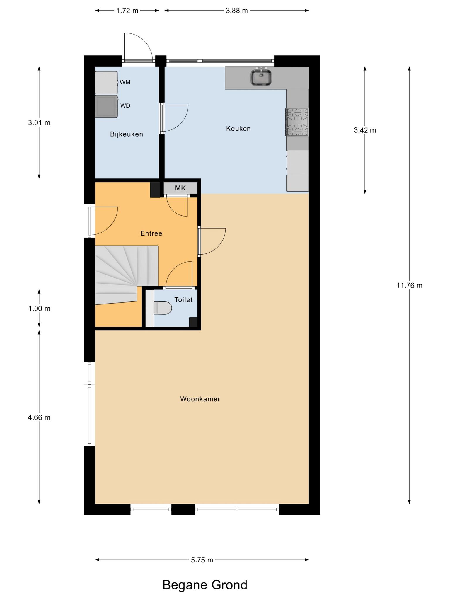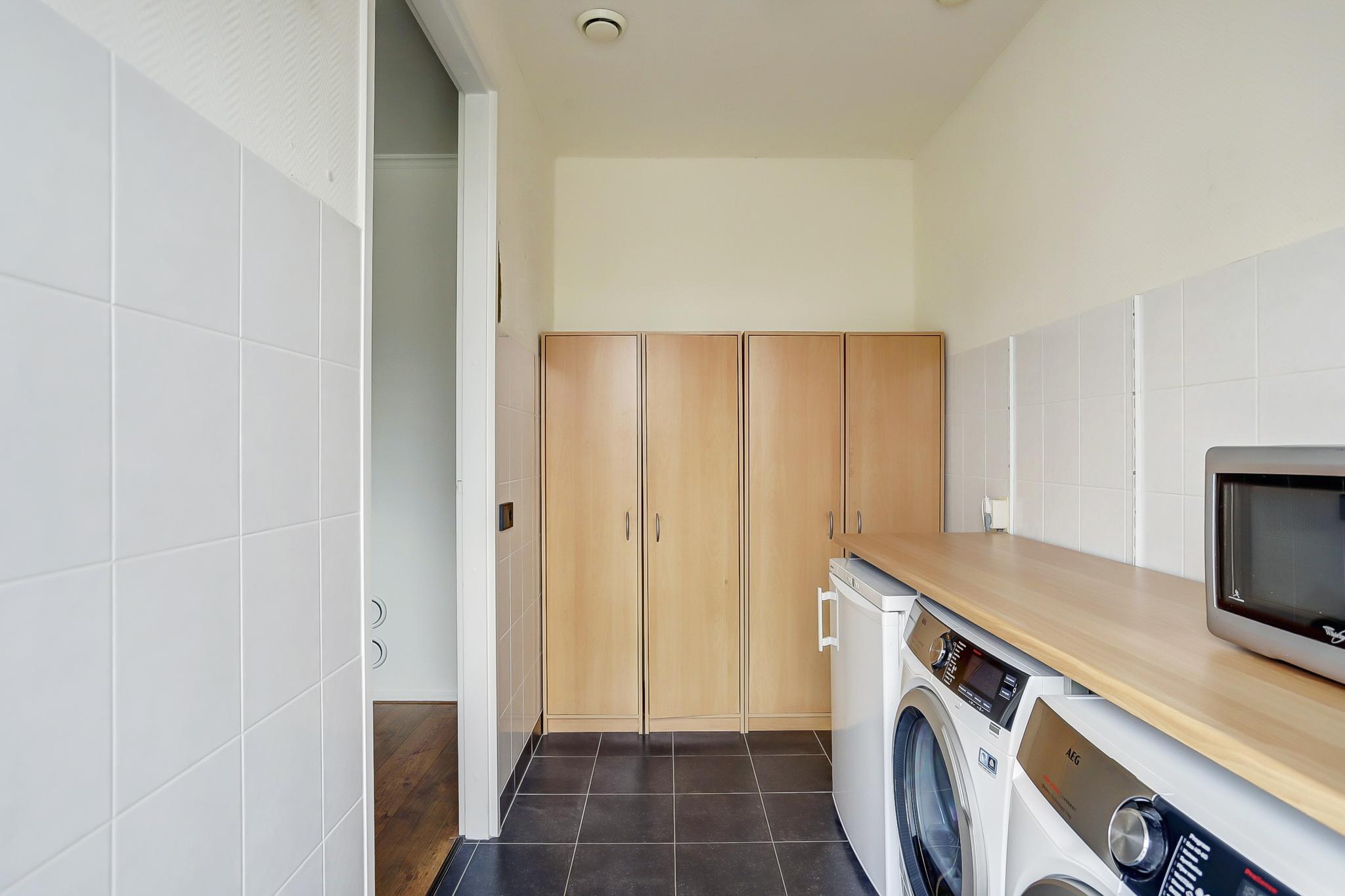 Zijentree, hal met toiletruimte, verrassend ruime woonkamer met eet/zitgedeelte en fraaie zijramen, glazenpui aan de voorzijde. L-vormige keukenopstelling met diverse inbouwapparatuur, aansluitend is een bijkeuken met voldoende bergruimte en opstelplaats ten behoeve van witgoed apparatuur en een tuindeur.