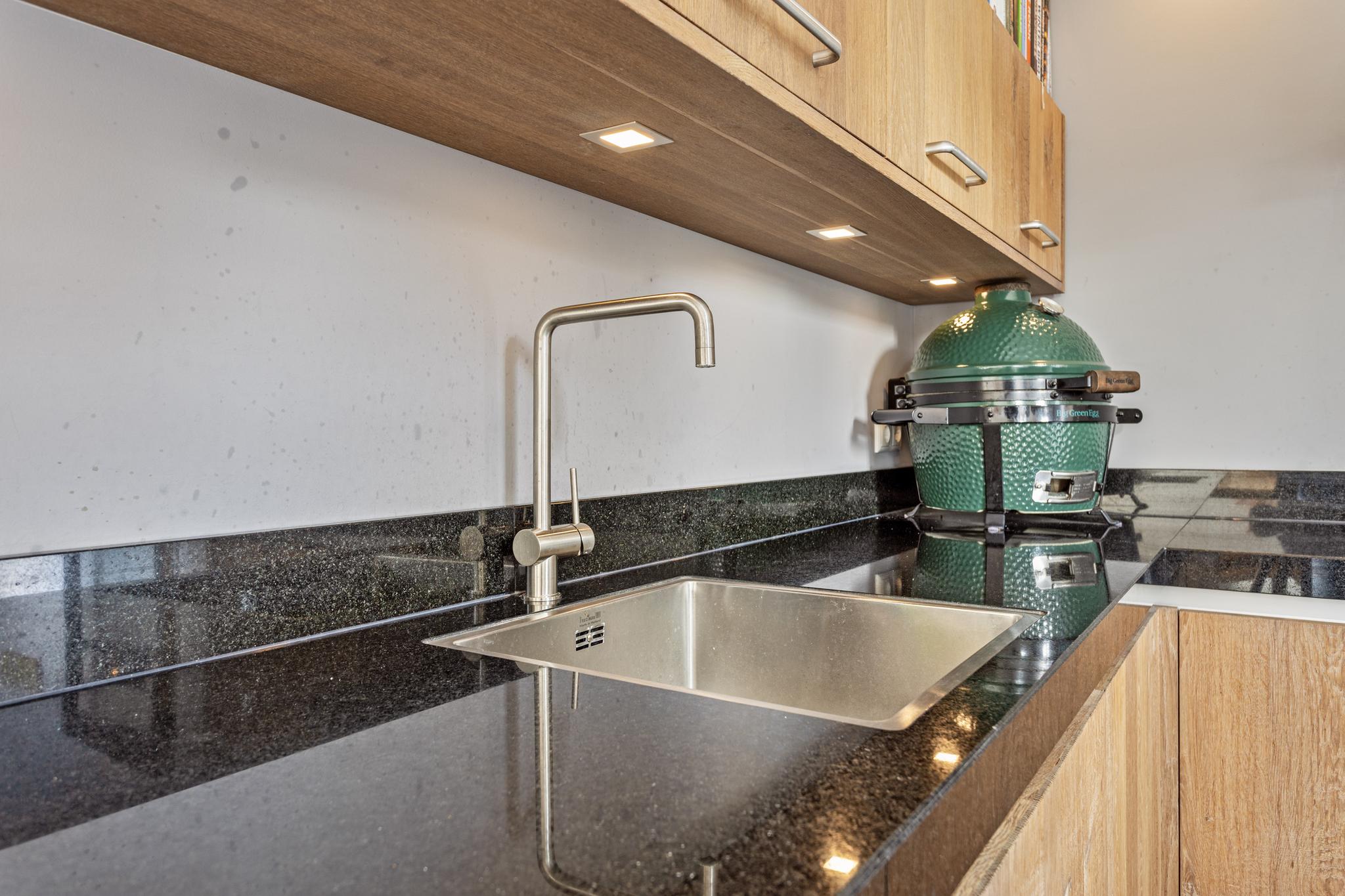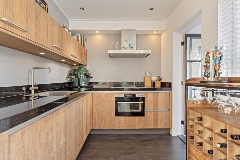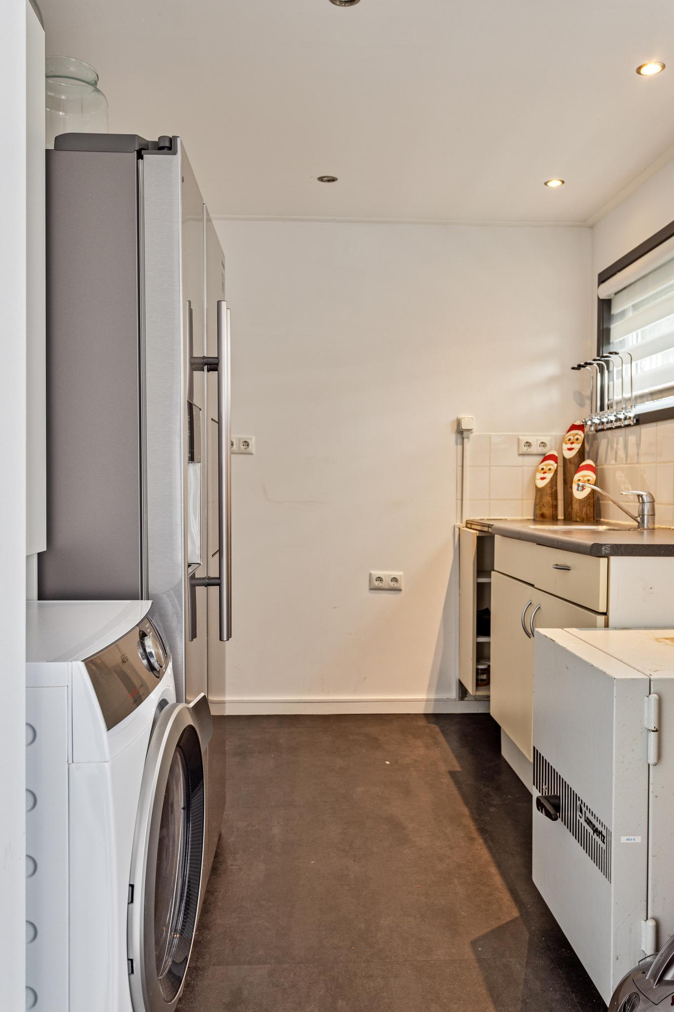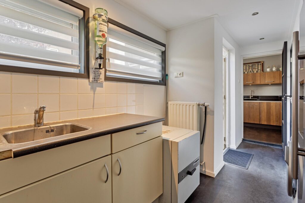 Entree, hal, uitgebreide meterkast, droge kelder, lichte woonkamer voorzien van een palletkachel, diverse spots in het plafond, l-vormige moderne keukenopstelling met korflades, granieten aanrechtblad, diverse inbouwapparatuur, waaronder een combi-oven, inductiekookplaat met afzuigkap, vaatwasser. Aansluitend is een fraaie glazen deur naar de ruime bijkeuken voorzien van dak en muurisolatie, diverse spots, bovenramen, keukenblok met spoelbak, kastruimte, opstelplaats witgoedapparatuur en koelkast, tuindeur naar het terras. De gehele begane grondvloer is uitgerust met een hoogwaardige pvc vloer.