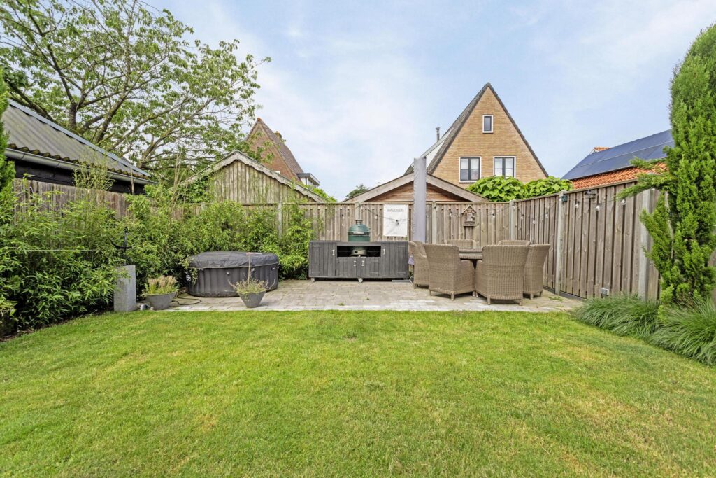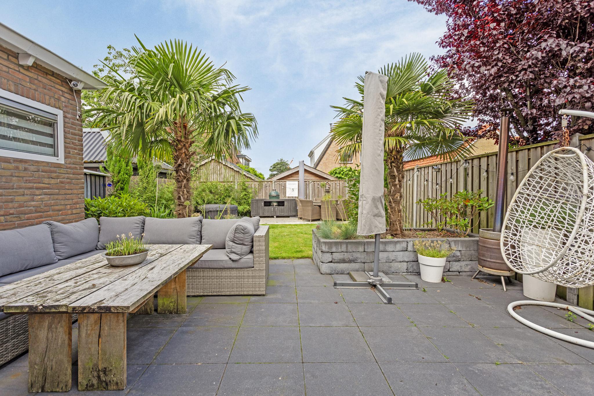 Zonnige tuin met veel privacy, bloeiende bordes, gazon, verhoogd terras aan de woning, tuinhuisje, tweede terras in de achtertuin. Ruime bestrate oprit met bloembakken in de voortuin.
