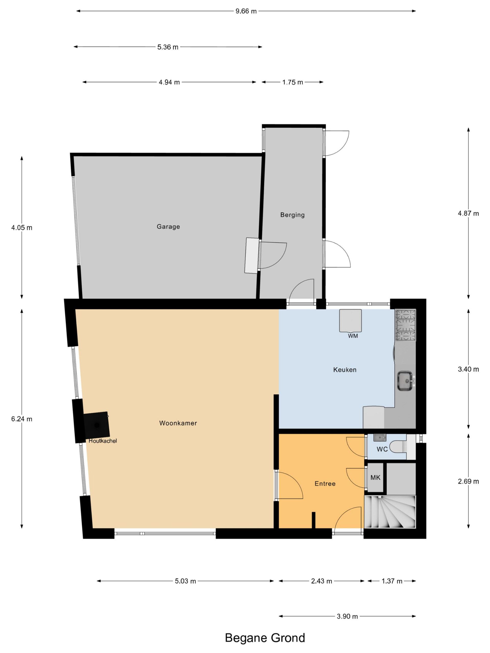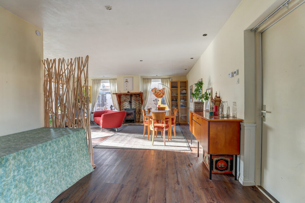 Entree, hal, toilet, ruime lichte sfeervolle woonkamer voorzien van een houtkachel (ter overname), plafond met diverse spots en een halfopen keuken inclusief apparatuur. Vanuit de woning is een toegang naar een aangebouwde berging.De berging biedt toegang naar de binnenplaats en naar de garage. De garage van ca. 20m² is uitgevoerd met een betonvloer en gelede kanteldeur.